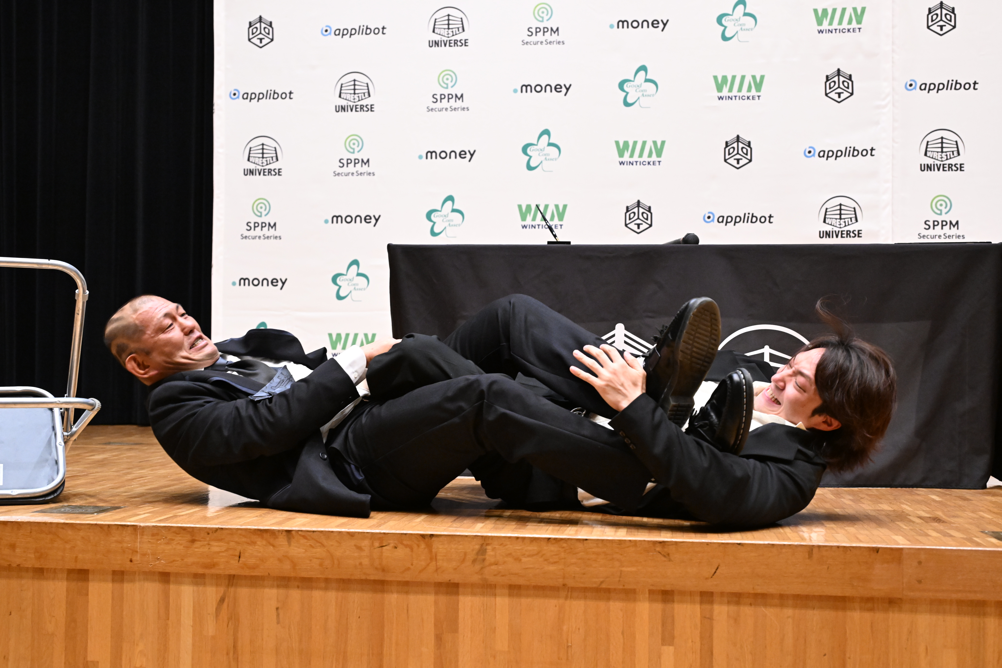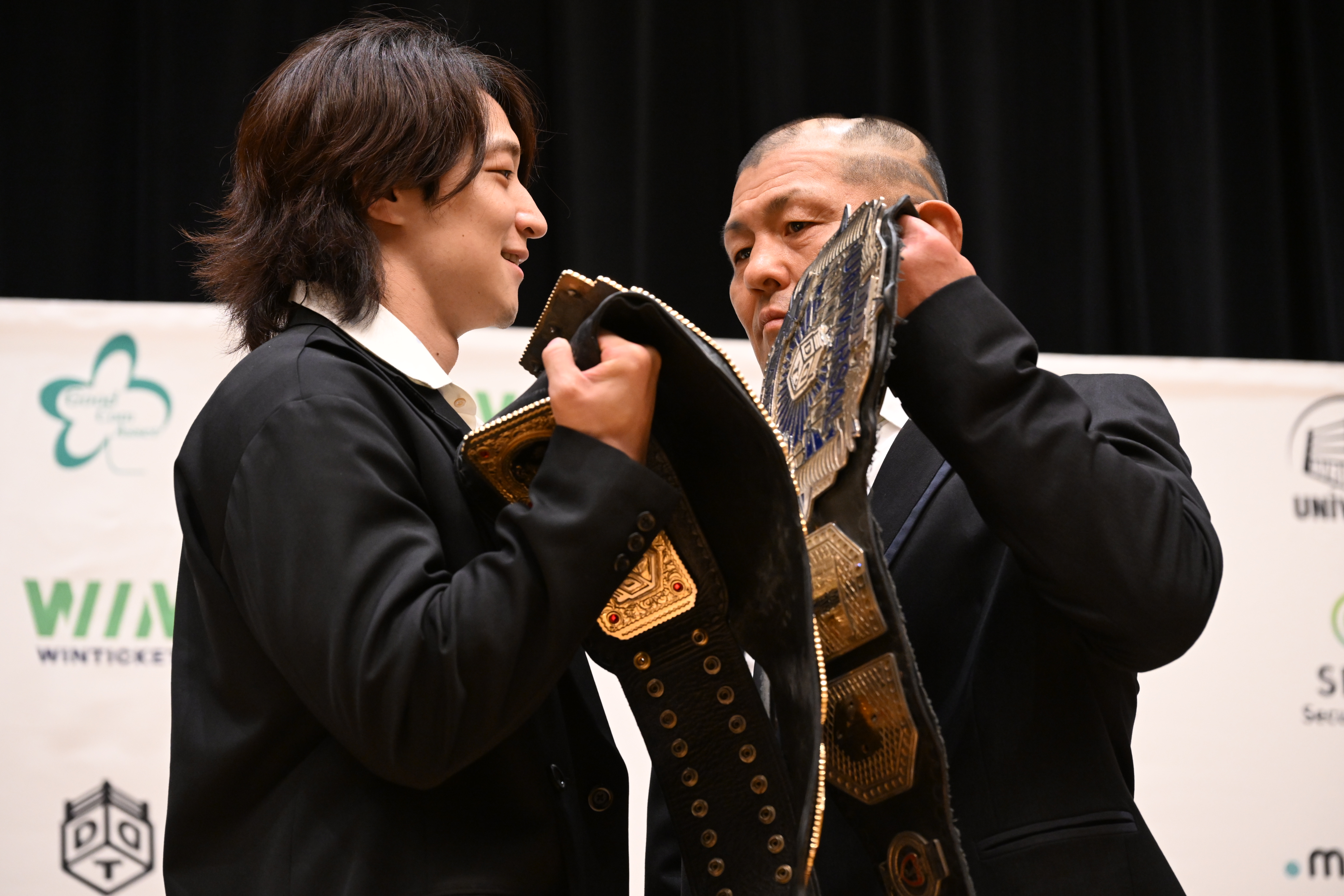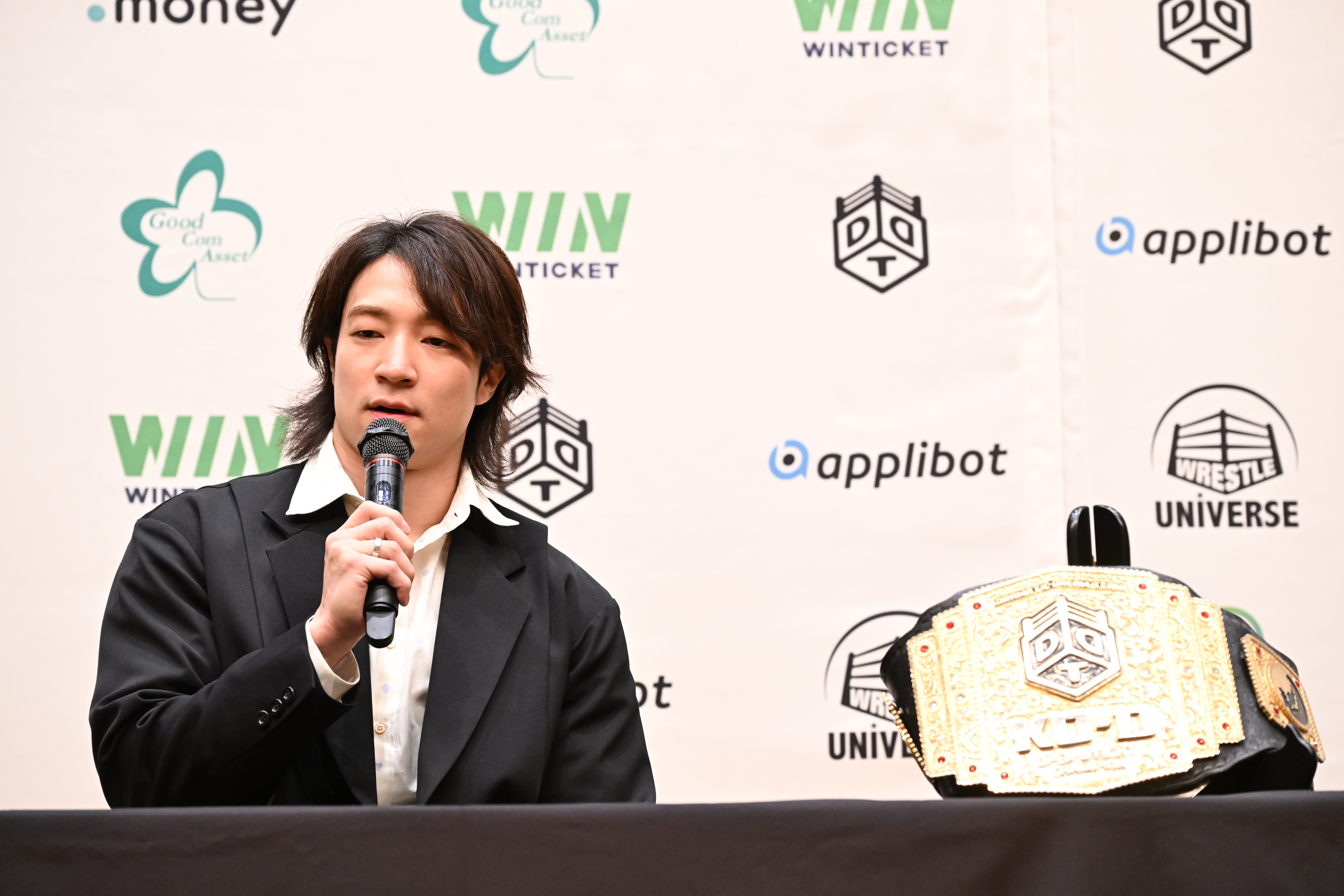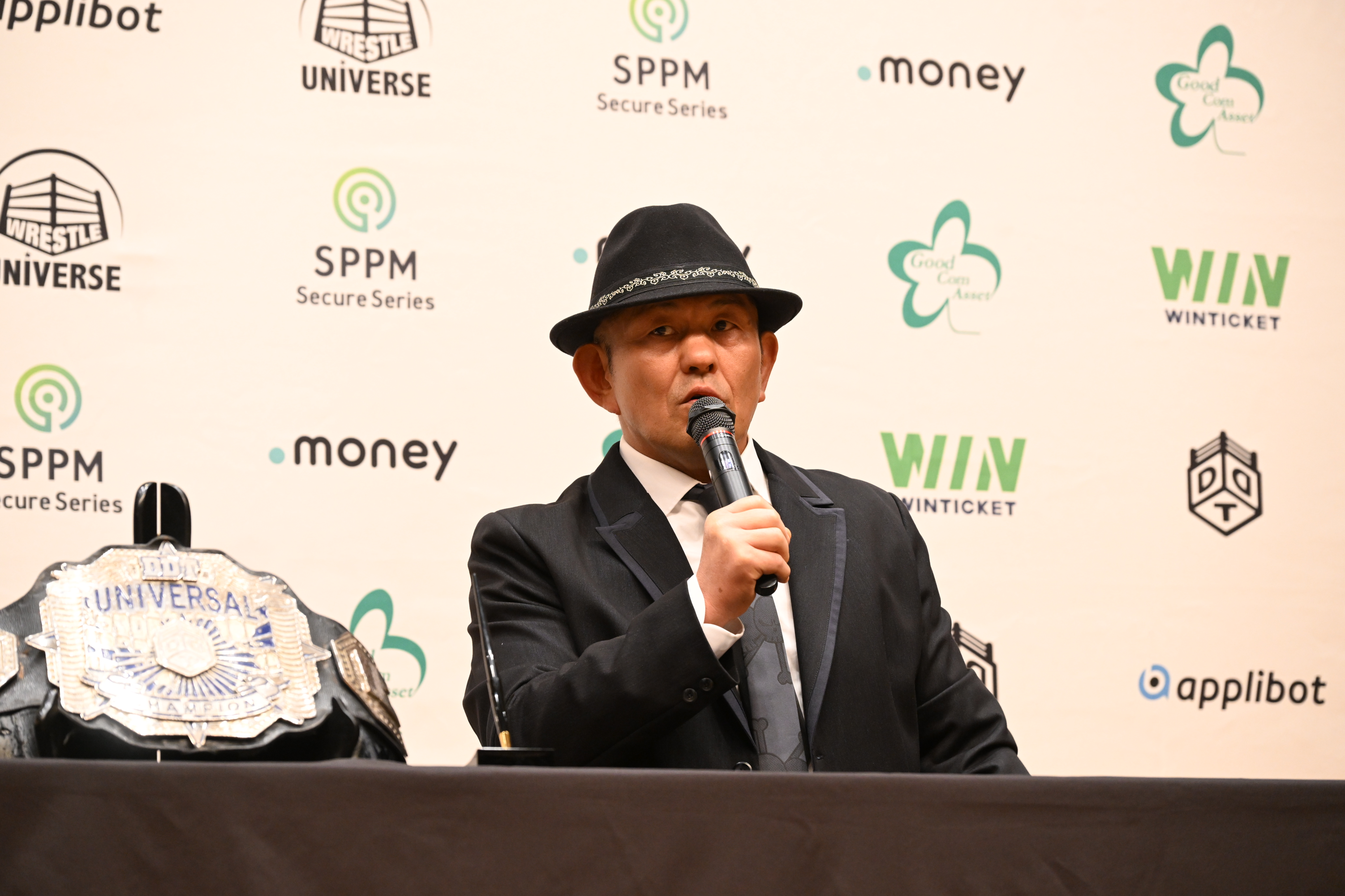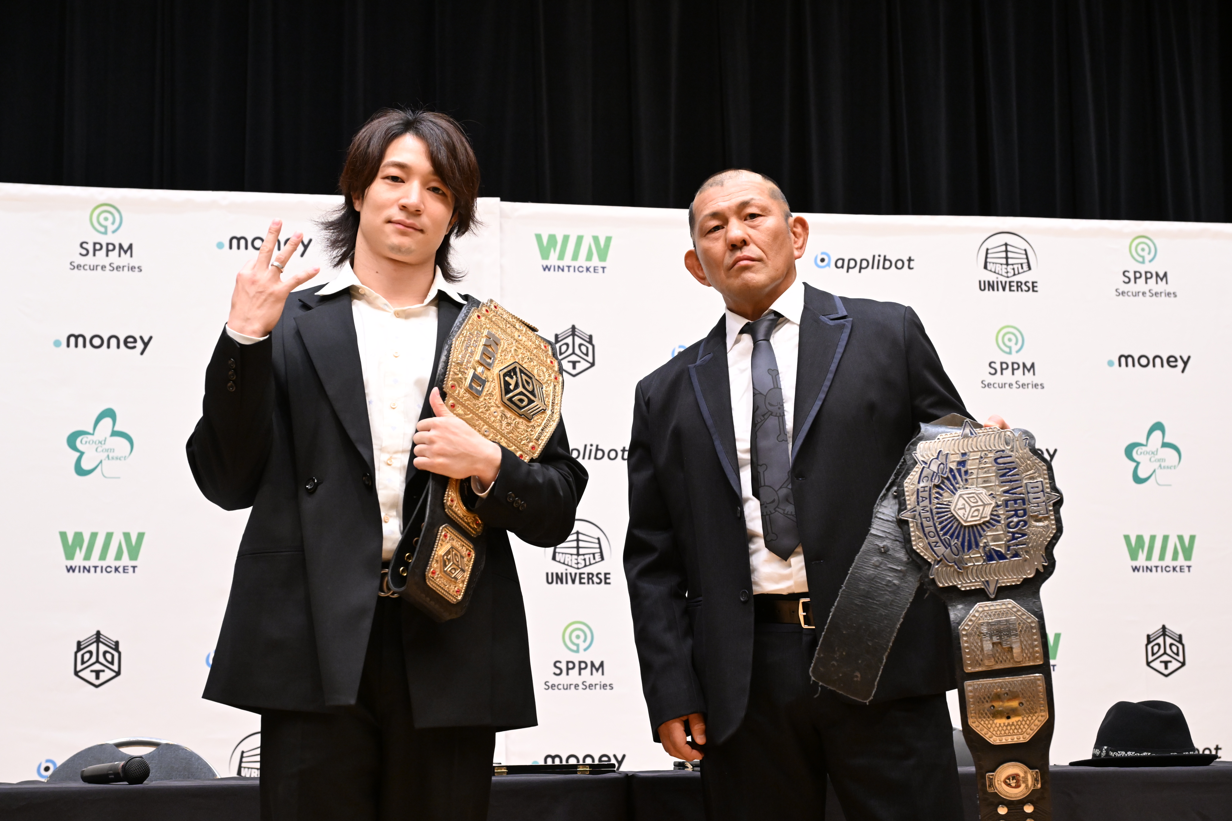 報道陣から、上野に対して「2冠王になったら、その先の未来を描いているか?」との質問が飛ぶと、鈴木は「獲ることはない」とピシャリ。上野は「UNIVERSALを獲ろうと思ったら、結果的に2冠王になるという戦いになります。2冠王になって何かするというのはまだ想像できないですから、とにかくUNIVERSAL王座を鈴木みのるから獲ります」と話した。
