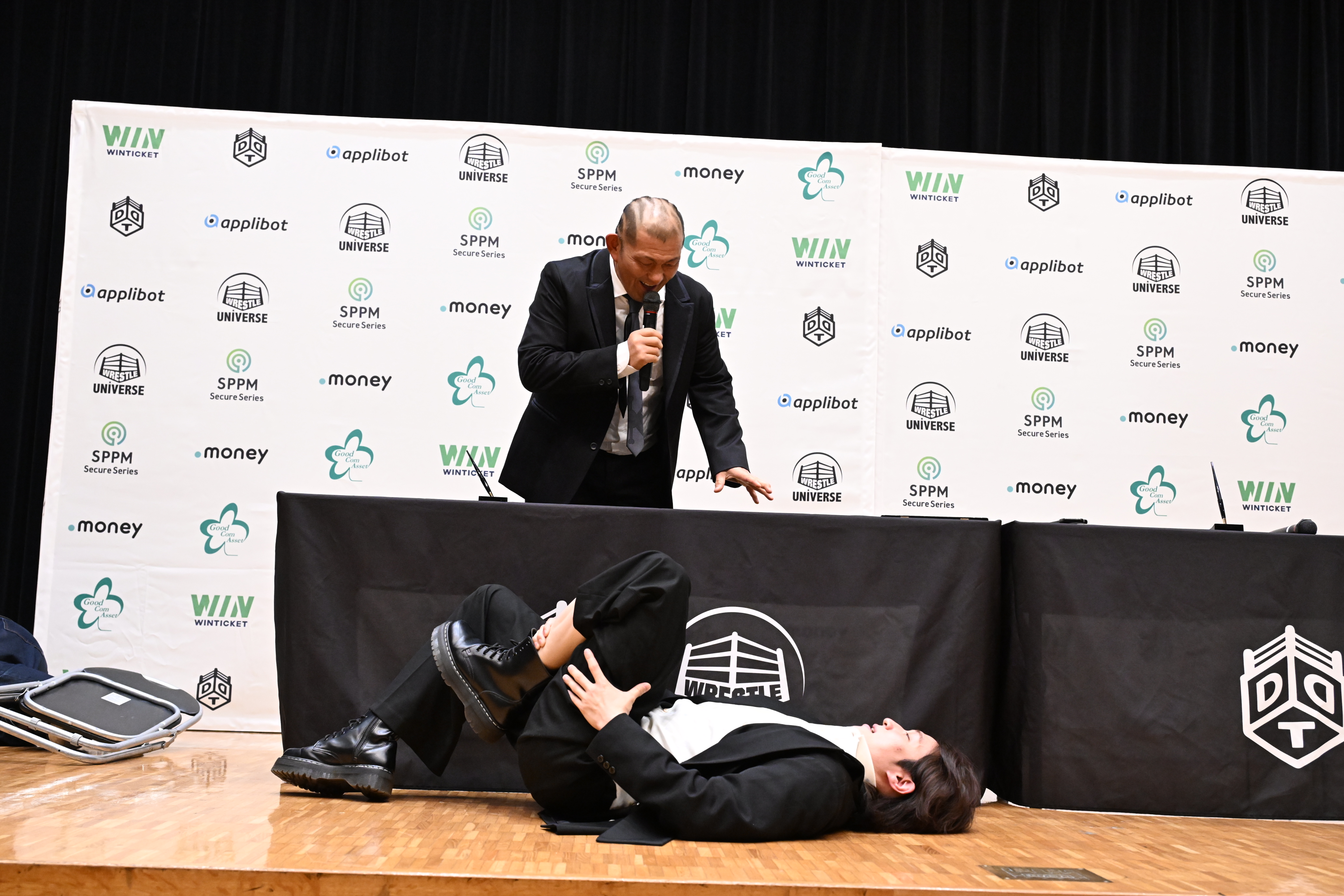 フォトセッションになると、2人は視殺戦を繰り広げ、先に退場しようとしていた上野の左足に鈴木がイス攻撃。止めに入った今林久弥GMをもイスで殴打した鈴木はヒールホールド。鈴木は慌てて制止した松井幸則、木曽大介両レフェリーにも暴行をはたらくと、「上野君、遊びましょ!」と捨てゼリフを吐いて、会見場を後にした。
