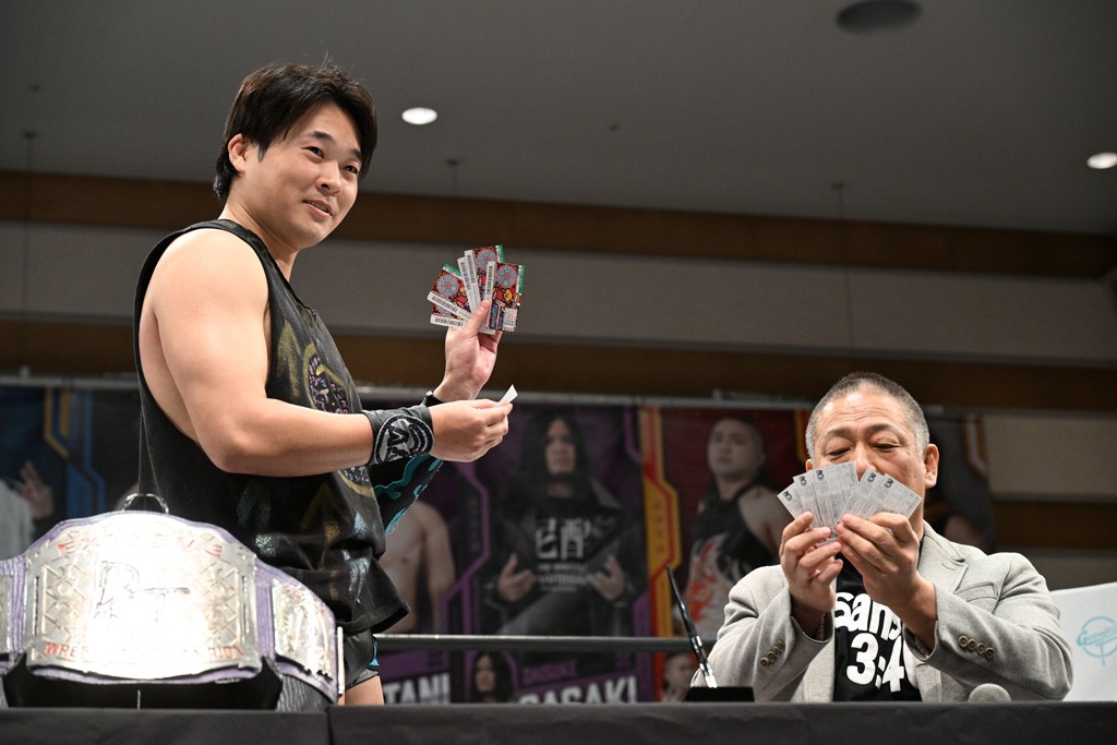 今大会開始前に同王座戦の公開調印式が行われ、髙木は「そもそもEXTREMEのルールは王者が決めるんですけど、すでにギャンブルをいくつか行ってるなかで、自分のポケットマネーが結構搾取されている。しかも領収書切るなって言われてるんで。ホントに自腹なんです。勝って今まで投資したポケットマネーを全部回収します。おまえから巻き上げます!」と意気込んだ。