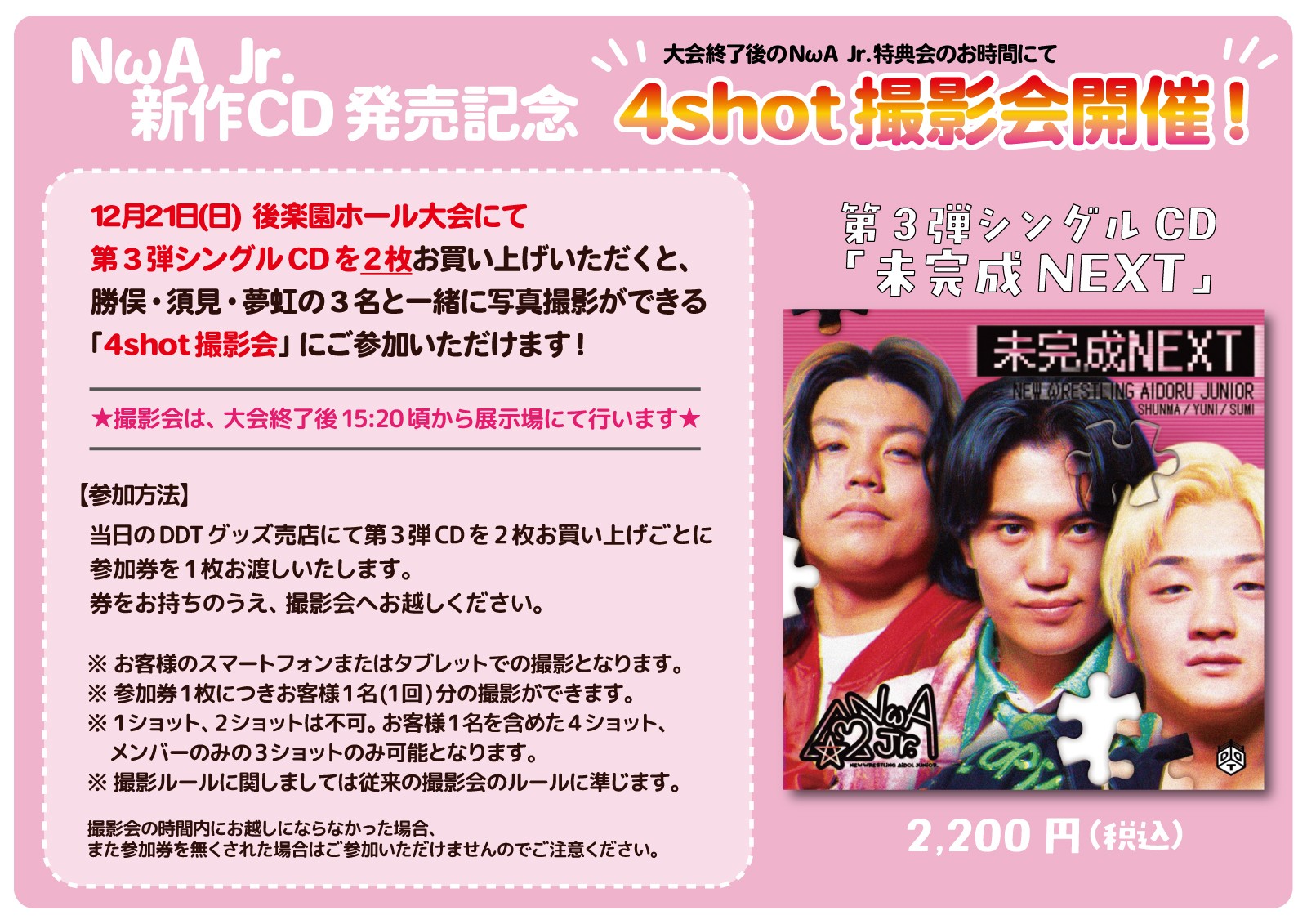 ◆全試合終了後、後楽園ホール5F展示場にてNωA Jr.が12月23日「NωA Jr. はじめてのワンマンライブ イヴイヴの奇跡 〜いつか憧れのでっかいステージへと〜」のチケット即売会を行います。15:20頃よりチケット販売を開始、16:10頃(4shot撮影会終了後)よりチケット購入者を対象としたサイン会を実施いたします(チケットへサインを入れさせていただきます)。既にワンマンライブのチケットをお持ちの方、12月21日後楽園ホール大会のチケットをお持ちでない方もご参加可能です。