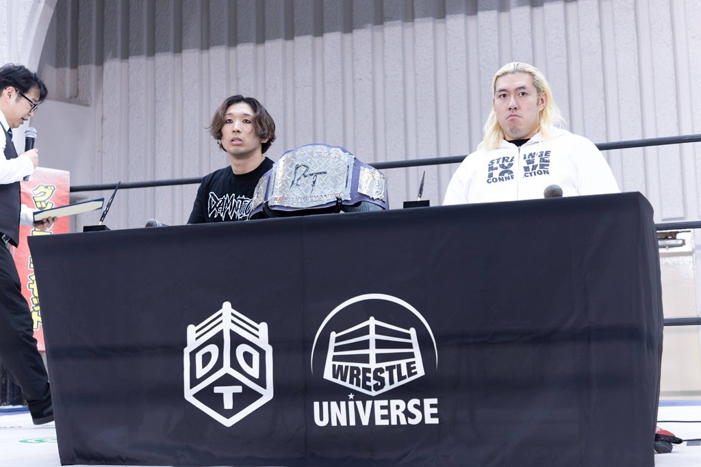 4月9日、東京・上野恩賜公園野外ステージ大会の開始前、「DREAM LIGHTS 〜水曜日のDDTどうでしょう〜」(15日、東京・後楽園ホール)でのDDT EXTREME王座戦(王者=岡谷英樹vs挑戦者=納谷幸男)の公開調印式が行われた。