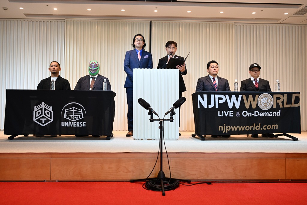 「WRESTLE UNIVERSE」PPV責任者でCyberFight取締役の彰人は「昨年初めて両団体、各配信プラットフォームを使って、同時にPPVを行ったっていうのもあって、ホントに試合以外の部分、配信チーム、スタッフの動きとか、ふだん見られないNJPW WORLDのスタッフの動きとかも見て勉強させていただきまして。やっぱり新日本プロレスさんが50年培ってきた技術ないし、ノウハウが詰まっていて、とても勉強させていただきました。もの凄く、以前より持っていたリスペクトがさらに強まる形となりました。選手もスタッフもやっぱり両団体の愛をもの凄く感じましたし、何よりテレビ朝日の野上(慎平)アナウンサー、もの凄く新日本プロレスさんへの愛を感じまして、その熱量というものをもの凄く感じました。演者以外でもスタッフの方からも愛を感じまして、何かこう両団体にとって一個の転機になって、いいものが作り上げられたんじゃないかなと思っております。今回もそのような形で両団体に何かプラスになるもの、両団体でしかできないもの、それぞれを出し合いつつ、PPVでも“両方見たい!”と思わせるようなものを仕込んでいきます。皆さん、楽しみにしててください」と話した。
