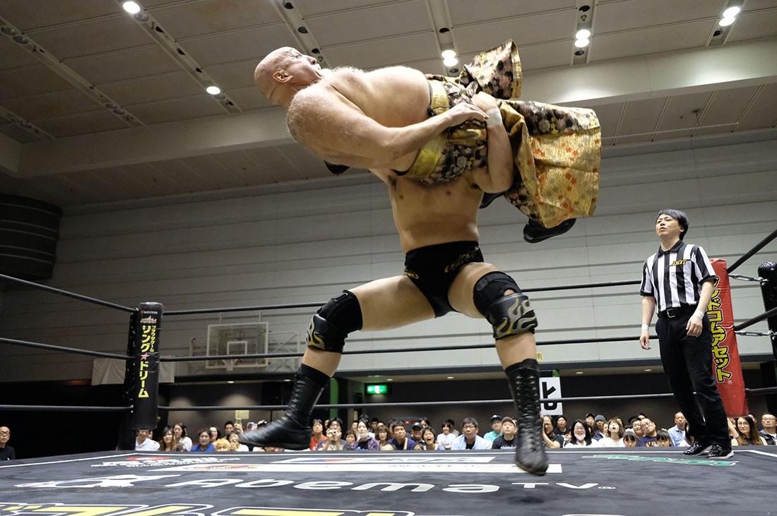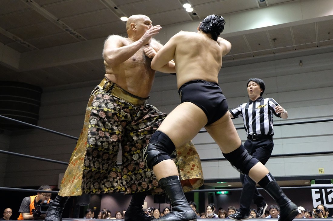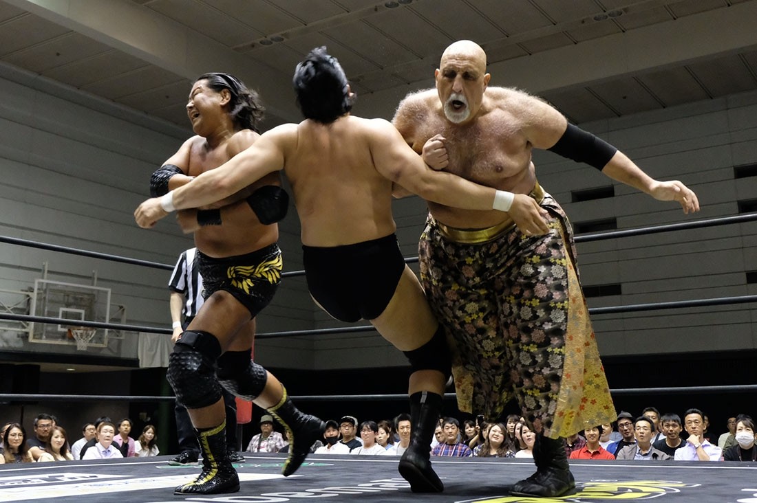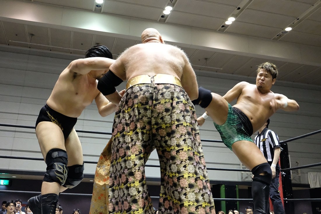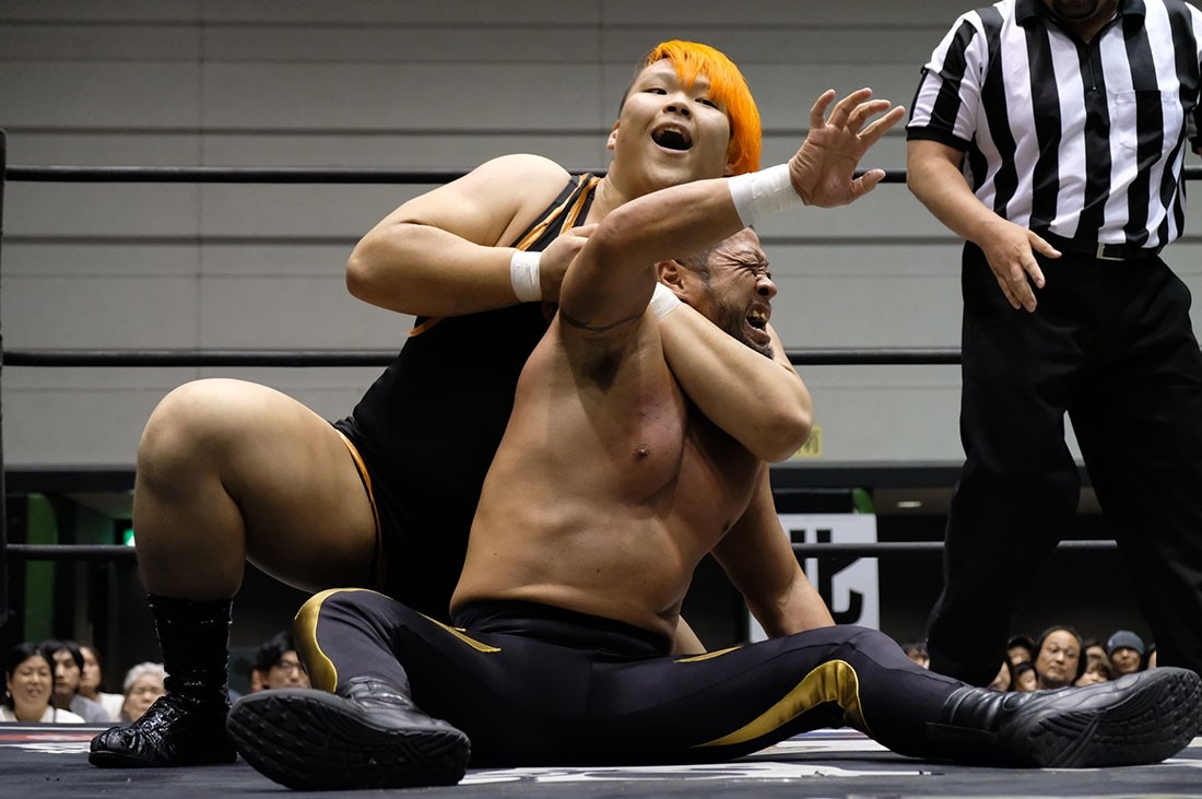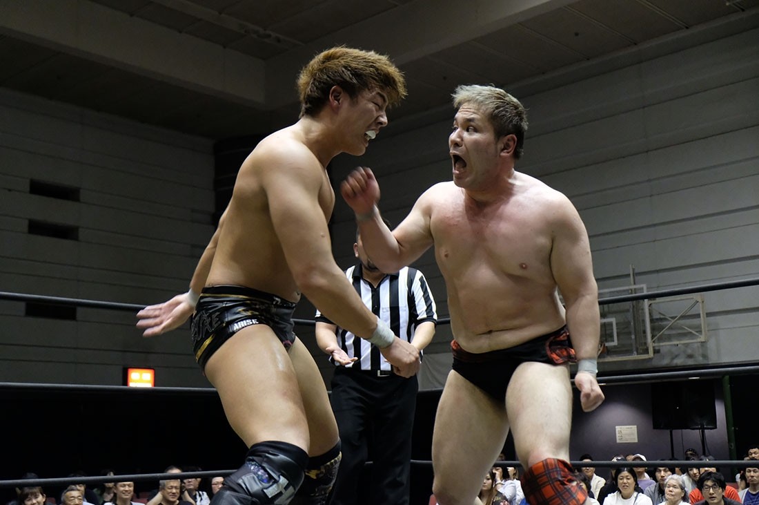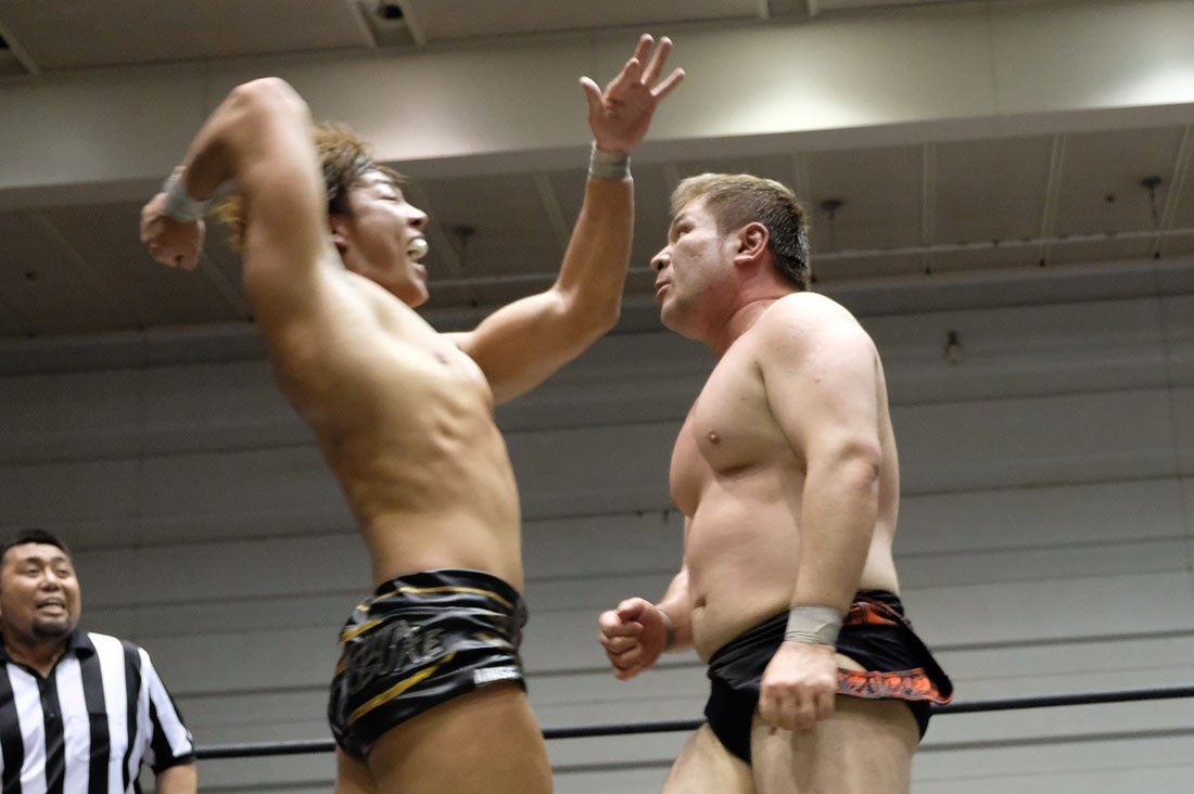 第3試合は大鷲透&星誕期vs樋口和貞&岩崎孝樹のタッグマッチ。誕期は樋口、岩崎と握手。大鷲は樋口とは握手したが、“Uの遺伝子”岩崎との握手は拒否。そして岩崎に相撲対決を要求した大鷲だが、足をすくって倒した岩崎はがっぷり四つで組んでいく。あっさりうっちゃった大鷲は、続いて樋口とも相撲対決。今度は樋口があっさり大鷲をうっちゃると、誕期が入ってきて相撲対決。エアー塩を投げ、立ち合いからぶつかり合うと、がっぷり四つから誕期が上手投げ。「ありがとうございました」と握手を求めた樋口は誕期が応じたところにガットショット。しかし誕期も岩崎をボディスラムで叩き付けて大鷲にタッチ。サッカーボールキックからブレーンバスターを狙うが、背後に逃れた岩崎はフロントキック。大鷲も逆水平チョップを返すが、岩崎はミドルキックで応戦。岩崎がブレーンバスターで投げると、樋口はオクラホマスタンピート。大鷲も樋口とチョップ合戦を展開するとビッグブーツを返して誕期にタッチ。コーナースプラッシュからブレーンバスターで投げた誕期だが、岩崎が入ってきてトレイン攻撃。これをかわして大鷲が樋口に串刺しラリアット。さらに誕期とダブルタックル。誕期は樋口と岩崎をまとめてのど輪落としで投げようとするが、防御した樋口&岩崎はダブルのドロップキック。樋口は誕期を持ち上げようとするが、リバースで切り返した誕期はラリアット。相打ちに持ち込んだ樋口は、そこからでラリアットでなぎ倒すとドクターボムで誕期の巨体を叩き付けて3カウント。