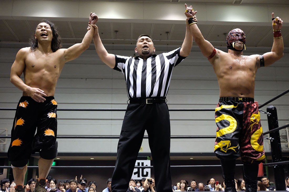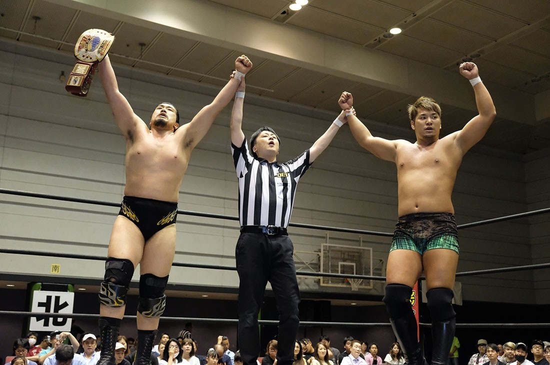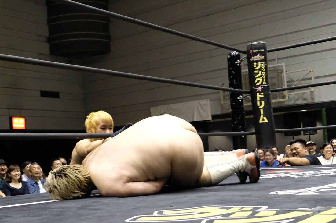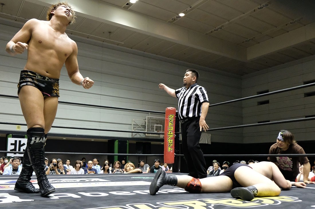 大人気なくベルトを奪った赤井からベルトを取り上げようとする大石。赤井はビッグブーツを叩き込むが、2発目をかわした大石が丸め込んでアイアンマンを奪回した。その後、本部席ではトランザム★ヒロシがASKAの『MY Mr.LONELY HEART』をアカペラで歌って締めくくった。