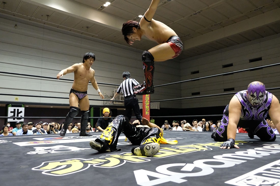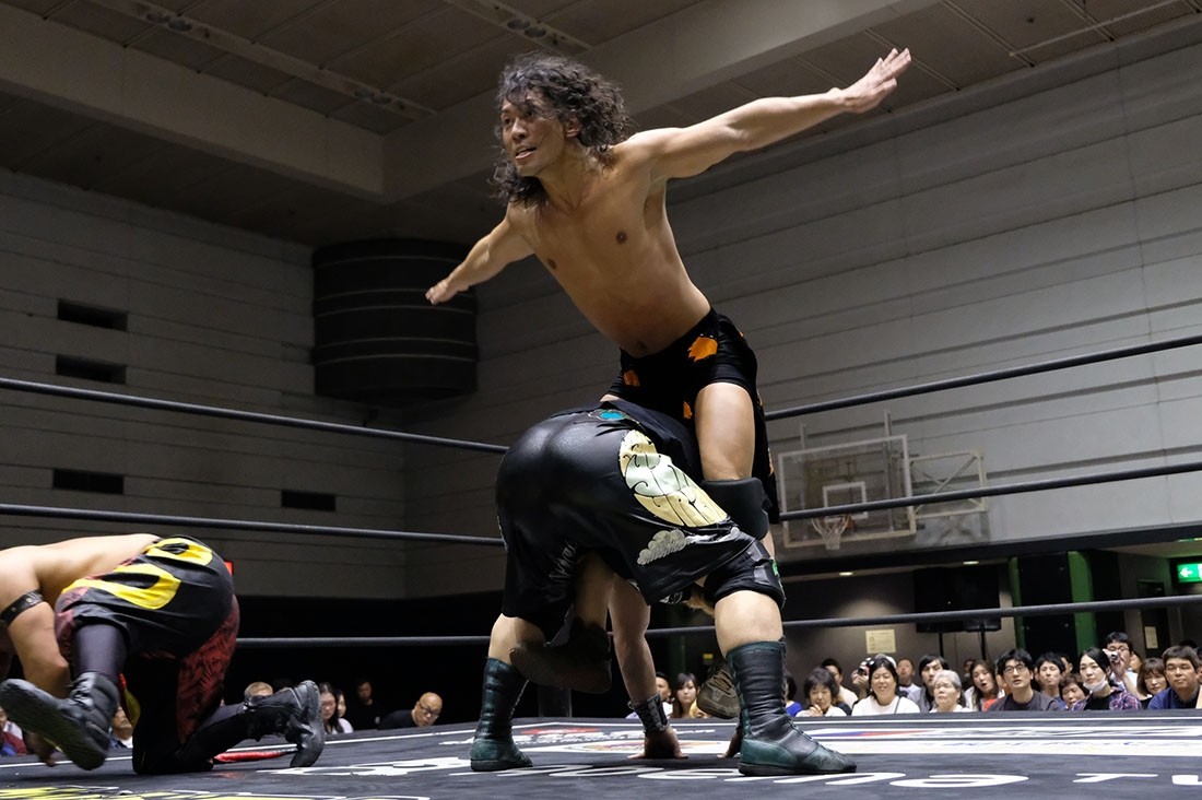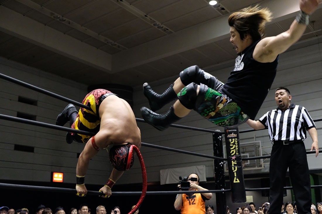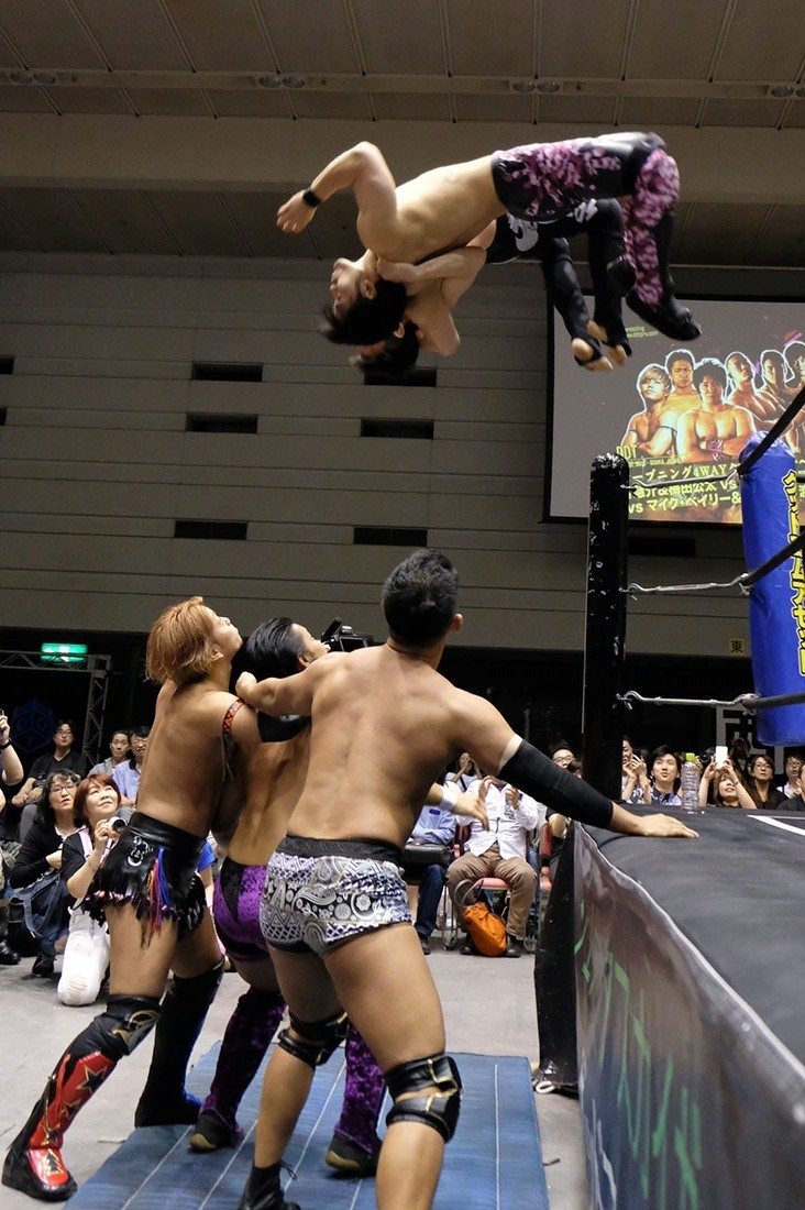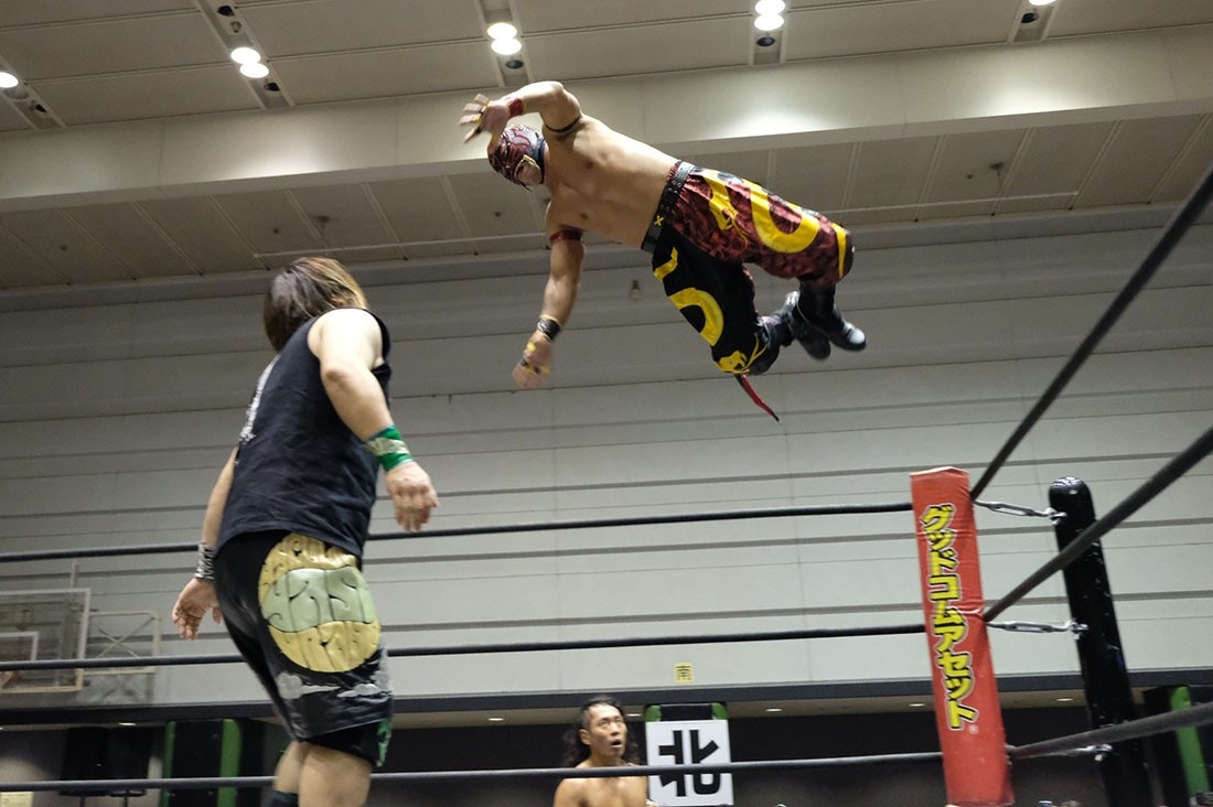 第4試合はHUB&高梨将弘vsヤス・ウラノ&MEN’Sテイオーのタッグマッチ。HUBが握手を求めるが、テイオーは尻尾と握手。腕を取って捻り上げたテイオーだが、ヘッドシザースで切り返したHUB。テイオーは倒立から脱出すると、ウラノにタッチ。高梨をロープに押し込んで離れ際にチョップを見舞ったウラノだが、これに怒った高梨が羽交い締めにすると、HUBが尻尾で殴打。テイオーが高梨のボディにエルボーを打ち込むと、ウラノもボディへのエルボードロップで続き形勢逆転。ウラノはバンダナで高梨を殴打してからガットバスター。さらに左腕を固めていくが、高梨はチンクラッシャーで脱出。HUBがダイビング・クロスボディーからブラックマジック。ウラノのピンチをテイオーがうまくアシストして救うと、テイオーはHUBの尻尾を使ってHUBを殴打。さらに滞空時間の長いブレーンバスター。ウラノもブレーンバスターの体勢からHUBをトップロープに乗せてドロップキック。テイオーはワンハンドバックブリーカーからテキサス・クローバー・ホールド。これを高梨がカットすると、ウラノも入ってきてトレイン攻撃。だが、かわしたHUBは後頭部への二ーを返して高梨にタッチしようとする。それを阻止したテイオーは連続で丸め込む。HUBも切り返していくが、お互いにカウント2。テイオーは丸め込んできたHUBをテキサス・クローバー・ホールドに捉えるが、これも高梨がカット。HUBはウラノにスタンディングのシャイニング・ウィザードを返して高梨にタッチ。ウラノの足をすくってドロップキックをテイオーに誤爆させた高梨はトラースキック。キャッチした高梨はHUBの尻尾攻撃からスクールボーイ。カウント2で返したウラノだが、高梨はタカタニックの体勢に。テイオーが入ってきて高梨をダブルアーム・スープレックスで投げると、ウラノがボディプレス。ツームストンを狙ったウラノだが、高梨が逃れるとHUBが飛び込んできてシャイニング・ウィザード。すかさず高梨がトラースキックからタカタニックを決めて3カウント。