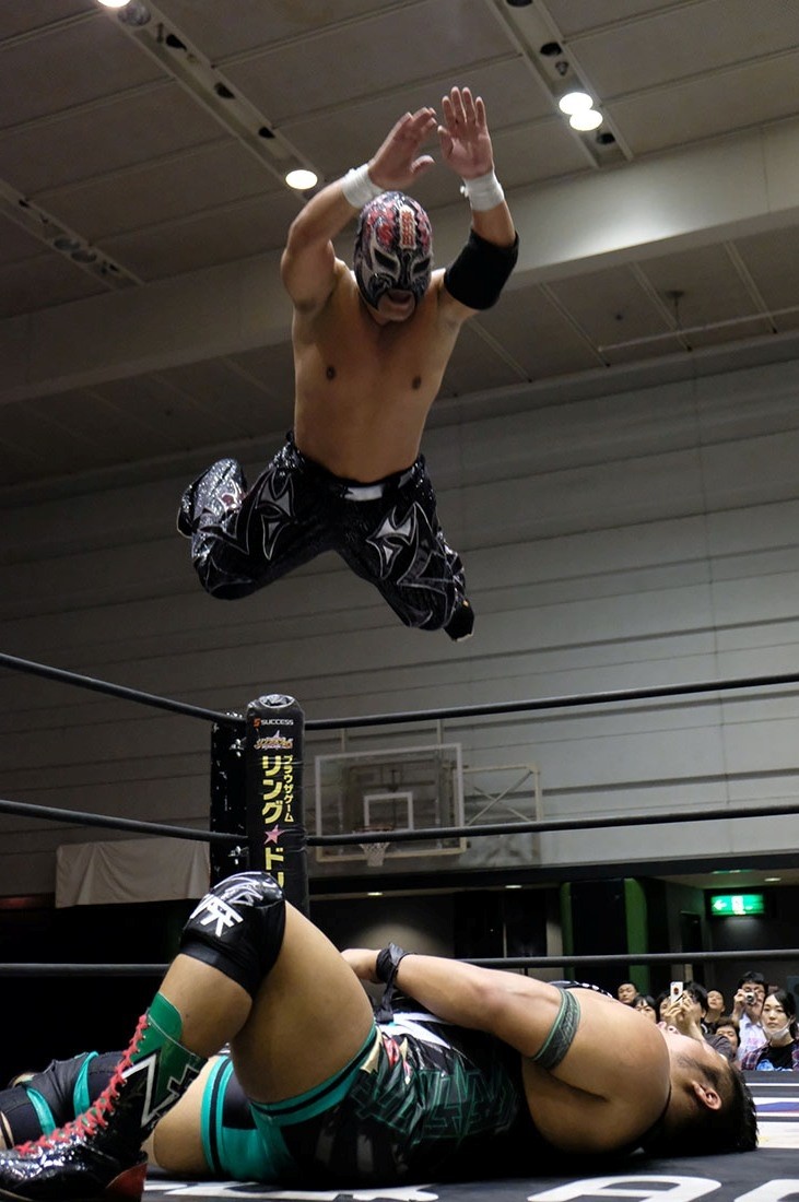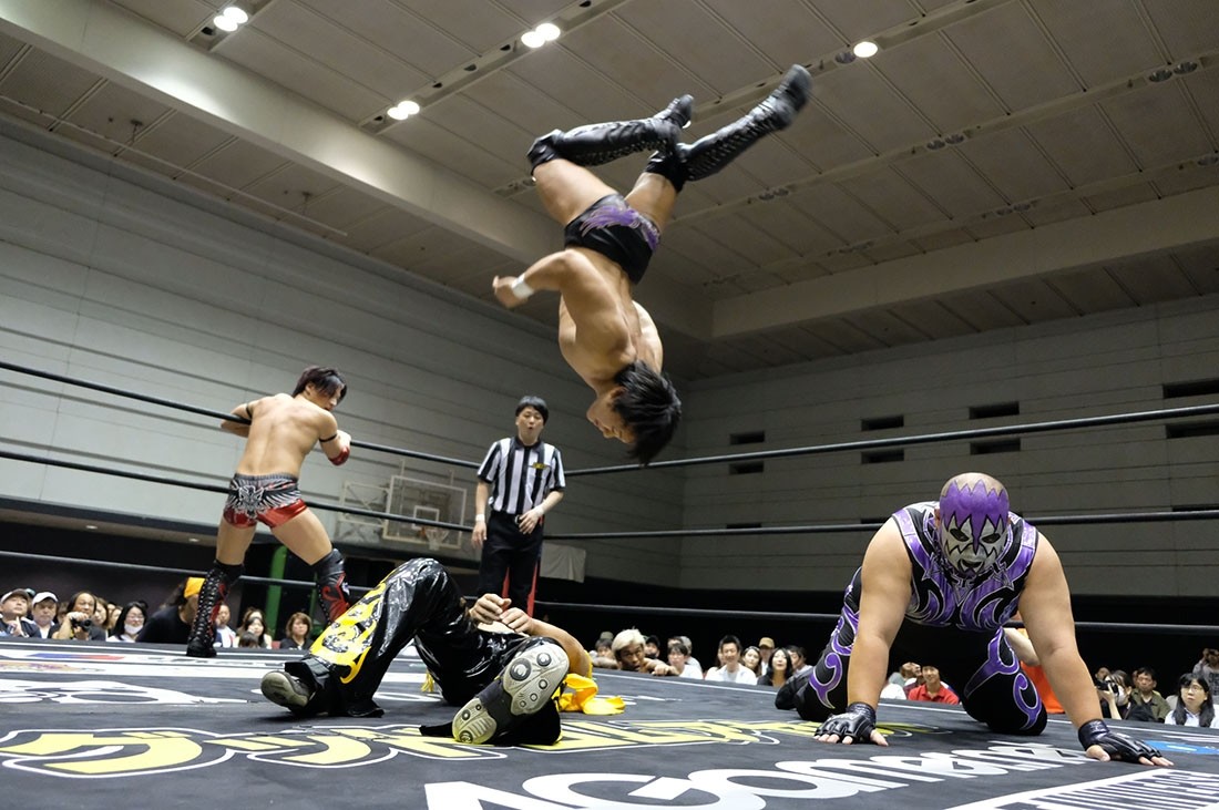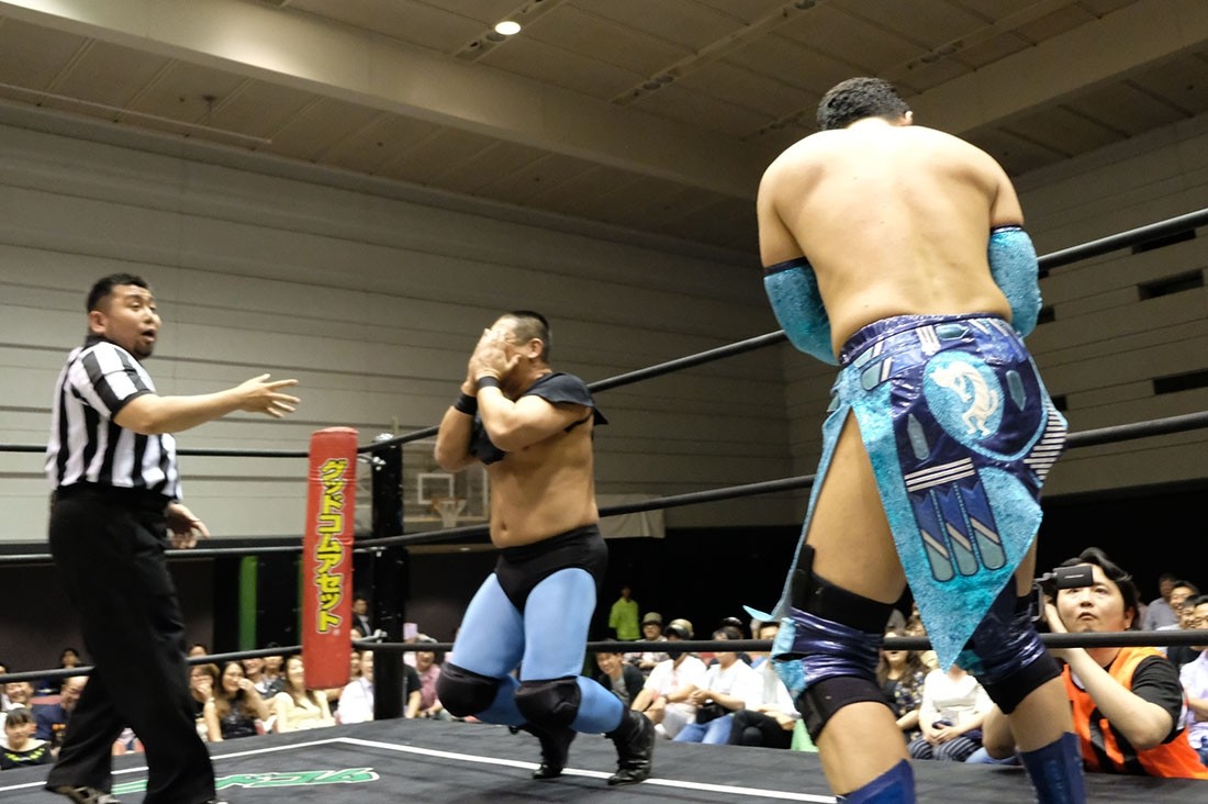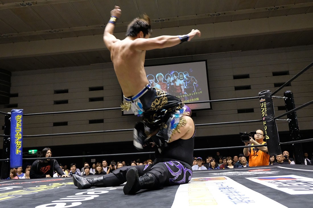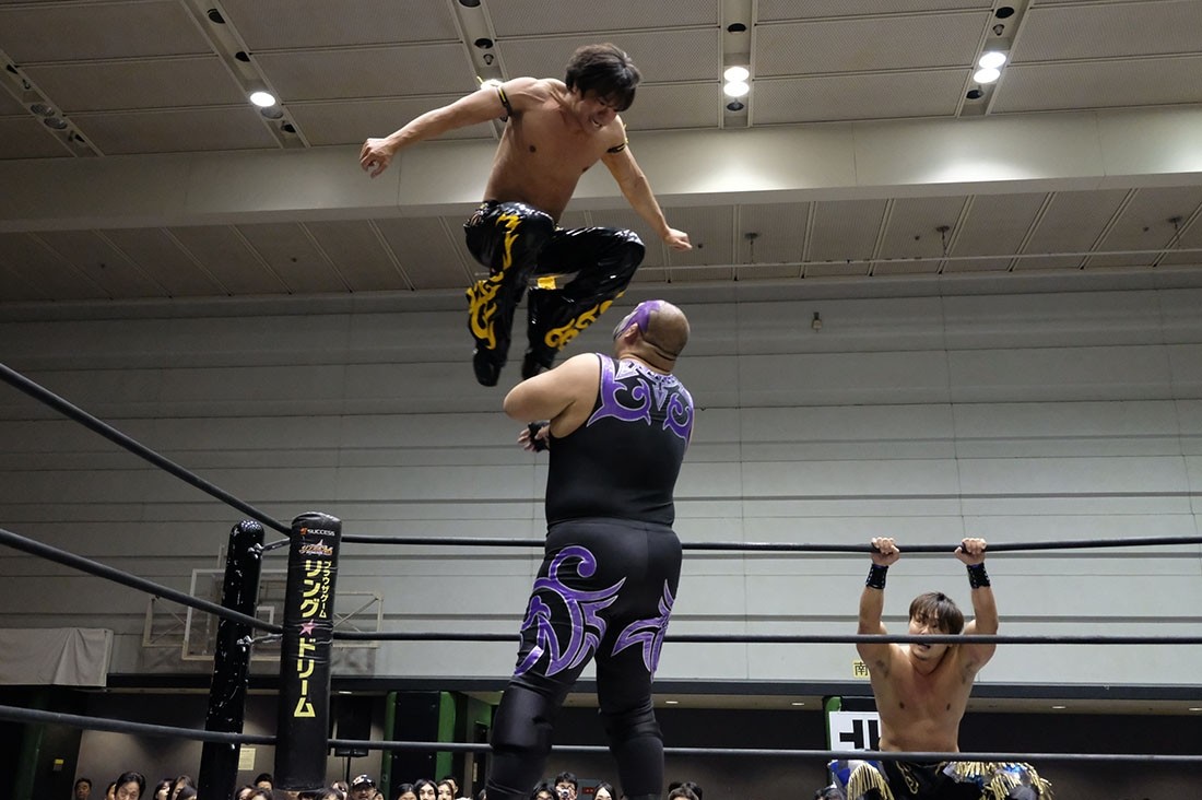 第4試合はHUB&高梨将弘vsヤス・ウラノ&MEN’Sテイオーのタッグマッチ。HUBが握手を求めるが、テイオーは尻尾と握手。腕を取って捻り上げたテイオーだが、ヘッドシザースで切り返したHUB。テイオーは倒立から脱出すると、ウラノにタッチ。高梨をロープに押し込んで離れ際にチョップを見舞ったウラノだが、これに怒った高梨が羽交い締めにすると、HUBが尻尾で殴打。テイオーが高梨のボディにエルボーを打ち込むと、ウラノもボディへのエルボードロップで続き形勢逆転。ウラノはバンダナで高梨を殴打してからガットバスター。さらに左腕を固めていくが、高梨はチンクラッシャーで脱出。HUBがダイビング・クロスボディーからブラックマジック。ウラノのピンチをテイオーがうまくアシストして救うと、テイオーはHUBの尻尾を使ってHUBを殴打。さらに滞空時間の長いブレーンバスター。ウラノもブレーンバスターの体勢からHUBをトップロープに乗せてドロップキック。テイオーはワンハンドバックブリーカーからテキサス・クローバー・ホールド。これを高梨がカットすると、ウラノも入ってきてトレイン攻撃。だが、かわしたHUBは後頭部への二ーを返して高梨にタッチしようとする。それを阻止したテイオーは連続で丸め込む。HUBも切り返していくが、お互いにカウント2。テイオーは丸め込んできたHUBをテキサス・クローバー・ホールドに捉えるが、これも高梨がカット。HUBはウラノにスタンディングのシャイニング・ウィザードを返して高梨にタッチ。ウラノの足をすくってドロップキックをテイオーに誤爆させた高梨はトラースキック。キャッチした高梨はHUBの尻尾攻撃からスクールボーイ。カウント2で返したウラノだが、高梨はタカタニックの体勢に。テイオーが入ってきて高梨をダブルアーム・スープレックスで投げると、ウラノがボディプレス。ツームストンを狙ったウラノだが、高梨が逃れるとHUBが飛び込んできてシャイニング・ウィザード。すかさず高梨がトラースキックからタカタニックを決めて3カウント。