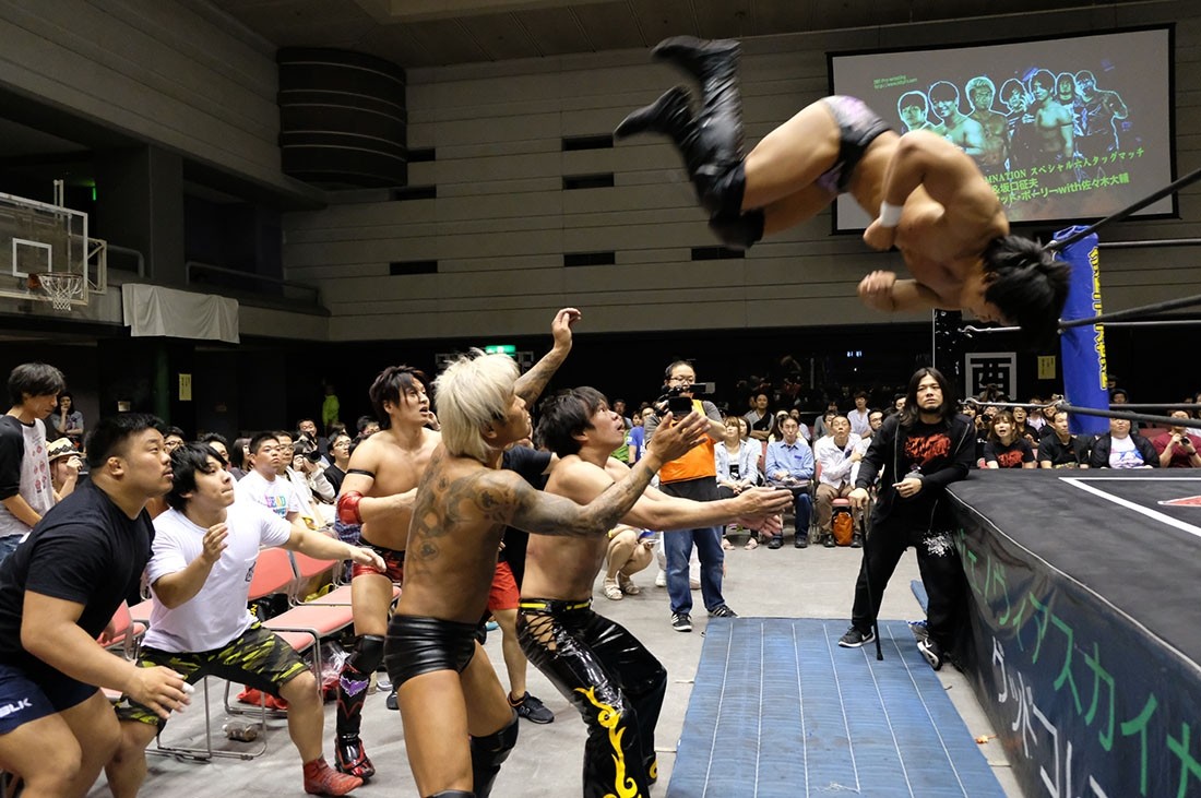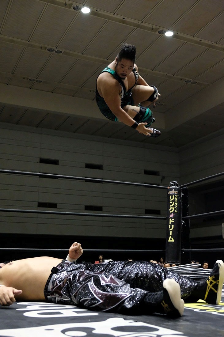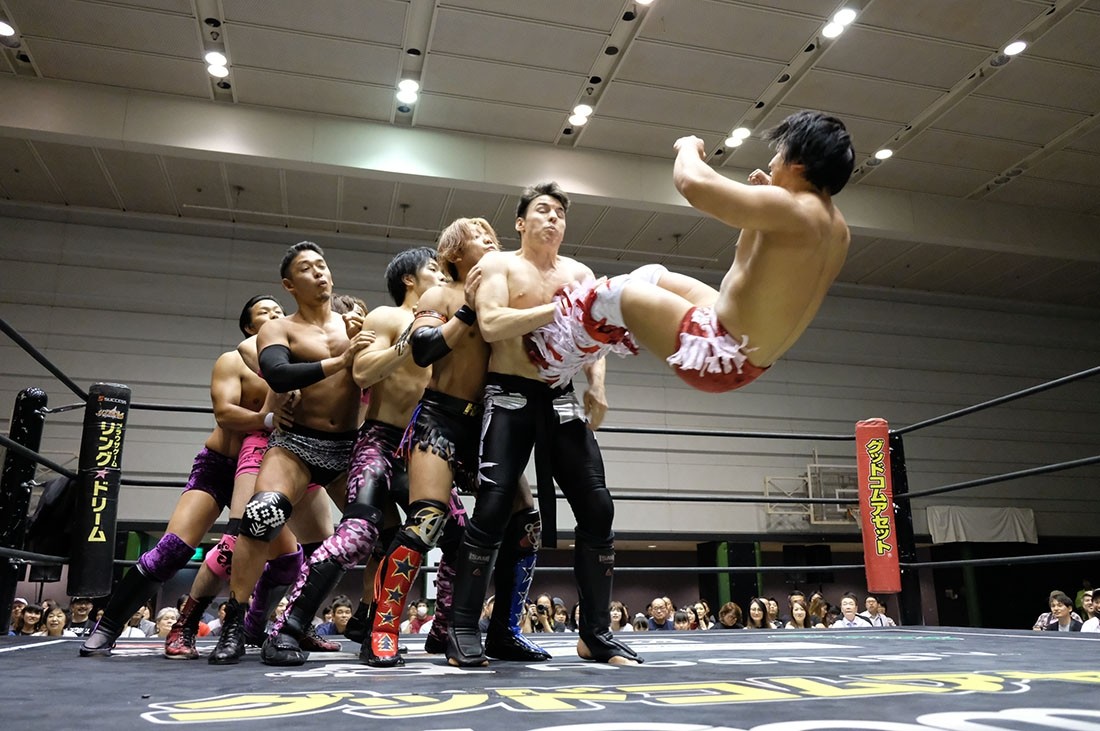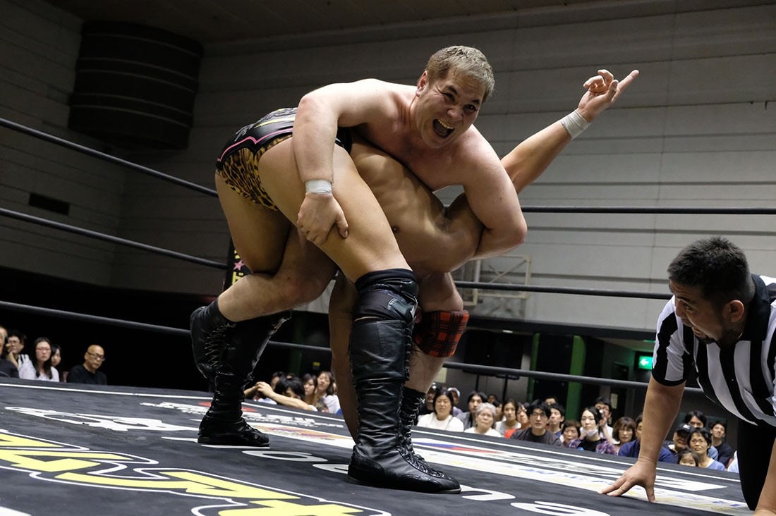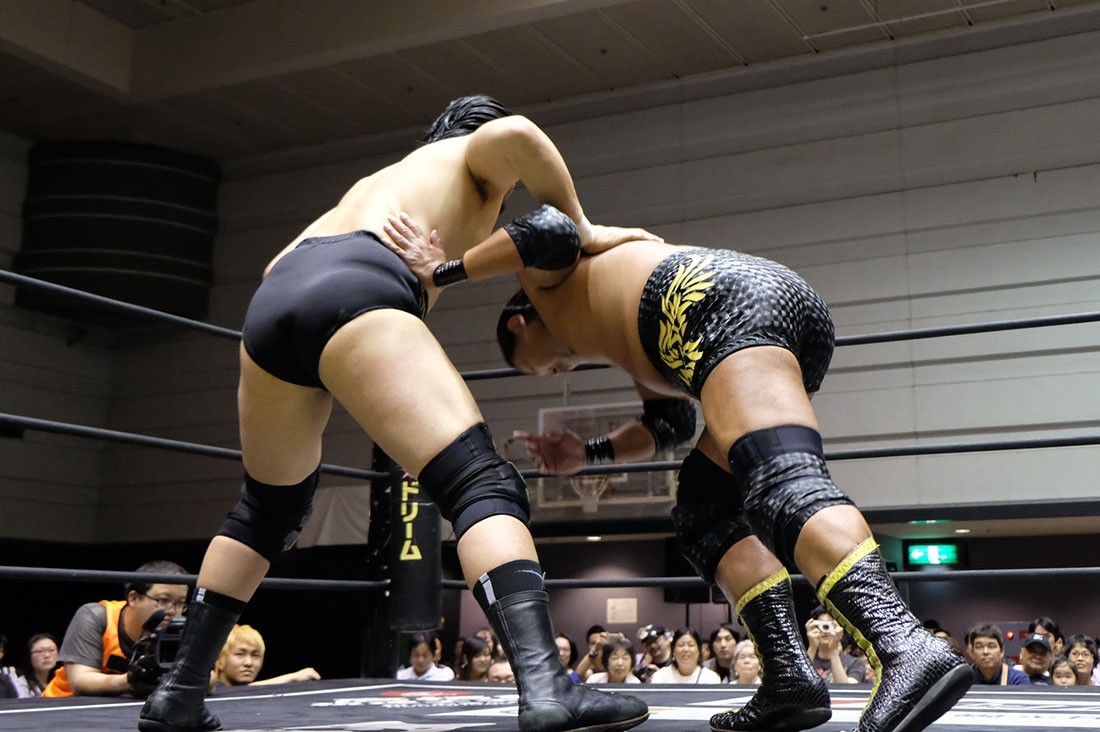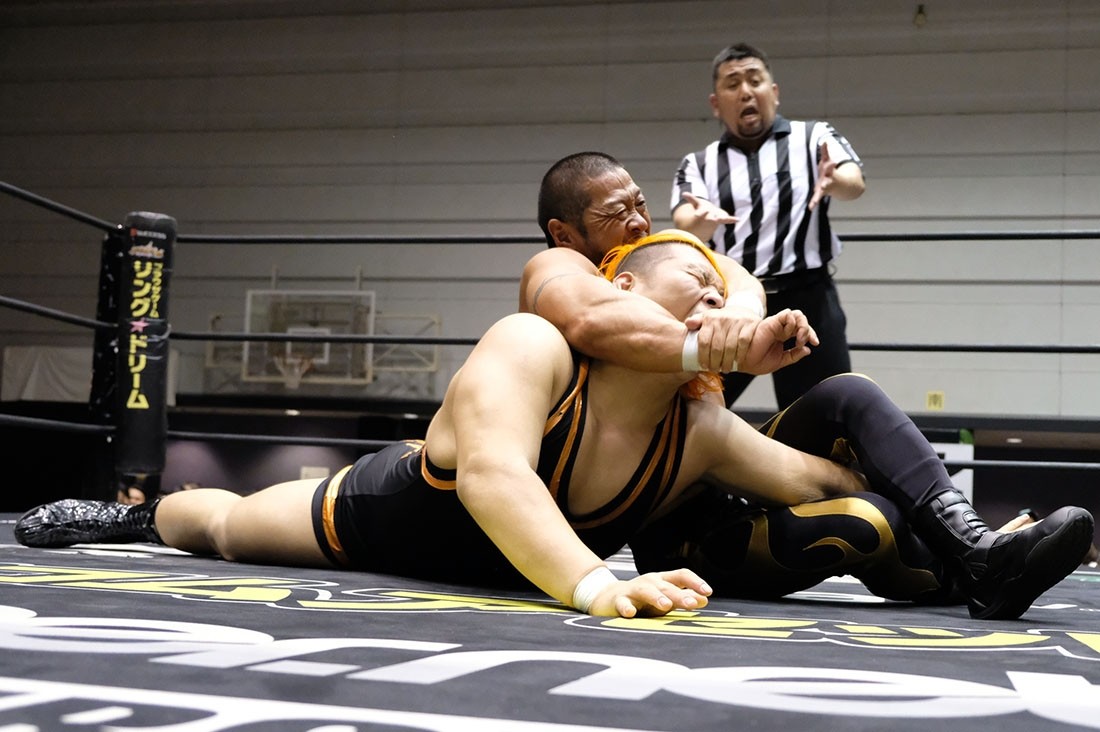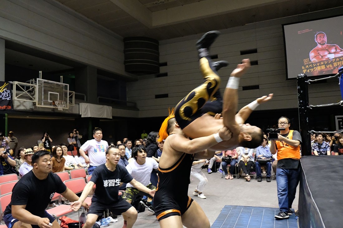 第5試合はディック東郷vs吉村直巳。吉村は東郷に対して両手の中指を突き立てる。ロックアップしようとする吉村をスカして挑発した東郷は、吉村をうまく場外に出すと、ロープの間を抜けて決めるトペ・コンヒーロ。そしてリングに戻ってきた吉村に向かって中指を突き立てた東郷に対し、ロープに押し込んでいった吉村はスカすようにクリーンブレイク。吉村は東郷を場外に投げ捨てると、客席に投げつける。怒った東郷はリングに戻った吉村に向かってイスを投げるが、かわした吉村はリングに戻ってきた東郷にエルボードロップ。逆水平チョップを叩き込んだ吉村にドロップキックを返した東郷だが、吉村はショルダータックルからスリーパー。エルボーで逃れた東郷はアッパーカット。しかし吉村はコーナーに押し込んでからブレーンバスター。パワーボムを狙った吉村だが、リバースで切り返した東郷はアッパーカット。吉村も逆水平チョップで応戦するブレーンバスターを狙ったが、これを東郷はクロスフェースで切り返す。ロープに逃れた吉村は串刺しラリアットからラリアットを狙ったが、逆に東郷がラリアットで迎撃。飛び付いてきた東郷をバックブリーカーで叩き付けた吉村は突き上げるようなラリアット。カウント2で返した東郷だが、吉村は昇天・改のような形で叩き付けるとパワーボムの体勢に。パンチで逃れた東郷は丸め込みからクロスフェースへ。回転してリング中央に持ってくるが、吉村はロープに脱出。吉村もグーパンチを返すが、何発も吉村の顔面をパンチで殴っていった東郷。吉村も殴り返していくが、東郷はカウンターのトラースキックからパンチ、ノータッチヘッドバット、ペディグリーと一気に畳みかけると、最後はダイビング・セントーンで3カウント。