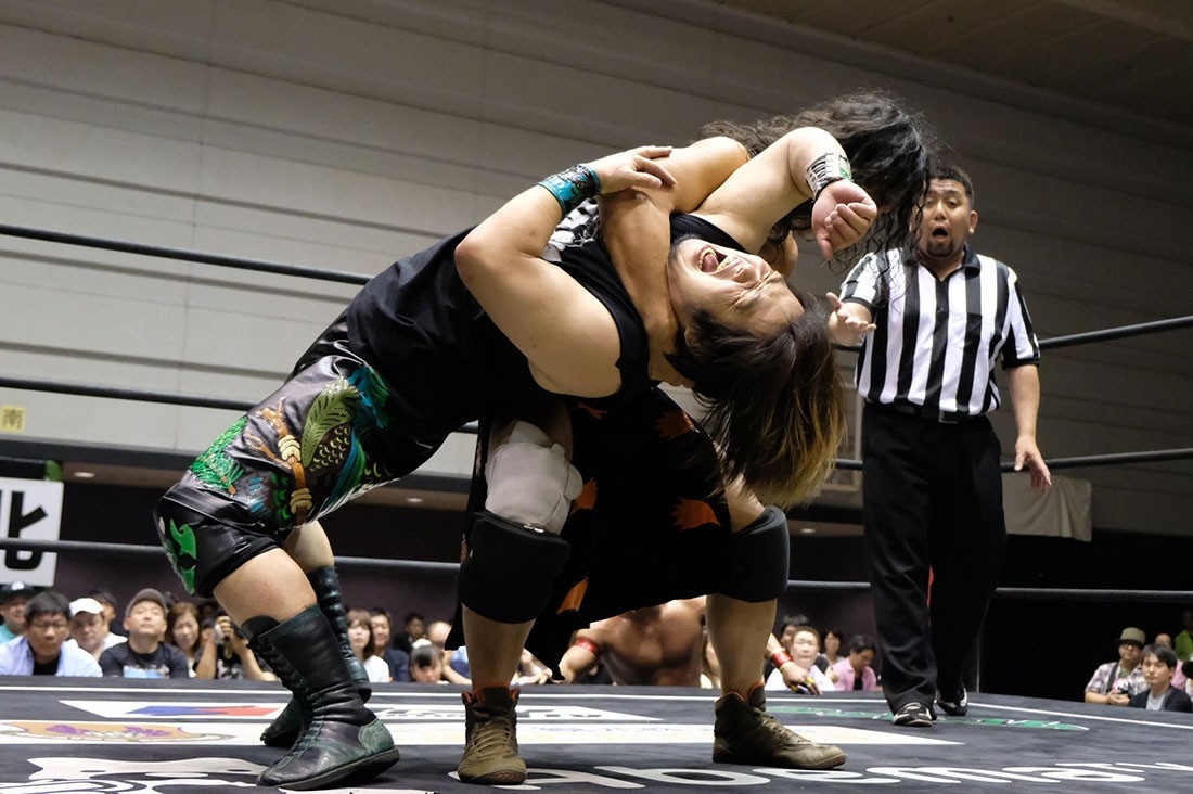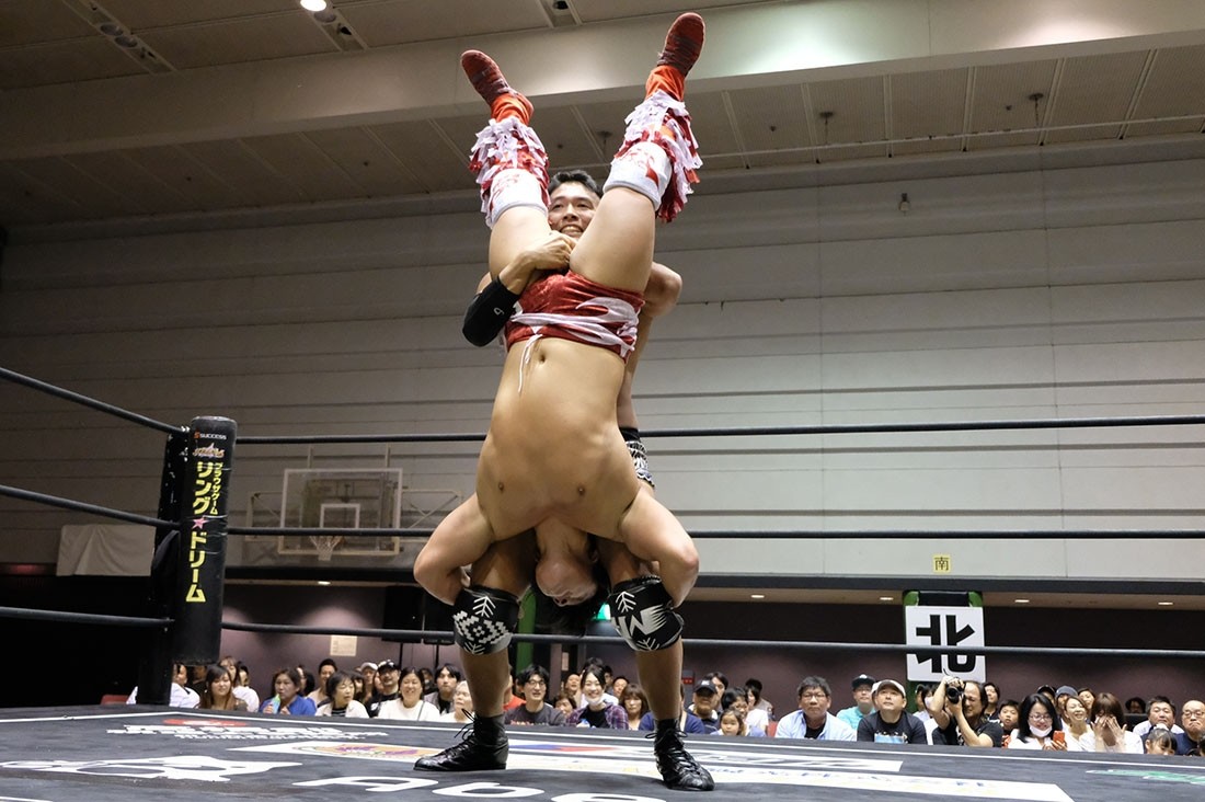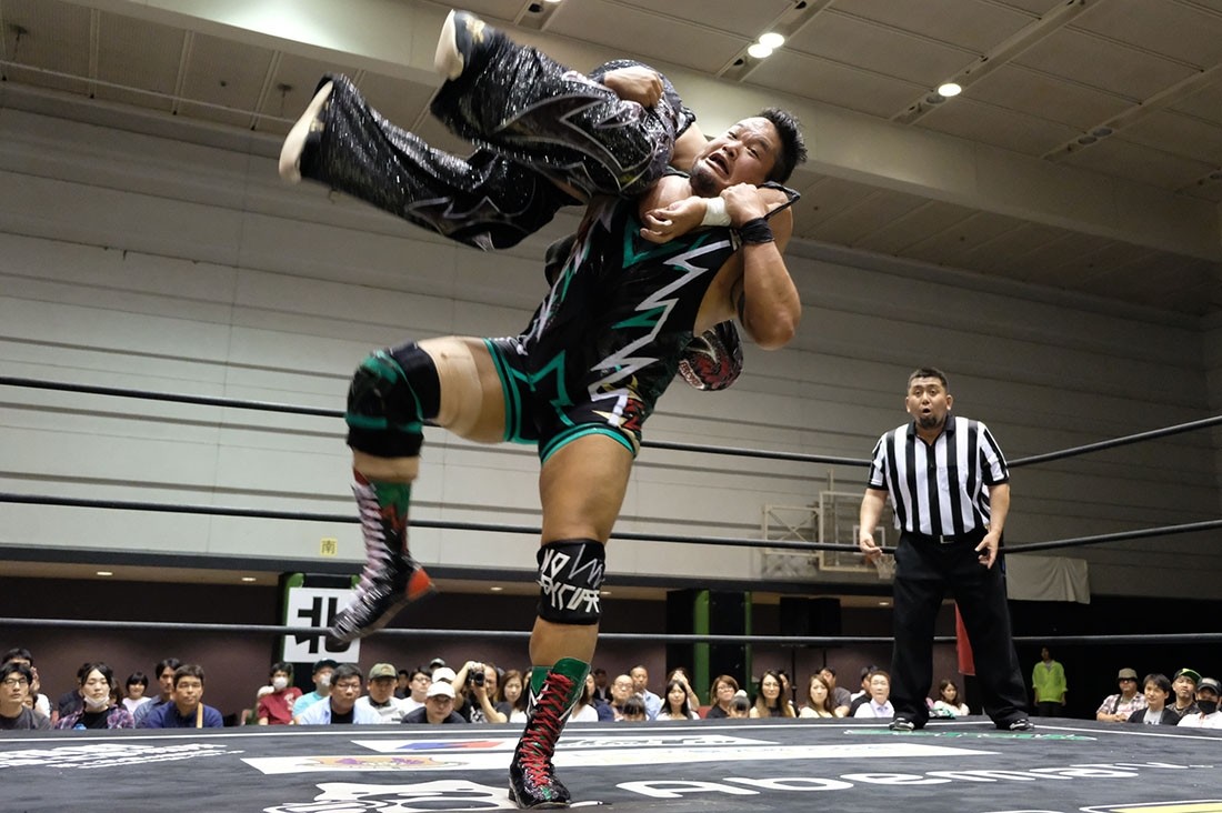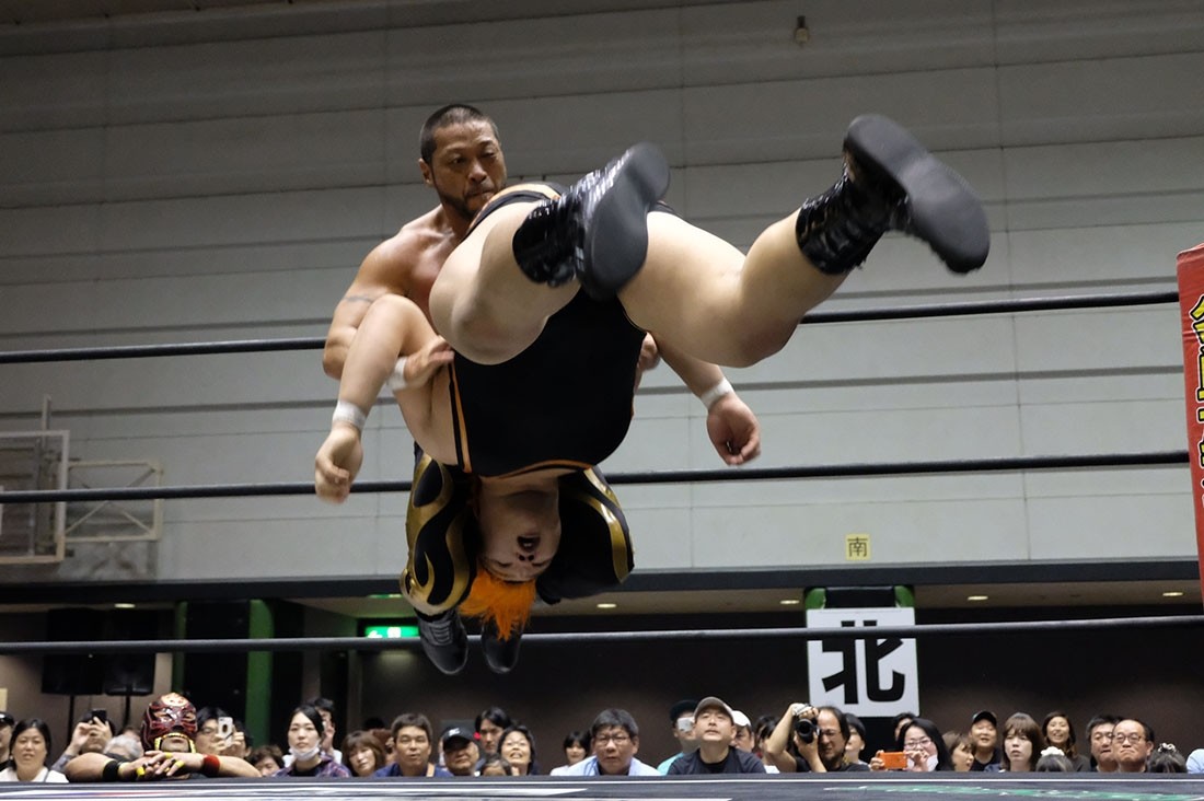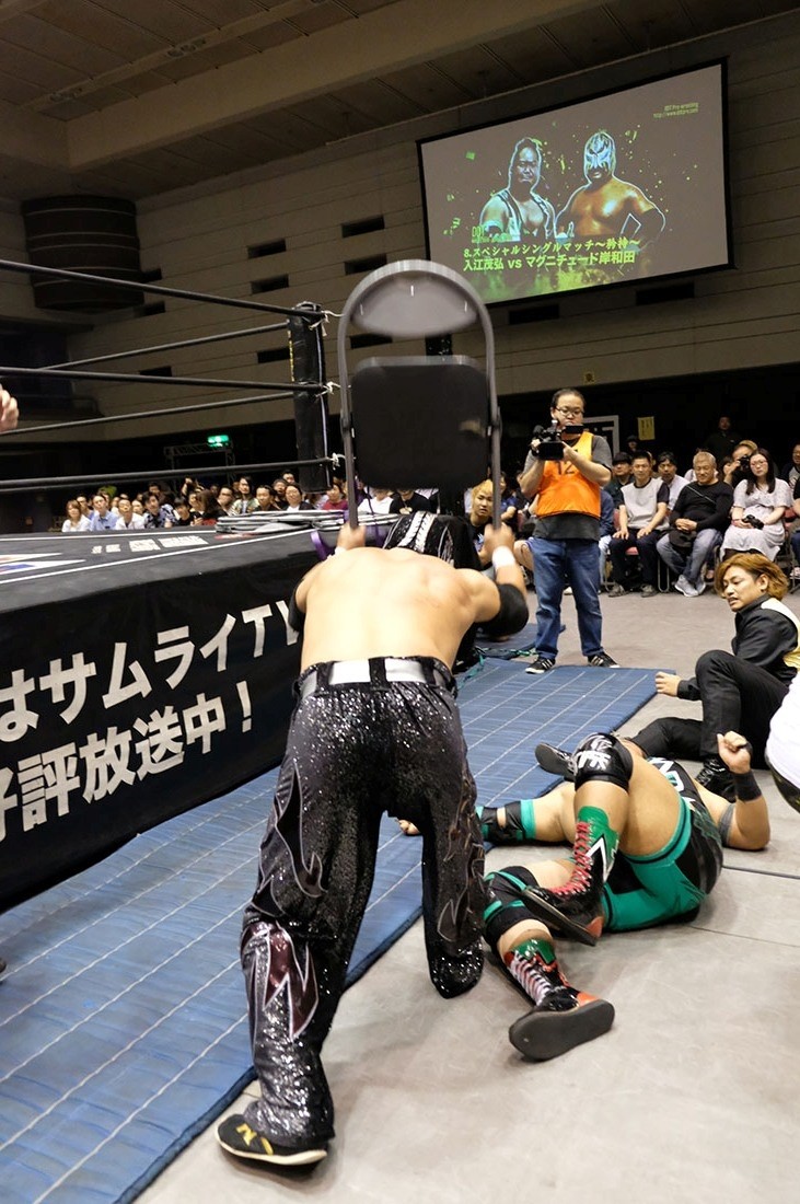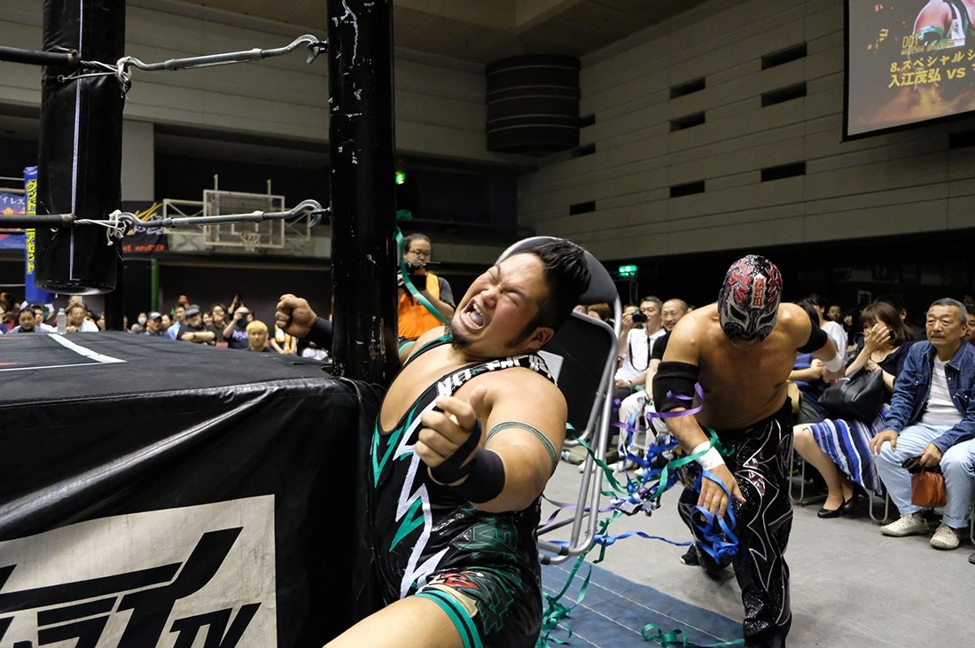 セミファイナルは入江茂弘vsマグニチュード岸和田。いきなり場外乱闘で試合が始まると、岸和田は入江だけでなく、セコンドの渡瀬もイスで殴打。右ヒジを押さえながらリングに戻った入江に、岸和田はその右ヒジにストンピング。「何がチャンピオンだ。俺にそんなもの関係ないんじゃ」と挑発しながら腕十字を仕掛けていった岸和田だが、入江は必死にクラッチ。クラッチが切れた瞬間、必死でロープに逃れた入江だが、岸和田はサーフボードストレッチに捉えながら「オラ、どうした!」となおも挑発。反転しようとする入江だが、岸和田はそれを許さない。どうにか反転してみせた入江だが、岸和田は急所攻撃。悶絶する入江の右ヒジにミサイルキックを発射した岸和田はショルダーアームブリーカー。「止めろ。俺、知らんぞ」と松井レフェリーに確認した岸和田は、なおもショルダーアームブリーカー。入江も痛む右ヒジでエルボーを打っていくが、岸和田はロープの上に入江の右腕を乗せてから、ヒジを思いきり踏みつける。10分が経過し、ブレーンバスターを狙った岸和田だが、踏ん張った入江は諦めてロープに飛んだ岸和田に交通事故タックルをお見舞い。さらに串刺しラリアットから豪快なブレーンバスターで投げるとブラックホールスラム。コーナーに登っていった入江だが、立ち上がった岸和田はラストライドで叩き付ける。ここでイスを持ち出した岸和田はリング中央にイス盛りを作る。入江は目の前に立ちはだかり、サムズダウンポーズ。岸和田は脳天にイスを振り下ろすと、ブレーンバスターの体勢に。しかし入江も逆に投げようとする。最終的に岸和田が投げ、イス盛りの上に入江を叩き付ける。グッタリする入江を引き起こしてラストライドの体勢に入った岸和田だが、腰を落とした入江は逆に駆け上げると「いってこい!」と叫びながら、デスバレーボムでイス盛りの上に叩き付ける。続くキャンボールをかわした岸和田は「やるのか? 男と男の勝負や」と言ってラリアット。入江も相打ちに持ち込むと、お互いに倒れないまま何度も相打ちに。そこから岸和田のラリアットをかわした入江がビーストボンバー。カウント2で返した岸和田だが、入江はロープに飛ぶ。岸和田はカウンターのラリアットで吹っ飛ばすと、ダイビング・ボディープレスを投下。さらに「折るぞー!」と叫びながら腕固めに捉えるが、どうにかロープに足を伸ばした入江。ラストライドを狙った岸和田だが、リバースで切り返した入江は水車落としのような落としからからビーストボンバー。これもカウント2で返した岸和田だが、入江はコーナー最上段からノリタケを投下すると、渾身のビーストボンバーで3カウント。