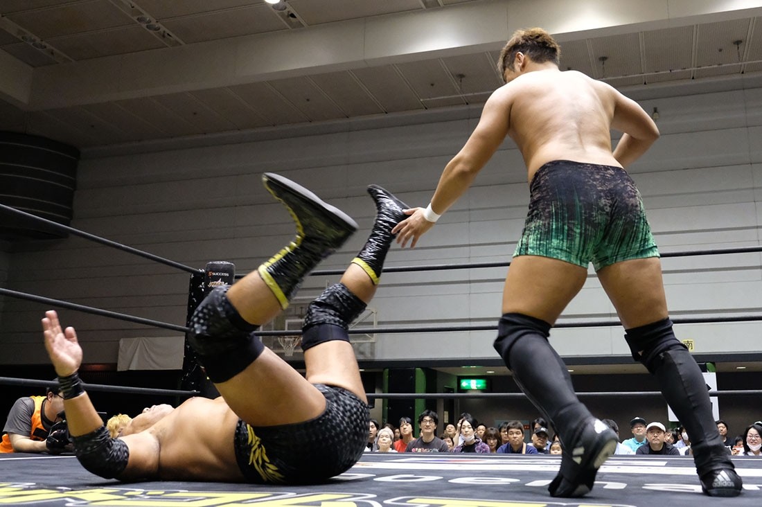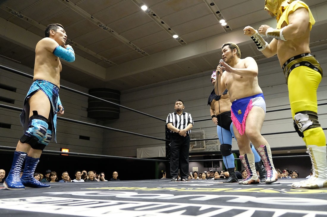 第1試合は石井慧介&梅田公太vs彰人&勝俣瞬馬vsマイク・ベイリー&MAOvs渡瀬瑞基&島谷常寛の4WAYタッグマッチ。腕のケガで欠場していた彰人はこの試合が復帰戦。島谷が「まとめて来いよ! 渡瀬がやるぞ!」と煽る中、渡瀬、ベイリー、彰人、渡瀬の4人で試合開始。バックの取り合いからヘッドロックにやり合いになったあと、梅田、MAO、勝俣、島谷がリングイン。MAOと勝俣が島谷にダブルドロップキックを見舞うと、島谷は梅田の足をすくって倒し、MAOと勝俣にダブルのジャンピング・ラリアット。しかし渡瀬の攻撃がことごとく島谷に誤爆すると、他の3チームが袋叩きにしてからトレイン攻撃。さらに次々にフットスタンプを落としていくと、もう一度トレイン攻撃。これをことごとくかわした島谷はジョン・ウーで全員吹っ飛ばす。そこから渡瀬がミサイルキック、勝俣を踏み台にして彰人にミサイルキック。石井の野球チョップと梅田のミドルキックを渡瀬に叩き込む。しかし彰人が石井と梅田をまとめてドラゴンスクリューで投げると、勝俣がプランチャ。MAO&ベイリーが竜巻旋風脚で彰人も場外に追いやると、コーナーからツインケブラーダ。勝俣をリングに戻し、MAO&ベイリーはダブルの串刺しキック。さらに石井をコーナーに乗せ、ダブルの雪崩式ブレーンバスターを狙う。ここで彰人と勝俣がパワーボムでコーナー上の3人を投げ捨てると、島谷がダイビング・ボディプレス。だが、その島谷にALL OUTが連係攻撃。渡瀬のミサイルキックも彰人がかわして島谷に誤爆させると、彰人はスタイルズクラッシュのような変形フェースバスターで島谷から3カウント。