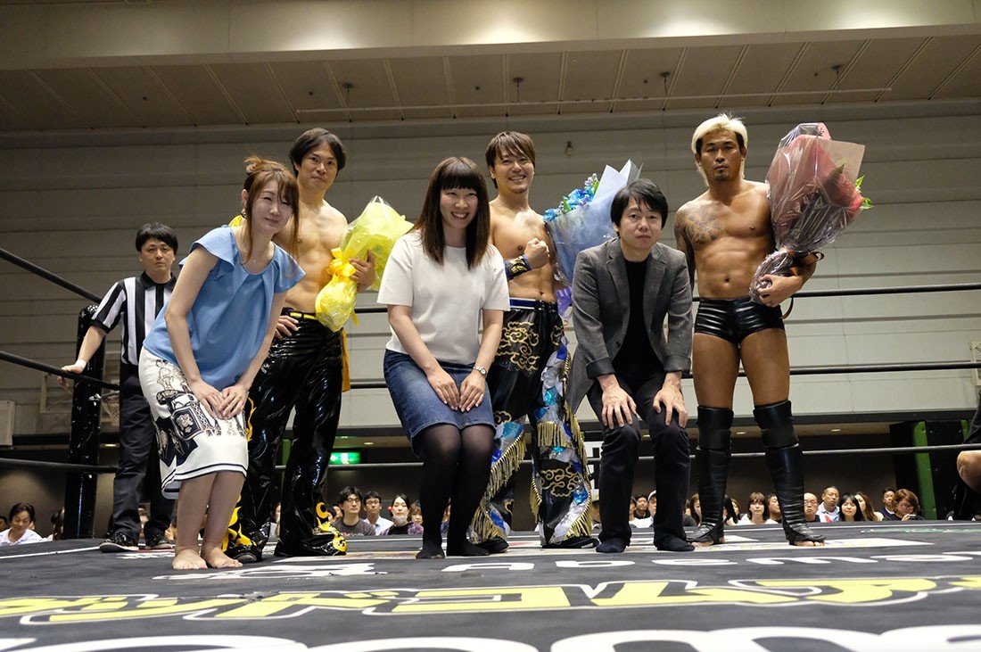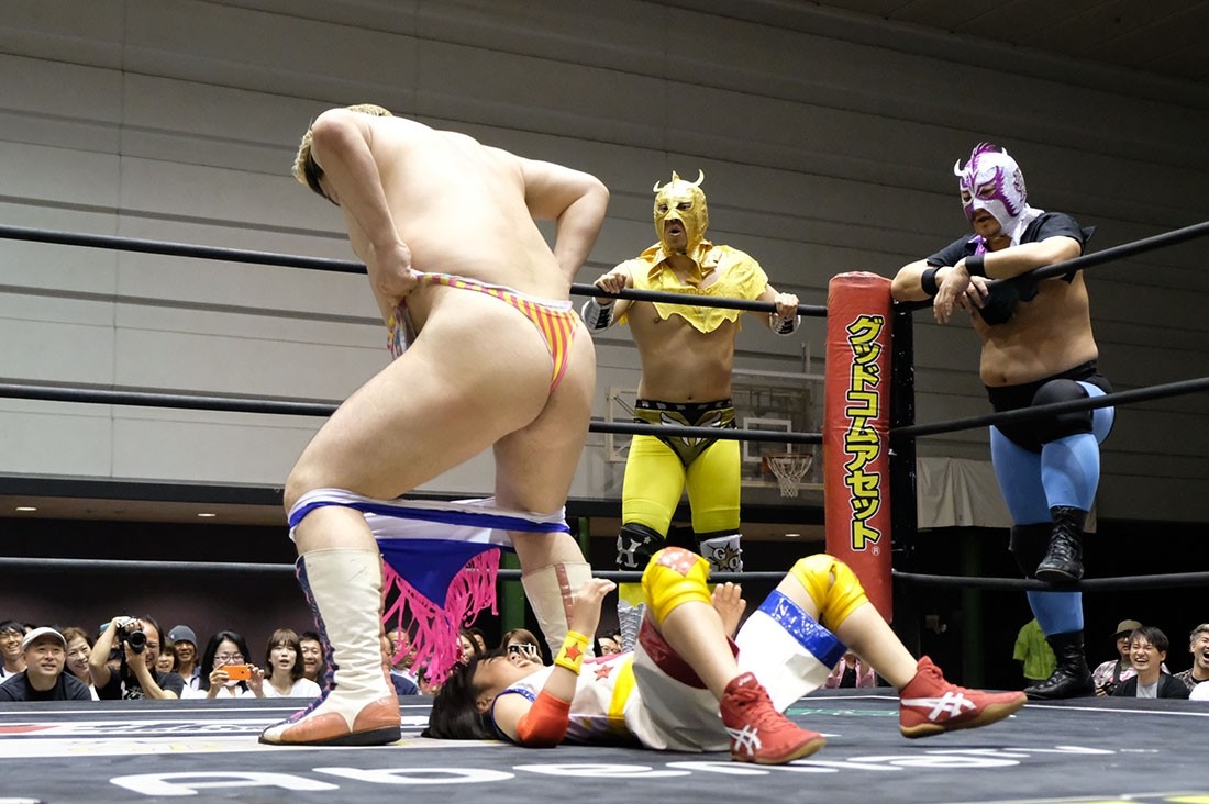 第2試合は大石真翔&赤井沙希&ゆにvs男色ディーノ&タカティモ・ドラゴン&ヒラティモ・ドラゴンの6人タッグマッチ。マイクを持ったディーノが「さて大石さん、そのときが来たね」と言うと、結婚する大石に向かって「幸せなのはアンタたちだけなのかい? 審判のときです。大石さんが婚約を発表してからワタシのところに1通、ここにはいないけど高木三四郎のところに数通のメールが来ました」と言い出し、全国各地にいると言われている大石の愛人問題に言及。「大阪の田中さん……」と言ったところで大石はラリアットで奇襲攻撃。「全部ウソだー!」と叫びながらヒラティモを殴り倒していく。赤井がヒラティモをオスカーロックに捉えるが、ディーノがカット。ゆにが殴りかかっていくと、ヒラティモは大人気なく殴り倒す。タカティモもボディスラムで叩き付けると、ディーノは男色クローからの男色ナイトメアー。顔面騎乗をかわしたゆにはドロップキックを返して赤井にタッチ。ダイビング・クロスボディーからサッキーカッターで叩き付けた赤井は串刺しビッグブーツ。しかしディーノも垂直落下式ブレーンバスターを返してタカティモにタッチ。ドラゴンリングインこそ大石に迎撃されたタカティモだが、ゆにをスリーパーで捕獲。しかしゆにはドラゴンスリーパーで切り返す。大石もアサイDDTを狙ったヒラティモにスタナー。さらに大石&ゆにで合体ロボDDTからダブルのドロップキック。ゆにはウラカン・ラナを狙うが、ヒラティモがマスクをゆにに持たせる。その感にタカティモもマスクを大石に渡すと、ディーノは漢タイツとTバックを脱いで赤井に手渡す。これでゆには反則負けとなった。