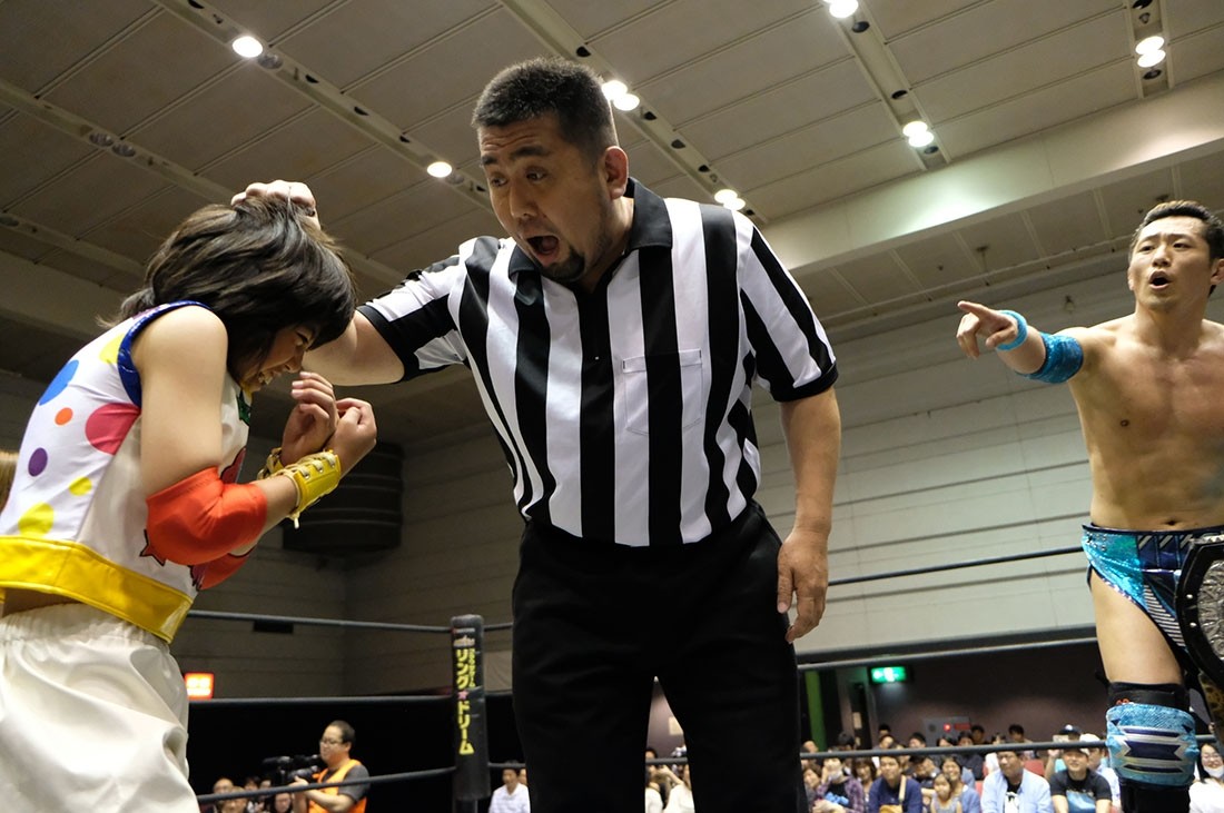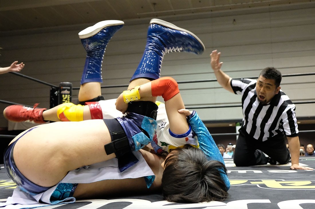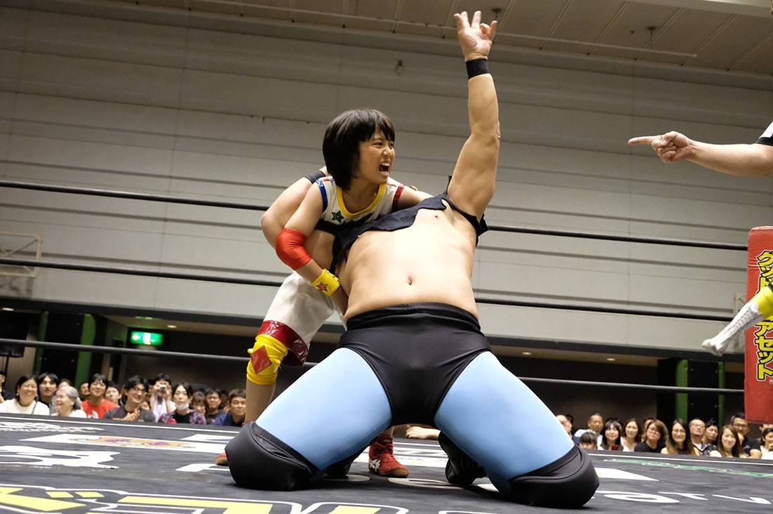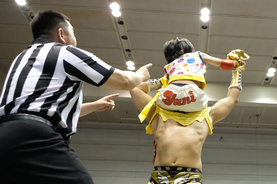 反則をしたゆにを怒る松井レフェリー。それを止めようとした大石だが、ゆには近づいてきた大石を丸め込んで3カウント。アイアンマン王座を奪取してみせた。