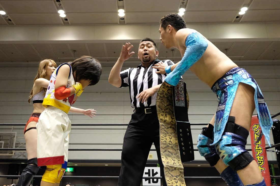 エンドアナウンスをしていたゆにと赤井だが、赤井がせっかくベルトを獲ったのだから、リング上で挨拶をしようとゆにに提案。ゆにがアイアンマンのベルトを持ってリングに上がった背後から、赤井が何と急所攻撃。そして丸め込んで3カウント。