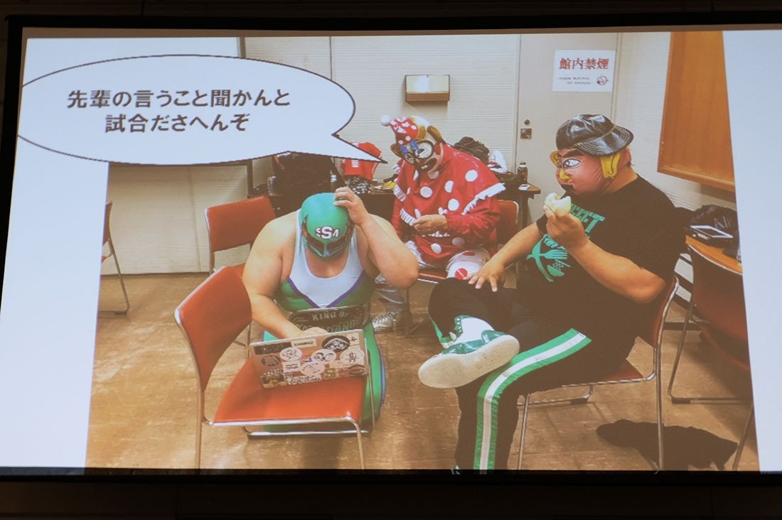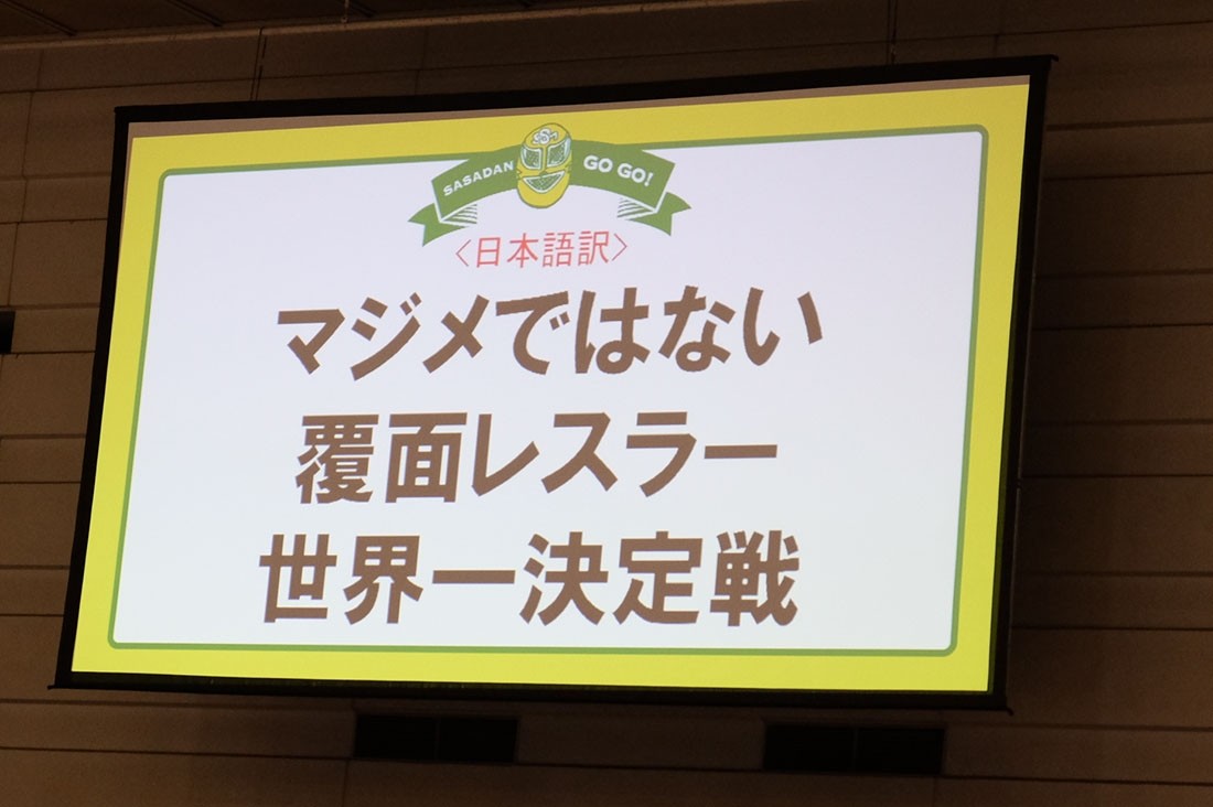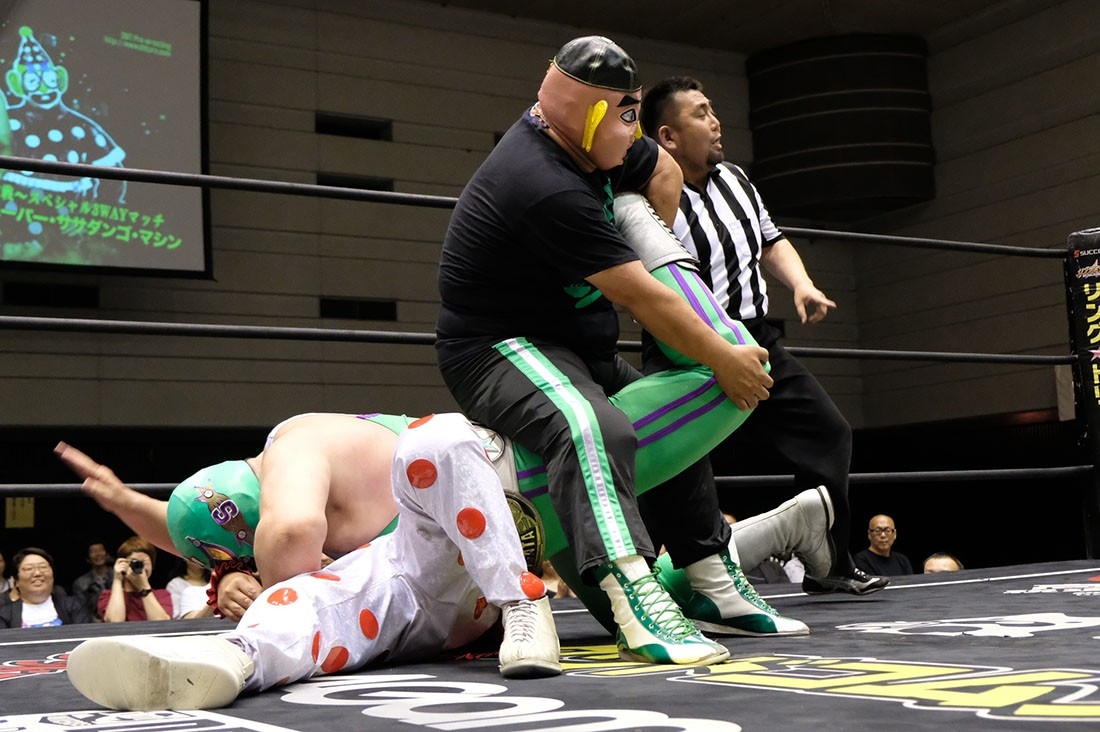 第6試合はノット・シリアス・マスクマン世界一決定戦、菊タローvsくいしんぼう仮面vsスーパー・ササダンゴ・マシンの3WAYマッチ。まずはササダンゴマシンが「ノット・シリアス・マスクマン世界一決定戦とは何か?」と題した煽りパワポを開始する。ノット・シリアス・マスクマン世界一決定戦とは、マジメではなく覆面レスラー世界一決定戦という意味であり、今の覆面レスラーはマジメするので、本来はもっと余暇を楽しんでいたのに、いまはジムに通うレスラーが多過ぎると指摘。続いてくいしんぼうは出張マットプレスや自叙伝出版、絵本作家転身と時代の激しい変化にうまく対応しすぎと分析。一方の菊タローはラスベガス移住、年間100試合しているため世界中の選手をブッキング出来る、そして耳垢が真珠のように溜まる病気にかかったことにも触れる。そんなことを言いながら、くいしんぼうと菊タローのグッズを告知したササダンゴは、一人だけキャリアが下のため先輩たちから告知パワポを作らされたと告白した。試合が始まると、3選手が自分への声援を欲しがる。「松井」コールまで起こったあと、菊タローとくいしんぼうにいいようにあしらわれるササダンゴ。「入れてもらっていいですか!」と申し出たササダンゴだが、菊タローとくいしんぼうが拒否すると、ササダンゴはダブルラリアット。そこからくいしんぼうがうっちゃると、みんなで回転して欽ちゃんジャンプ。菊タローのローキックを食らったくいしんぼうがバービックを披露すると、菊タローもローキックを食らってバービック。ササダンゴもバービックを披露すると、松井レフェリーもローキックを食らってバービック。ついには4人でバービックを披露。くいしんぼうは串刺しラリアットを連発するが、連発するあまり相手を追い抜いてしまう。すると菊タローが月1試合程度しか出ていないササダンゴに「もっと試合に出たいならアイツを潰せ」と指示。後ろを向いているくいしんぼうを襲うとDDTが炎上するとササダンゴが躊躇すると、菊タローが二人がかりでやろうと提案。ササダンゴと菊タローが突進するが、松井レフェリーがタックルで迎撃して阻止。その間にコーナーに登ったくいしんぼうだが、菊タローがカンチョー。すると菊タローは新潟から来たササダンゴに勝利を譲ると言い出す。ササダンゴはダイビング・ニードロップを投下してカバーするが、そのササダンゴを逆片エビ固めに捉えた菊タローがギブアップを奪った。