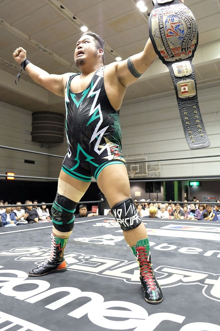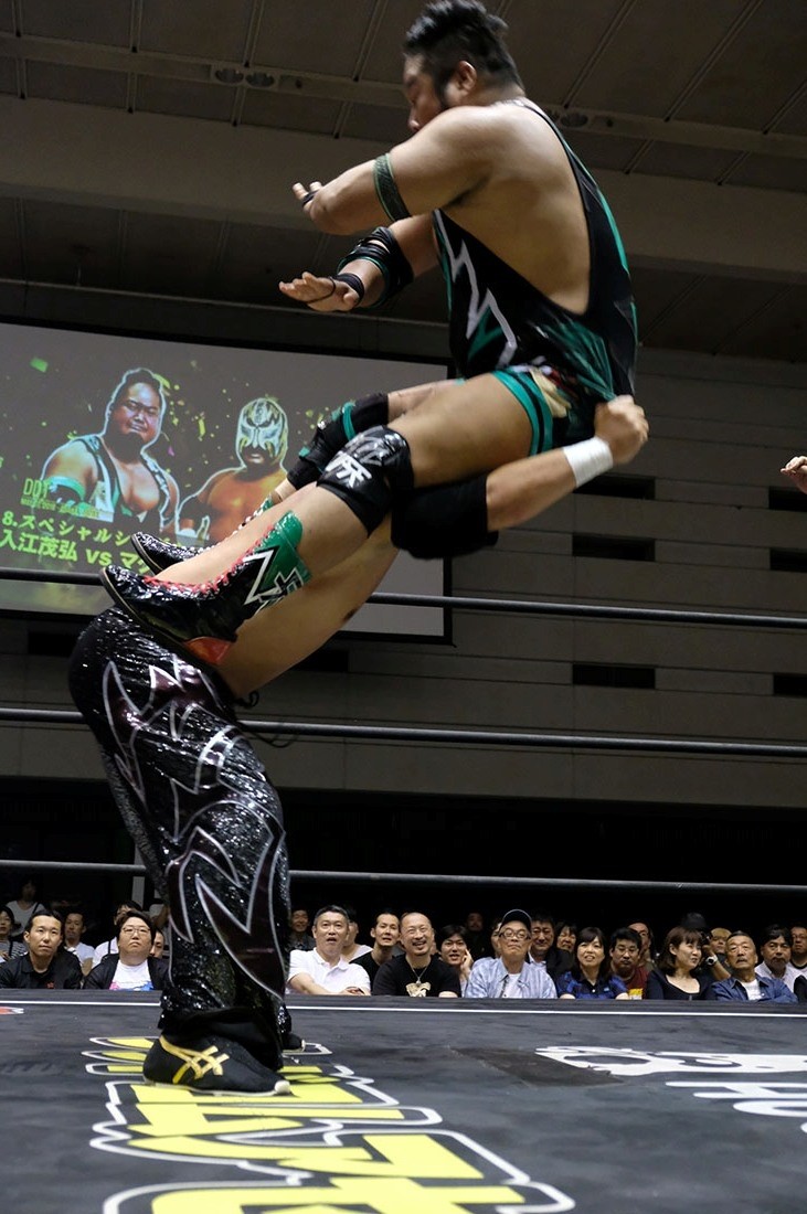入江 マグニチュード岸和田、ボクにとってはすごく……昔の……ボクからしたら考えられないような相手に勝利したってことは、ボクにとって大きな経験ですし。でもボクはあの人とボクの師匠である高井憲吾の試合を見て、ボクはプロレスラーになりたいと夢見て、今はプロレスラーになって、このDDTのチャンピオンになって。まだまだボクはあの人たちから学ばないといけないことがたくさんあると思うので、このベルトを守ってどんどん経験して、強くなってまた岸和田さんと対戦したいです。ありがとうございました。