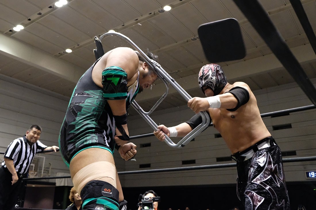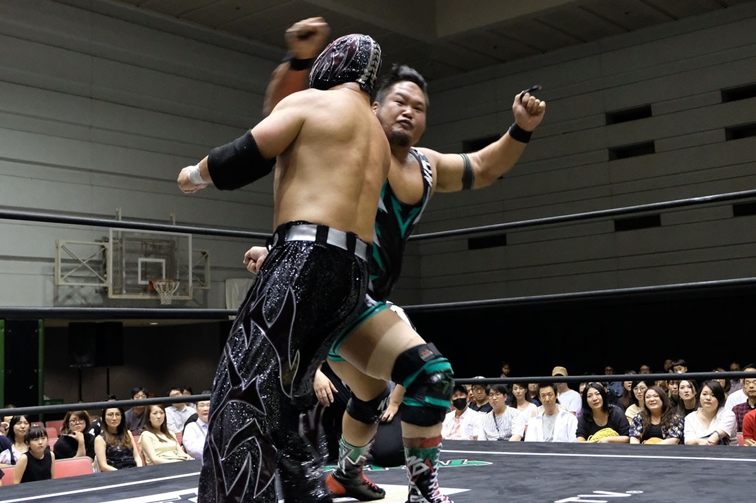 第7試合はHARASHIMA&KUDO&坂口征夫vs高尾蒼馬&遠藤哲哉&マッド・ポーリーwith佐々木大輔の6人タッグマッチ。KUDOがポーリーにローキックを出していくと、ポーリーもローキックを返す。高尾がリングインすると、HARASHIMAがタッチを要求。KUDOがタッチしてHARASHIMAがリングインすると、高尾は遠藤にタッチ。首を傾げるHARASHIMAを場外に落とした遠藤。場外乱闘になると、セコンドの佐々木も杖で坂口を攻撃。ポーリーがHARASHIMAの腰を鉄柱に叩き付けてからリングに戻す。ここで高尾がHARASHIMAにストンピングからテーピングを使ってチョーク攻撃。ポーリーのエルボードロップ、遠藤の逆水平チョップで追い込むが、HARASHIMAも遠藤をコーナー二段目に寝かせるとフットスタンプを落とす。タッチを受けた坂口は払い腰からPK。スリーパーは後方回転して逃れた遠藤。逆にスリーパーに捉えるが、コーナーに押し込んで逃れた坂口は遠藤をコーナーに乗せて串刺しニー。これをかわした遠藤はスワンダイブ式エルボーアタック。高尾はコンプリート・ショットで坂口をコーナーに叩き付けると後頭部にニー。続くダイビング・フットスタンプをかわした坂口は蹴り飛ばしてKUDOにタッチ。サミングを見舞った高尾にキチンシンクからスリングショット式ダブルニーを返したKUDOだが、高尾もマンハッタンドロップからDDT。ポーリーの体当たりをかわしたKUDOだが、カウンターのテーズプレスからSTFに捉えたポーリー。坂口がカットするが、DAMNATIONはKUDOにトレイン攻撃。さらに四つん這いになったポーリーを踏み台にして高尾がフットススタンプ → 遠藤がムーンサルトプレス。さらにポーリーがボディプレスからリバーススプラッシュを狙うが、HARASHIMAがジャンピングキックでカットすると、KUDOはバックスピンキック。タッチを受けたHARASHIMAはダイビング・カンフーキックから串刺しフロントキック。ブレーンバスターは逆にポーリーが投げていってボディプレス。HARASHIMAもミドルキックを返すと、KUDOと坂口が入ってきてトレイン攻撃。さらにKUDOもダイビング・ダブルニーアタックからHARASHIMAがスワンダイブ・ボディプレス。だが、高尾がHARASHIMAに急所蹴りからトラースキック。さらに高尾がKUDOを場外に追いやると、遠藤もミサイルキックで坂口を場外に出してブエロ・デ・アギラ。リング上ではポーリーがHARASHIMAに左右のハンマーからラリアット。ポーリーバスターを狙ったところで背後に逃れたHARASHIMAは串刺し式蒼魔刀。さらにスタンディングの蒼魔刀から正調の蒼魔刀をブチ込んで3カウント。
