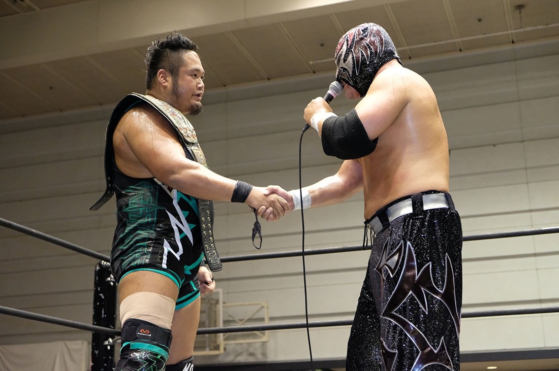 マイクを持った入江が「岸和田、マグニチュード岸和田……岸和田さん、自分はあなたがこの大阪で、大阪プロレスでずっとトップで引っ張っていたときに、あなたとボクの師匠である高井憲吾、その二人の試合を見て、ボクはプロレスラーになりたいと思って、それを夢見て、今ボクはプロレスラーになってこのDDTでチャンピオンになりました。今、チャンピオンになりましたが、ボクにはまだまだ足りないもの、岸和田さんからもっと学ばないといけなのがたくさんあると思います。ボクもどんどん強くなりますので、またボクと闘ってください。ありがとうございました」と言うと、岸和田は「オイ入江! オイ、オマエよ、ただの小僧やと思ったけど、なかなかやるやないか。俺は絶対人を褒めないで有名やけど、今日は気持ちいい試合出来た。オイ、今日だけやぞ。明日からまた闘いが始まるけど、今日だけ一話完結ってことで、オマエと俺で握手しようやないか。今日だけやから調子に乗るなよ。でもな今日は納得いったぞ! さすがチャンピオンや! とりあえず今日は本当にいい試合が出来たと思う。俺とオマエで今日だけ握手しようやないか」と言って、入江と握手。さらに入江の腕をあげた岸和田から「何回も防衛しろよ。そしてオマエが大阪最強になれ」とエールを送られた入江は、引き上げていく岸和田の背中に深々と頭を下げた。