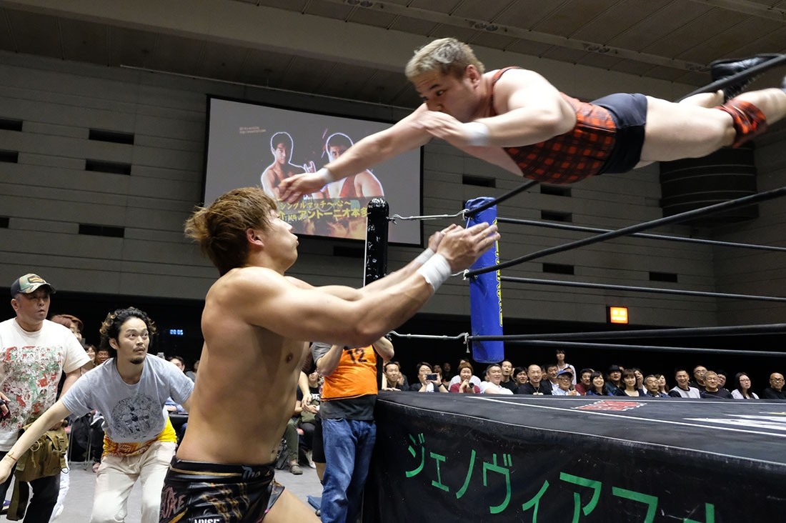 メインイベントは竹下幸之介vsアントーニオ本多。まずはアントンがヤス・ウラノとトランザム★ヒロシをセコンドに従えて入場。一方の竹下はハッピーモーテルの入場曲で入場。ゴングが鳴ると竹下が近づいていってアントンを睨み付ける。アントンはジリジリとした間合い地獄からロックアップするが、竹下はロープに押し込んでクリーンブレイク。腕を取って固めていったアントンだが、竹下はカニ挟みで倒してバックを取ると早くもジャーマンの体勢に。アントンも足をすくって倒すとレッグロック。竹下は強引に足4の字固めを狙うが、アントンはレッグスプリットで切り返すと、両腕でガッツポーズを自らを鼓舞。「皆さん、こんばんは! 俺を応援してくれ」と言うアントンに対し、竹下も「タケシタ」コールを煽る。手四つの力比べでは竹下が圧倒。だが、アントンは下から捻り上げたりヘッドロックに捉えたり、じっくりと攻めていく。ロープに飛ばした竹下だは、ショルダータックルは相打ちに。場外に出た竹下が「来いよ」と挑発すると、思わず近づいていったアントン。すると竹下は足を掴んで場外に引きずり出し、アントンをイスに座らせエルボーで動けなくさせてから、ランニング・フロントキック。アントンをリングに戻し、ジャベリンキックで吹っ飛ばした竹下だが、アントンも逆水平チョップで反撃。10分が経過し、竹下も逆水平チョップを返すと、ブレーンバスターの体勢に。踏ん張るアントンをぶっこ抜いて投げた竹下はウォール・オブ・タケシタへ。ロープに逃れたアントンはチョップを打っていくが、竹下の逆水平チョップを食らってダウン。それでもボディブローからニーリフトでカチあげたアントンは、竹下を場外に蹴落とすとトペを狙ってロープに入る。しかし、途中で躓いて転倒。「松井さん、申し訳ない。ギブアップ……あー、ちょっと! ここでギブアップしたらワタシを応援している人があ〜あってなるから」と言って、ギブアップする前に「ごんぎつね」を披露することに。竹下も正座して聞く中、「思い出した。これはワタシの試合だった。ヒロシ、ヤス・ウラノ、松井さん……そうだ、思い出した。これは俺の最後になってもいい。そう思った試合だった。今、ワタシが思っているのはこの瞬間がずっと続けばいい。本当に……この瞬間がずっと続いていれば。どうか、どうか、終わらないように……」としんみりさせたところで竹下にサミング。これで竹下が場外に落ちると、アントンは間髪入れずトペ・スイシーダを発射。竹下をリングに戻し、顔面を踏みつけたアントンは馬乗りナックル。フィストドロップを落としたアントンはニードロップも顔面に落とす。執拗にカバーしていったアントンだが、竹下はどうにか肩を上げる。アントンは南部式ナックルからバイオニックエルボーを狙ったが、竹下はカウンターのエルボーをボディに叩き込むとヘッドロック。グイグイと絞め上げた竹下だが、ボディブローで逃れたアントンはコブラツイストを狙う。竹下が防御すると卍固めを狙うが、竹下はドラゴンスクリューから足4の字を狙う。しかし首固めで切り返したアントンは、飛び付き横十字固めからオクラホマロール。20分を経過し、必死で肩を上げる竹下に対し、アントンはパンチを誘い水にして逆さ押さえ込みを画ラウ。だが、前方に投げ落とした竹下はニーをブチ込むとラリアット。これをかわしてパンチを叩き込んだアントンだが、パンチの相打ちに持ち込んだ竹下はショートレンジラリアット。そして決めポーズから必殺のジャーマンを狙った竹下だが、振り払ったアントンはパンチ。竹下もパンチを返すとローリングパンチ。だが、コスチュームのショルダーを外したアントンは左右のパンチを連打。竹下はボディブローを返すと、逆に南部式ナックルからバイオニックエルボーを狙ったが、アントンもボディへのエルボー。そこからバイオニックエルボーは相打ちになったが、アントンはスコーピオン・デス・ドロップからコーナーに登るとダイビング・フィストドロップ。両足をあげて迎撃した竹下はジャーマンを狙うが、アントンもバックを取り返す。だが、竹下はワンツーエルボーから渾身のエルボー。しかし串刺し攻撃を狙った竹下にテーズプレスを決めたアントンはジャンピングハイから延髄斬り。立ち上がろうとする竹下に低空延髄斬りを叩き込んでからスリーパーに捉えたアントン。25分を経過し、落ちそうになった竹下だが、どうにか踏ん張ると逆にスリーパーからブルーサンダーボム。ダブルダウンからカウント9で立ち上がった両者はロックアップ。ヘッドロックにいった竹下をバックドロップで投げたアントンは卍固め。しかし竹下はジワジワとロープへ。アントンは奥の手ドラゴンスープレックスで投げると、ツームストンパイルドライバーからもう一度ダイビング・フィストドロップ。今度はクリーンヒットしたが、カウントは2。殴