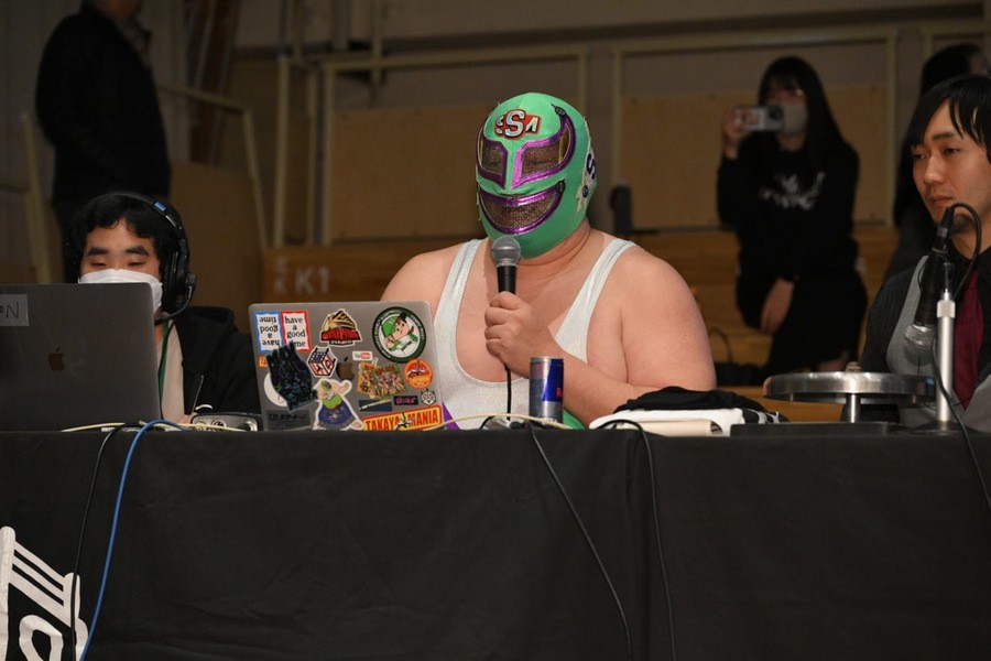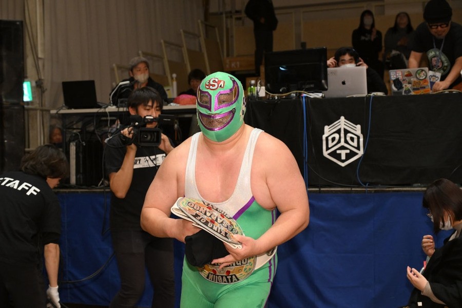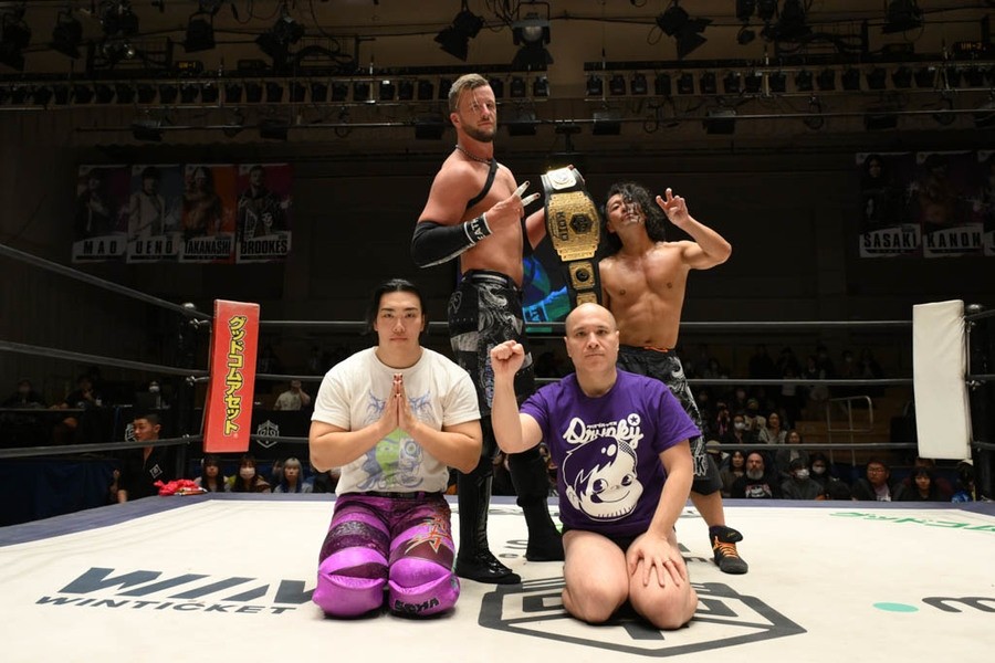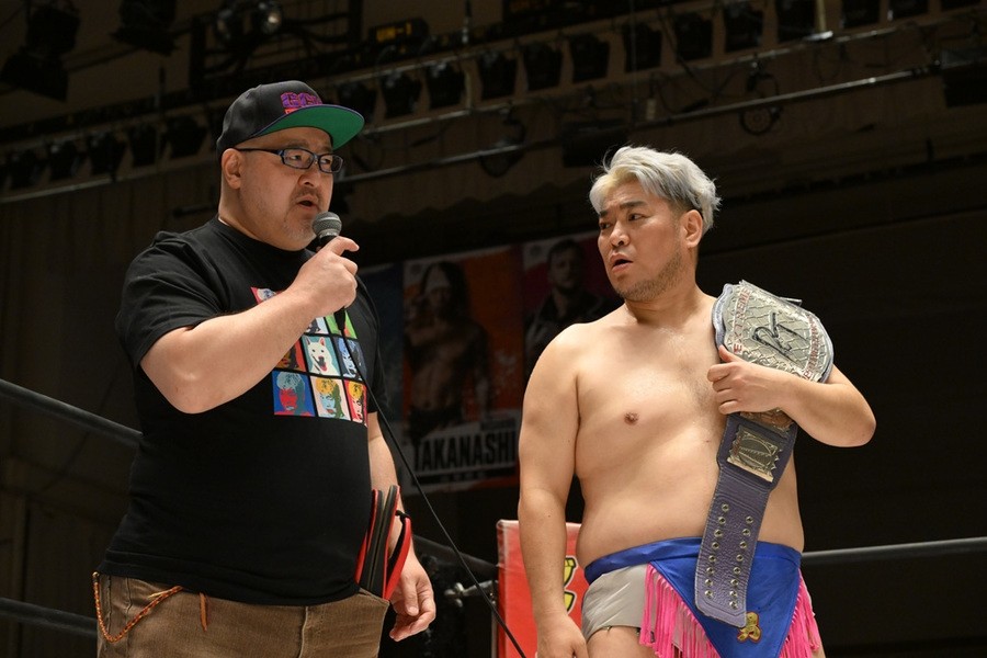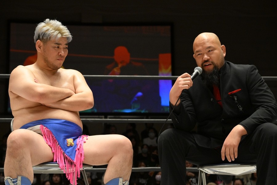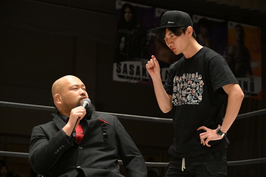 O-カーンは「新日本じゃできない、DDTでもやったことない、ひでぇ試合がやりたい。もう両国国技館が借りれないような」と発言。さらに「いくつもある。いくつかは当日のお楽しみということで、1個用意してきたものがある。余はアニメが好きだから、声優をセコンドに連れてきたいと思って。実はそのセコンド呼んでるんだ」と言うや、ディーノに唇を奪われたことがある若手イケメン声優の熊谷健太郎が登場。熊谷はDDTのTシャツを着ていたが、O-カーンは「余に忠誠を示せ」とUNITED EMPIREのTシャツを渡し、熊谷が袖を通した。