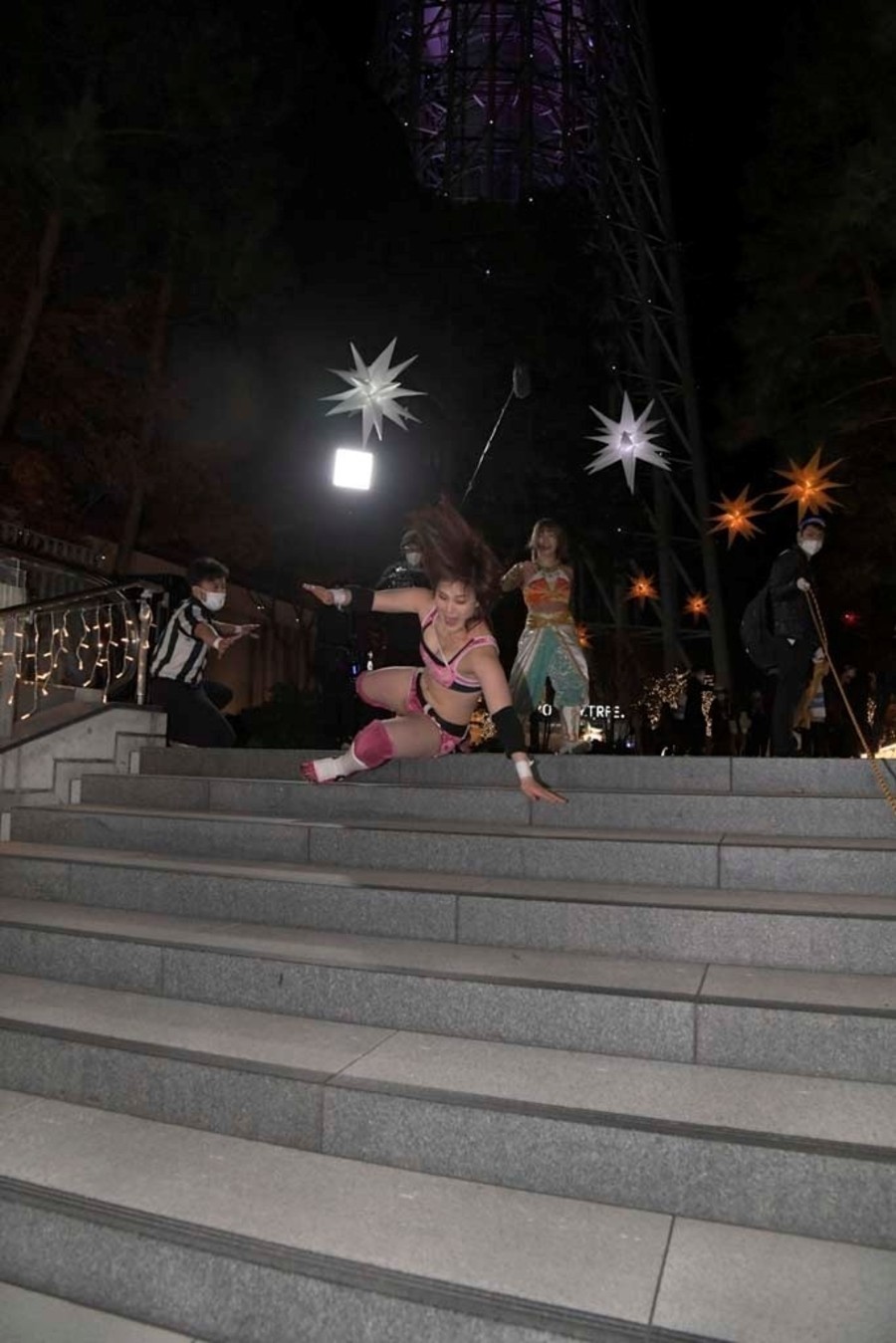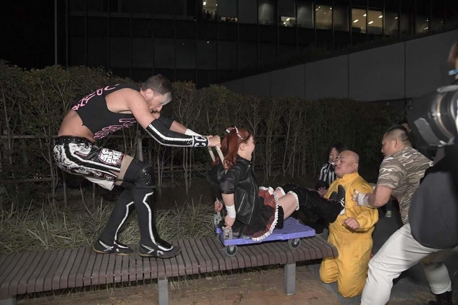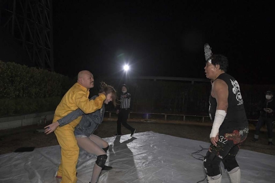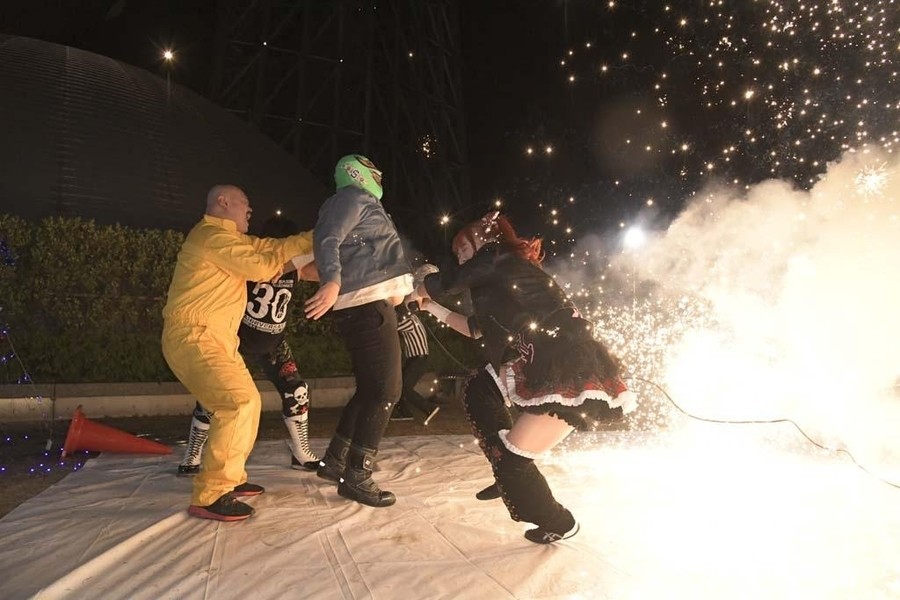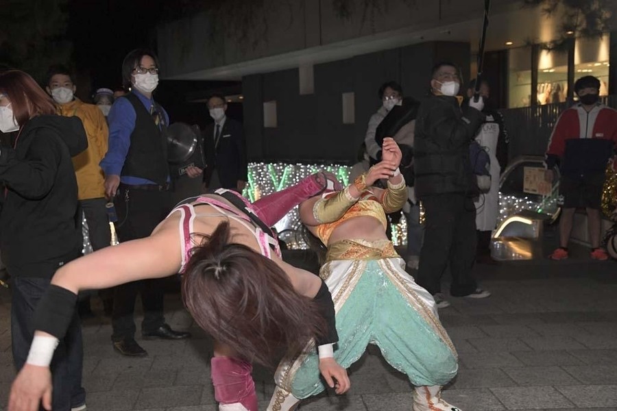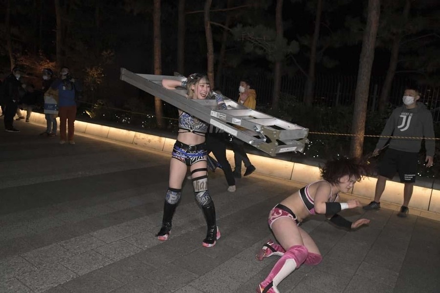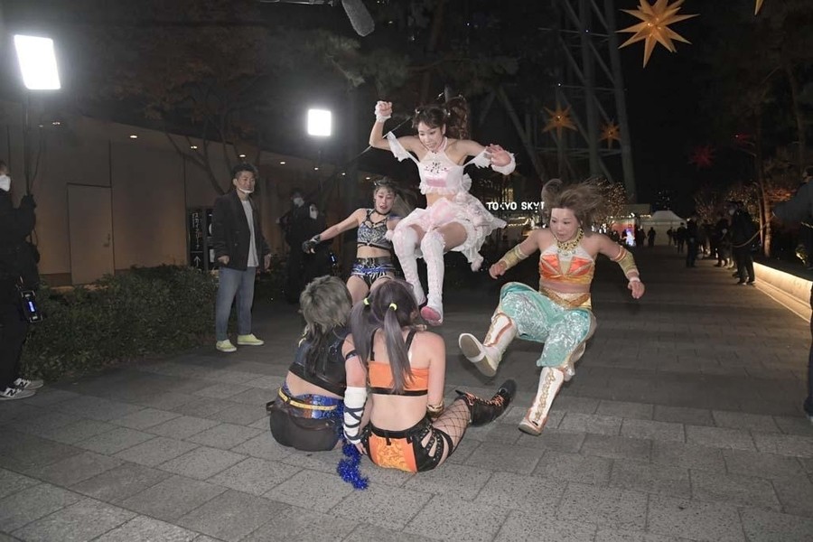 スカイツリーのふもとにジャングルポケットの太田さん。前回のとしまえんでの電流爆破マッチを振り返りながら、今回も戸惑いの表情を浮かべつつもスタートの掛け声で開始。オープニングVTRの後、シャトーアメーバスタジオから実況&解説の村田晴郎さんと今林久弥アシスタントプロデューサーが挨拶。東京ソラマチ前の太田さんのところに坂崎が登場。2人でソラマチを歩くことに。歓談しつつ階段を上っていき、ソラミ坂にやって来ると、そこには坂崎以外の5選手が揉めている。坂崎がコートを脱ぎ捨てコスチューム姿になると、井上マイクリングアナウンサーが現れ選手コール。いきなり大乱戦で試合スタート。ヒカリがマリカの自撮り棒を奪い、首を締め上げる。さらにヒカリはマリカにローリングクレイドルをしかける。一般のお客さんが行きかう中、あちらこちらで闘いを繰り広げる6選手。のどかがボディスラムで瑞希を床に叩き付ける。その光景に太田さんがうろたえまくる。瑞希がイルミネーションにのどかを叩きつけようとするが、のどかは踏ん張る。ソラミ坂の階段の上で坂崎と山下が打ち合い。坂崎が垂直落下式ブレーンバスターで石畳に叩きつける。真横を一般のお客さんが通る中、坂崎と山下が打ち合い。山下がハイキックからクラッシュラビットヒートを狙うが、坂崎がかわして階段に山下を突き落とす。山下が階段落ち。坂崎と瑞希とヒカリが長距離を走ってドロップキックで相手3人を攻撃。山下が坂崎と瑞希を蹴散らす。のどかが坂崎と瑞希をタックルで吹っ飛ばすと、ヒカリがハシゴを持ち出しグルグル回転。相手チームを弾き飛ばしていく。さらにハシゴを投げ付ける。スカイツリーのふもとに移動してくると、坂崎と瑞希がハシゴからダブルのダイビング・ボディアタックを敢行。坂崎がマリカに助走をつけてスライディング・ラリアットを叩き込むと3カウント。