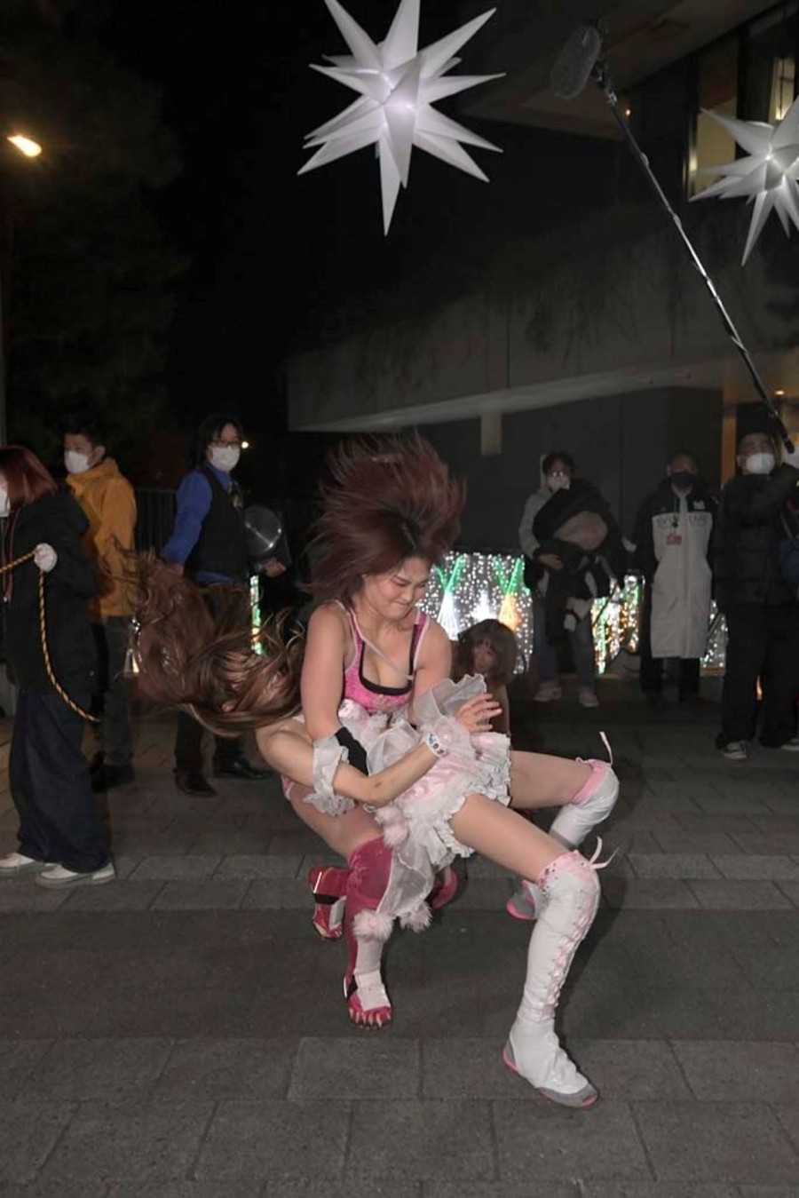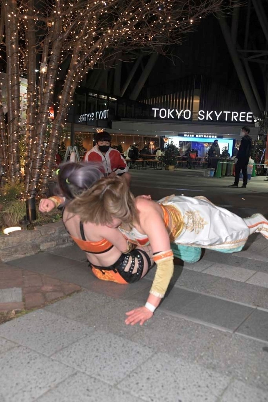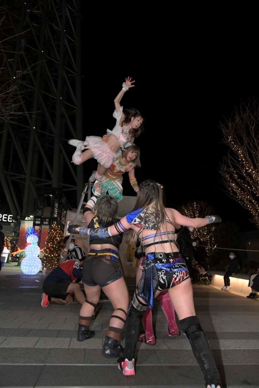 スカイツリーのふもとにジャングルポケットの太田さん。前回のとしまえんでの電流爆破マッチを振り返りながら、今回も戸惑いの表情を浮かべつつもスタートの掛け声で開始。オープニングVTRの後、シャトーアメーバスタジオから実況&解説の村田晴郎さんと今林久弥アシスタントプロデューサーが挨拶。東京ソラマチ前の太田さんのところに坂崎が登場。2人でソラマチを歩くことに。歓談しつつ階段を上っていき、ソラミ坂にやって来ると、そこには坂崎以外の5選手が揉めている。坂崎がコートを脱ぎ捨てコスチューム姿になると、井上マイクリングアナウンサーが現れ選手コール。いきなり大乱戦で試合スタート。ヒカリがマリカの自撮り棒を奪い、首を締め上げる。さらにヒカリはマリカにローリングクレイドルをしかける。一般のお客さんが行きかう中、あちらこちらで闘いを繰り広げる6選手。のどかがボディスラムで瑞希を床に叩き付ける。その光景に太田さんがうろたえまくる。瑞希がイルミネーションにのどかを叩きつけようとするが、のどかは踏ん張る。ソラミ坂の階段の上で坂崎と山下が打ち合い。坂崎が垂直落下式ブレーンバスターで石畳に叩きつける。真横を一般のお客さんが通る中、坂崎と山下が打ち合い。山下がハイキックからクラッシュラビットヒートを狙うが、坂崎がかわして階段に山下を突き落とす。山下が階段落ち。坂崎と瑞希とヒカリが長距離を走ってドロップキックで相手3人を攻撃。山下が坂崎と瑞希を蹴散らす。のどかが坂崎と瑞希をタックルで吹っ飛ばすと、ヒカリがハシゴを持ち出しグルグル回転。相手チームを弾き飛ばしていく。さらにハシゴを投げ付ける。スカイツリーのふもとに移動してくると、坂崎と瑞希がハシゴからダブルのダイビング・ボディアタックを敢行。坂崎がマリカに助走をつけてスライディング・ラリアットを叩き込むと3カウント。