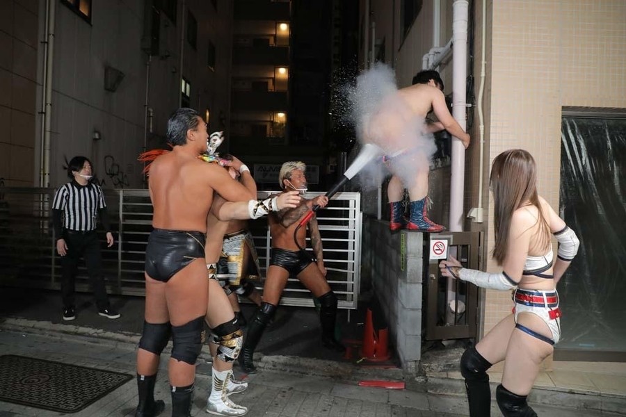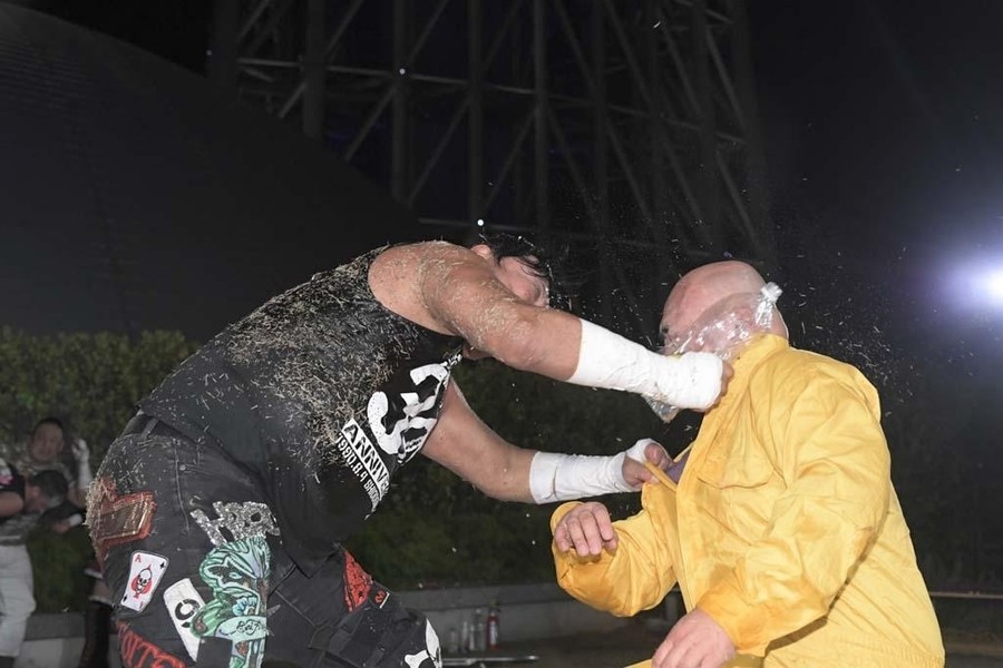 都議会議員・川松真一朗さんの呼び込みで大仁田が高木&クリス&伊藤と共に入場。水をまき散らす。続いてクロちゃんが青木&ササダンゴ&上福と入場。クロちゃんは入場するなり大仁田を挑発。選手コールが終わる前に大仁田が怒りの奇襲、開始のゴング。両陣営が様々な場所で乱闘を繰り広げる中、クロちゃんは逃げ惑う。高木とクリスがクロちゃんを捕まえると、伊藤が安全バーで一撃。さらにビンタ。大仁田が安全バーと有刺鉄線バットでクロちゃんの急所を攻撃していく。クリスが伊藤を台車に乗せ、クロちゃんにダッシュで強烈なドロップキック。大仁田がクロちゃんを押さえ、伊藤が電流爆破バット攻撃を狙う。しかしそこにササダンゴが割って入り、伊藤の電流爆破バットで大仁田&クロちゃんもろともササダンゴを爆破。大仁田がクロちゃんを押さえこむがカウント2で上福がカット。瀕死のクロちゃん。ササダンゴが「上福さんの膝には元気にする成分が含まれています!」と言い出し、膝を舐めさせるように依頼。上福がタイツを破り膝を差し出すと、クロちゃんが一心不乱に上福の膝を舐めまくる。するとクロちゃんが覚醒。その横で大仁田が青木にパイルドライバー・オン・ザ・テーブルを見舞う。大暴れのクロちゃんだが、高木がベルトで首を絞めて動きを止めると、ハシゴから伊藤が背面ダイブを決める。そして高木とクリスがクロちゃんの足を開かせ、大仁田が電流爆破バットで股間を一撃しようとするが、上福がギリギリのところで爆破のスイッチを切る。ササダンゴと青木が飛び込むと、大仁田を羽交い絞め。そこに上福とクロちゃんが2人で電流爆破バットで一撃。大爆発し、大仁田は大ダメージ。伊藤が羽交い絞めにするササダンゴをカラーコーンで狙うが、これは避けられ伊藤に誤爆。大仁田がクロちゃんにイス攻撃を狙うが、これは避けられ高木に誤爆。大仁田が電流爆破バットを手にクロちゃんに一撃狙うが、クロちゃんは上福を盾にすると、大仁田も躊躇。そこに青木が背後から大仁田を襲撃し、ササダンゴと共にクロちゃんが電流爆破バットで大仁田を一撃。大爆発が起こり大仁田もダウン。クロちゃんがカバーすると、爆破バット2発を食らってしまった大仁田は返すことが出来ず3カウント。大仁田がクロちゃんにまさかの敗戦となってしまった。