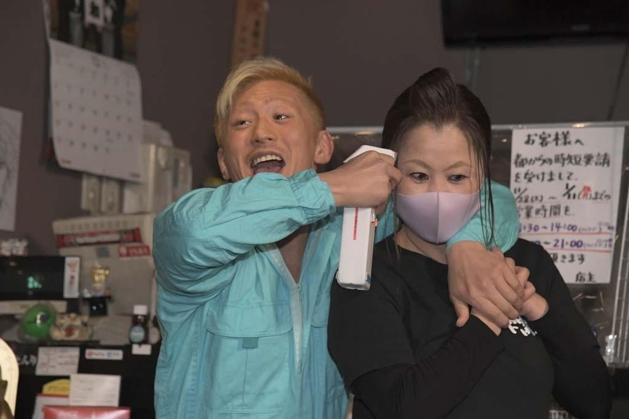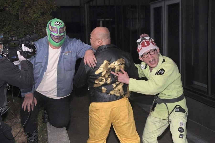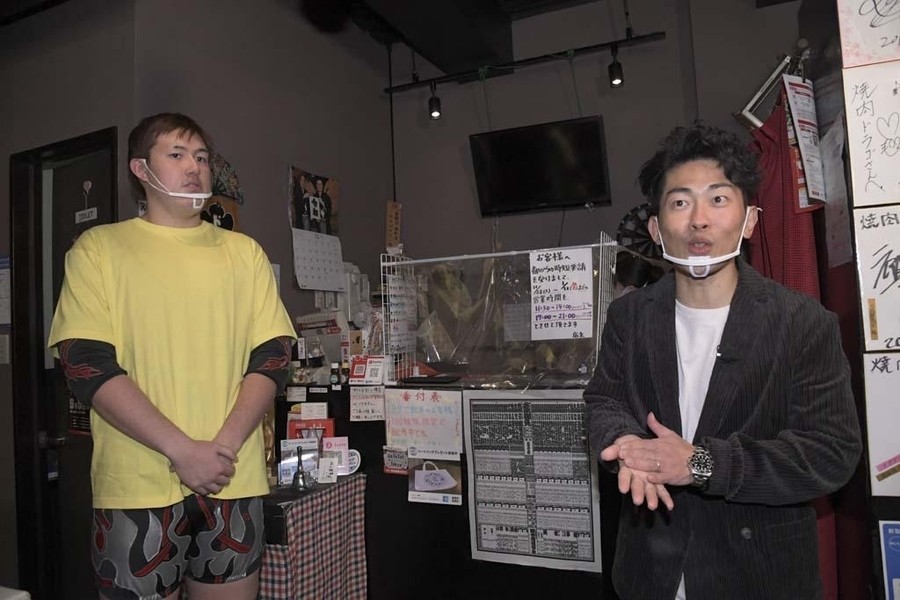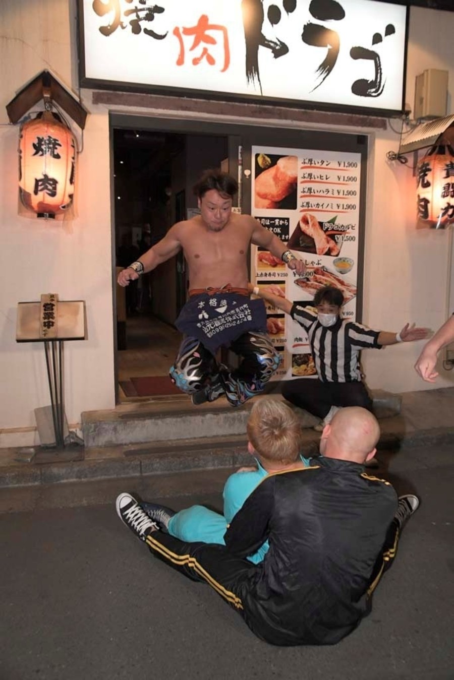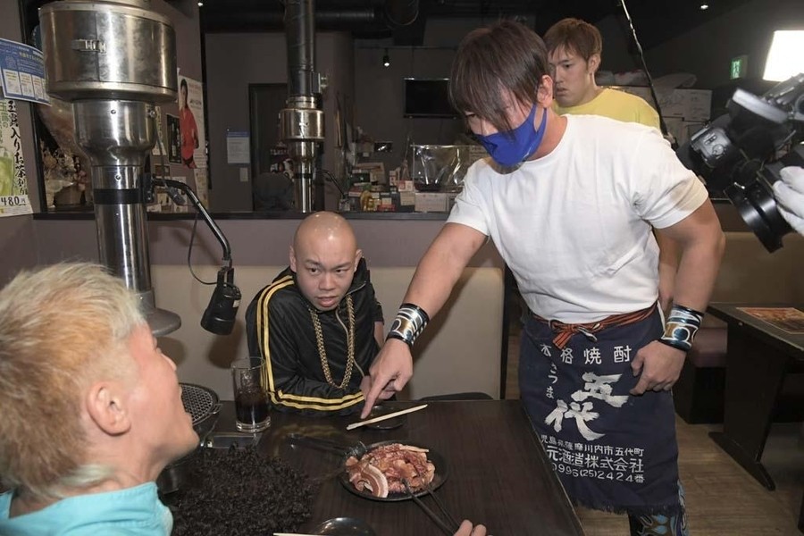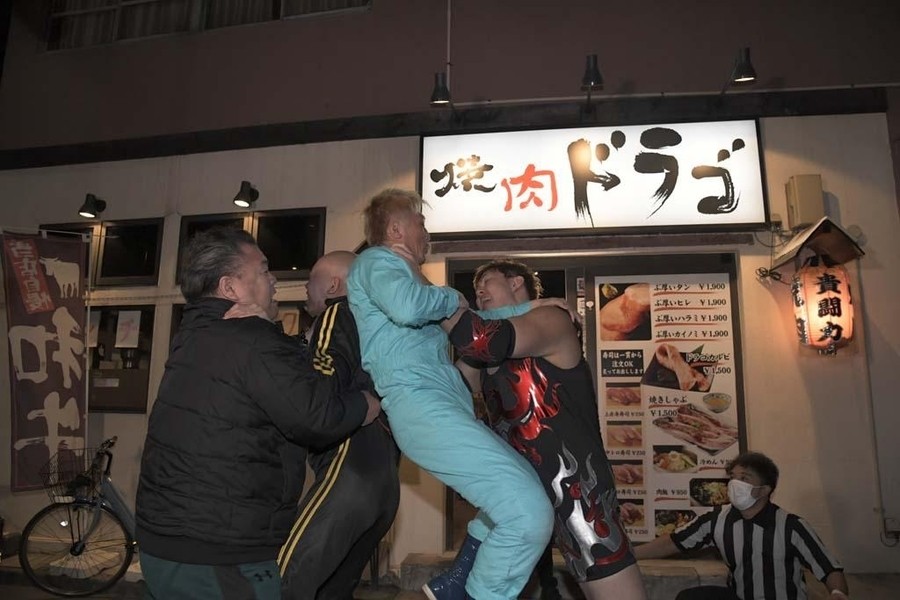 ジャンポケの太田さんが焼肉ドラゴ東京スカイツリー駅前店へ。そこで納谷が太田さんをお出迎え。2人がオススメのお肉を紹介していると、店内で揉め事が。肉に髪の毛が入っていたといちゃもんをつける大石と中村、それに怒った店員のHARASHIMAがTシャツを脱ぎ捨て試合開始のゴング。HARASHIMA&試合を優位に進め、コブラツイスト二重奏を決め勝利も目前。しかしここでなんと大石が店員の女性を人質に取る暴挙。抵抗の出来ないHARASHIMAに中村が焼き網に顔を押し付けようとすると、店の奥から怒りの貴闘力さんが登場。大石に一撃し、中村と共に外に連れ出すと、貴闘力さんと納谷が相手2人をのど輪に捕らえるとぶつけ合わせる合体攻撃。そこにHARASHIMAが店内から蒼魔刀を決めると、大石と中村も返せず3カウント。