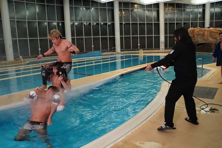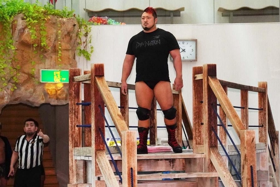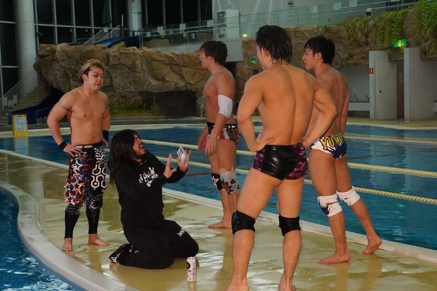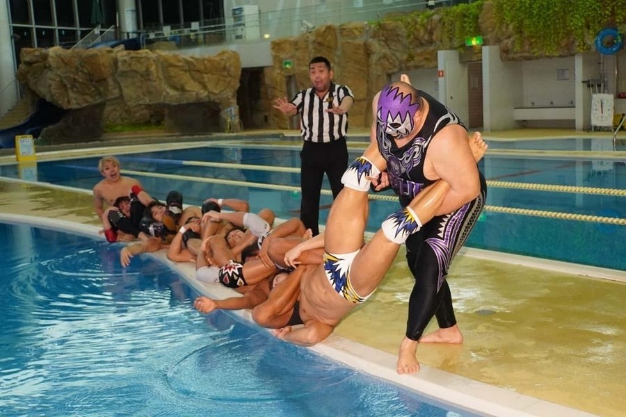 ジャンポケおたけさんの呼び込みでサウナ部とDAMNATIONが入場。ポーリー、大和、竹下、勝俣がプールサイドに立ちゴングが鳴るとまさかの水泳対決。25mを大和とポーリー圧勝する。試合終了の雰囲気になり、おたけさんがプロレスをするようにお願いすると、佐々木が金銭を要求。サウナ部までもおたけさんのポケットマネーを懸けることを要求し、おたけさんが財布から現金を取り出すと、この試合を懸けることでプロレスでの再試合が決定。両陣営が入り乱れる中開始のゴング。両チームが次々と首4の字固めで繋がっていく。そこにポーリーが逆エビ固めをかけて反転させると全員がプールにドボン。プールから上がると一同はウォータースライダーの上へ。遠藤が上野をウォータースライダーに突き落とそうとすると、上野は耐える。ならばと遠藤が回転エビ固めをしかけると、2人もろともウォータースライダーで滑っていってしまう。松井レフェリーも滑って追いかける。そこから両チームが次々とウォータースライダーで滑っていく。ウォータースライダーの下にいる一同のところに大量のアヒルが流れて来ると、MAOが浮き輪に乗って突っ込んで来る。勝俣が大和を連れ水風呂のところに連れて来るとイスに座らせ、ロウリュで風を送るが、サウナでないため大和は震え上がる。大和を水風呂に突っ込ませると、大和は震え上がる。しかしDAMNATIONが勝俣を水風呂に入れると「ととのったー!」と叫ぶ。浅いプールでMAOと遠藤が丸め込み合戦になるが、どちらも息が出来なくなり死にかける。流れるプールで上野が勝俣を肩車して大和を追いかけるが、桟橋に激突して勝俣は転落。それでも勝俣と上野が浮き輪を使って大和を逆さにしてスケキヨ状態で痛めつけると、勝俣と上野を竹下が3連肩車で担ぎ上げ合体攻撃を狙う。そこに佐々木が高圧洗浄機で妨害すると肩車が崩壊。高尾を竹下&上野&MAOが担ぎ上げると、勝俣がカッターで飛び付きプールへ。次々と両チームが技を決めながらプールに突っ込んでいく。ポーリーが桟橋からボディプレスを放つも、避けられ自爆。桟橋の上から竹下がキン肉バスターで大和をプールに沈める。DAMNATIONの面々が沈められ、いよいよ残るは佐々木。サウナ部が全員で佐々木に詰め寄り、プールに沈めようとしたところで突如曲がヒットし、DAMNATIONのTシャツを着た火野裕士が登場。サウナ部を次々と蹴散らしていくと、ポーリーと共に勝俣を桟橋の上で追い詰めると、桟橋の上からファッキンボムでプールに投げ捨てる。そこに遠藤が桟橋の上からシューティングスター・セントーンを投下すると、勝俣も返せず3カウント。