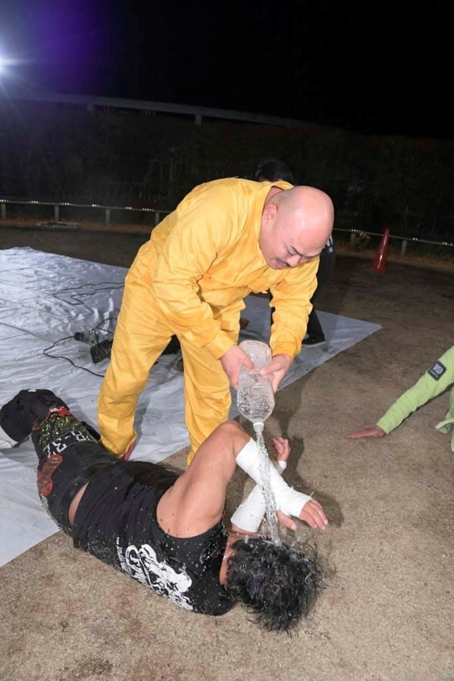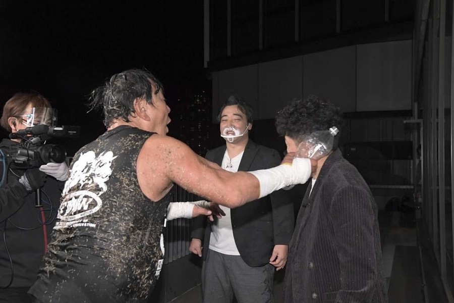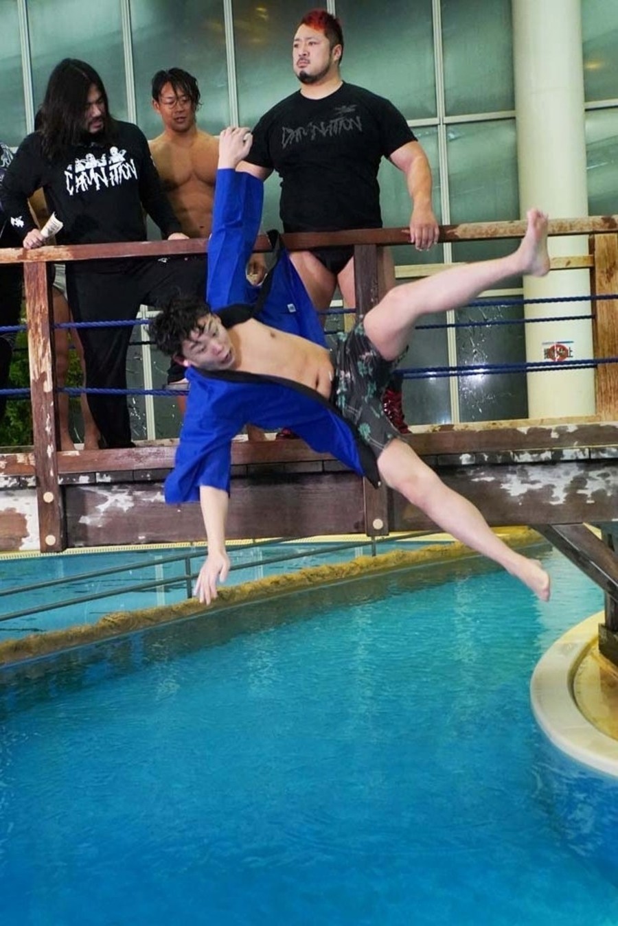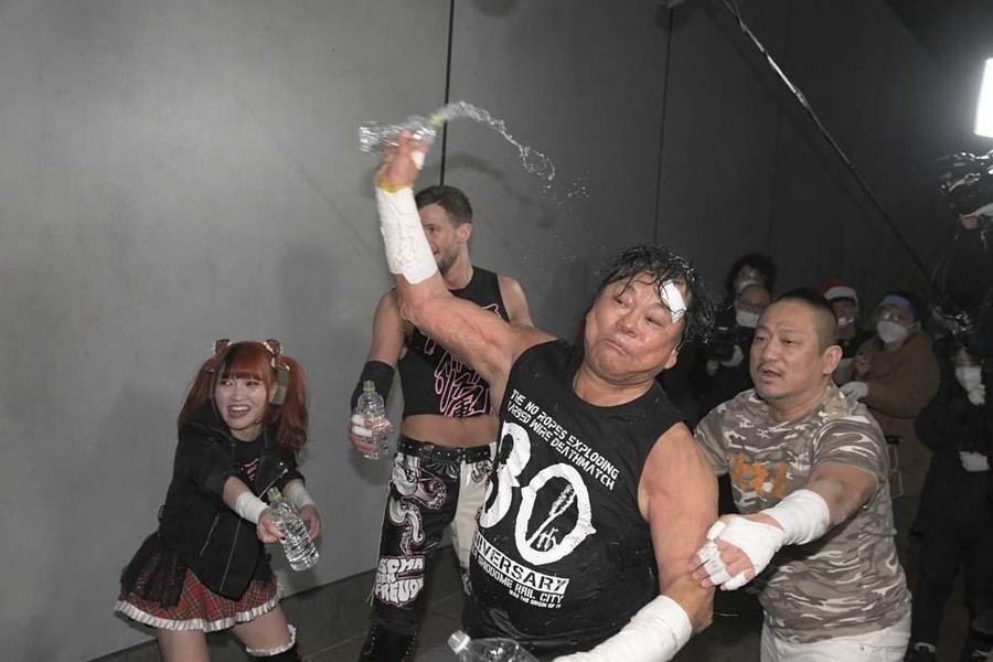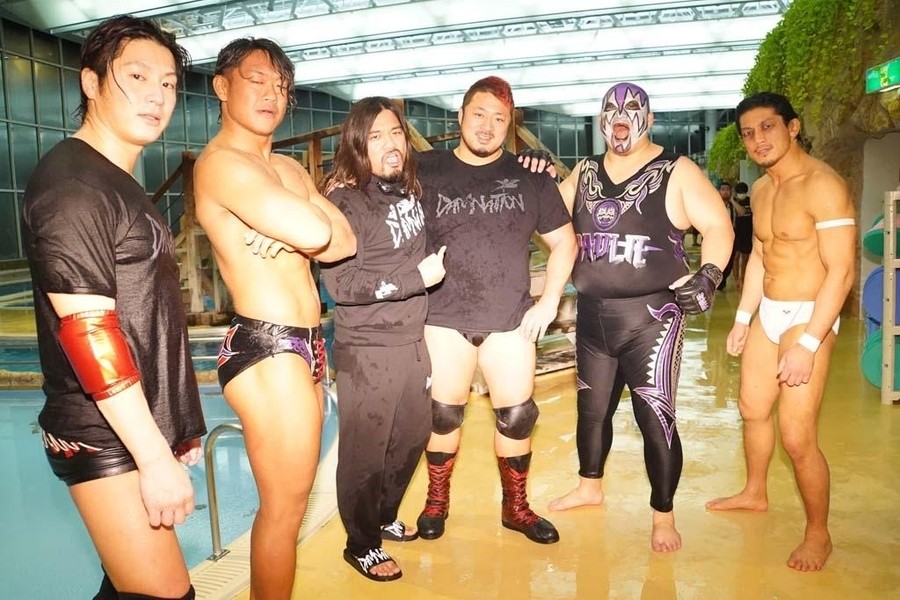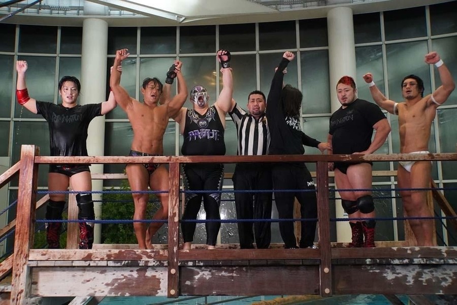 DAMNATIONが勝ち名乗りを受け、おたけさんから現金を強奪。そして佐々木が「DAMNATION新メンバー、俺の軍人時代の仲間、火野裕士!」と紹介。12月27日後楽園からの参戦を電撃発表した。さらに火野は許しを請うおたけさんを桟橋からプールに投げ捨てると、DAMNATION一同は高笑い。