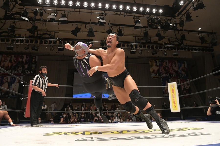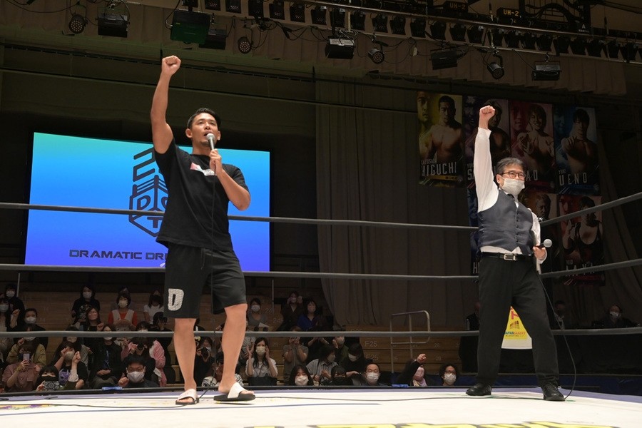 そして、「赤いの、テメエのせいで思い出した。ノアの赤いの、拳王! 今回だけだ。サイバーファイトフェス、さいたまスーパーアリーナ(6月12日)。佐々木大輔がDDTを背負って、オマエの前に立って、ぶっ潰す。覚えとけ」と一騎打ちを行う拳王を挑発した。