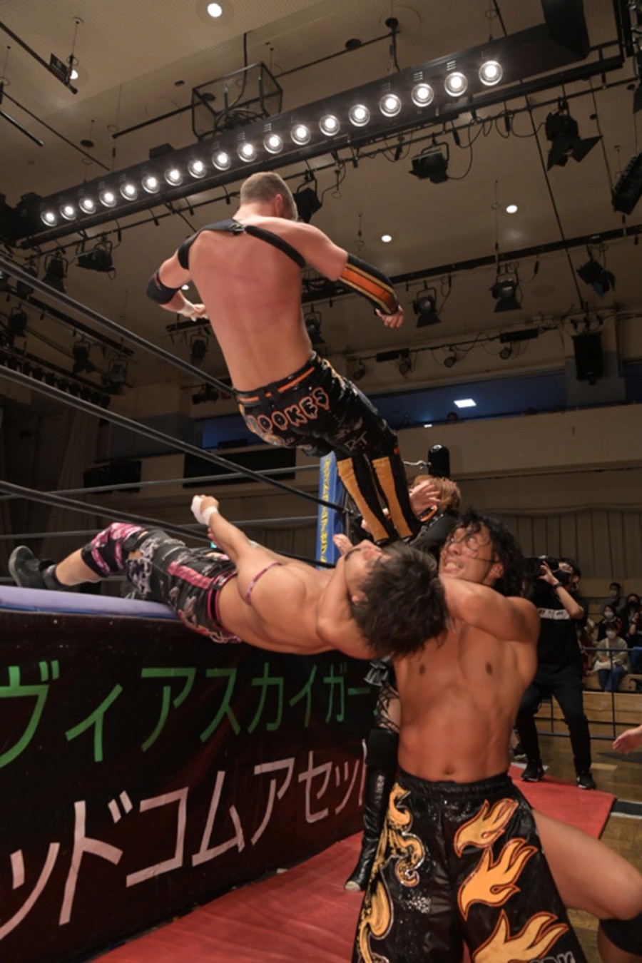 序盤、CDKは入場ゲートをMAOの体の上に倒して動けなくすると、その間、朱崇花がローンバトルをしいられた。脱出したMAOは入場ゲートの上からクリスにムーンサルトアタックを敢行すると、朱崇花は高梨にミサイルキック、ハイキック、ライガーボムで猛攻。その後、両軍とも、合体技の応酬で一進一退となるが、朱崇花が場外のCDKめがけて強烈なミサイルキックを繰り出した。MAOがみちのくドライバーⅡをクリスに見舞うもカウントは2。クリスも丸め込みで返していくが、MAOが竜巻旋風脚から、走り込んでの大阪臨海アッパーをクリスのアゴに叩き込み、3カウントを奪取した。