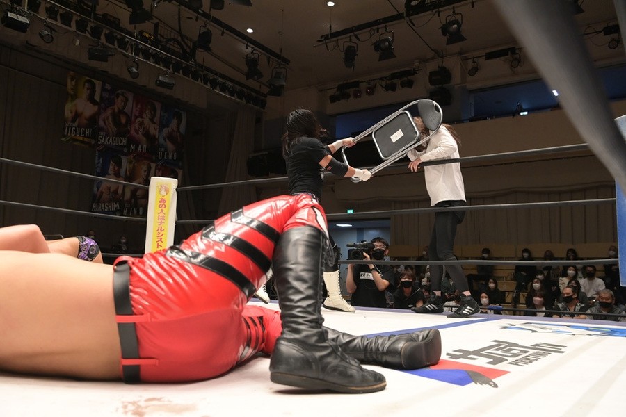 6人タッグ王座に思い入れがあるイラプションは序盤から積極果敢に攻め込んだ。15分過ぎ、岡谷がKANONにノーザンライト・スープレックスから、ダブルアーム・スープレックスを繰り出して、決めにいくも、セコンドの藤田がレフェリーの足を引っ張って阻止。ここぞとばかりに、ポーが岡谷、坂口にイス攻撃、佐々木はセコンドの赤井沙希の側頭部にイスを叩き込んで形勢逆転。岡谷も必死で食い下がるも、ダイビング・ニードロップが自爆すると、KANONがラリアットから旋回式ブレーンバスター。佐々木がペディグリーからクロス・フェースロックで絞め上げると、たまらず岡谷がギブアップを喫した。