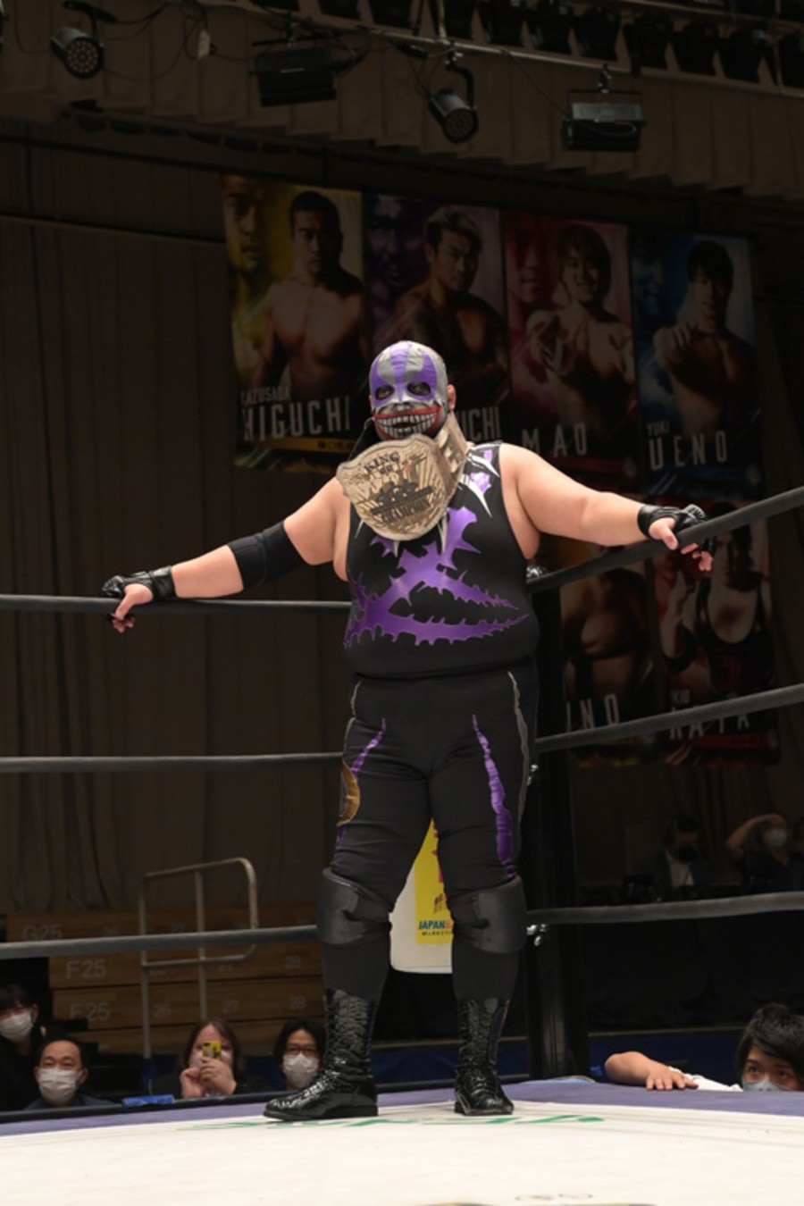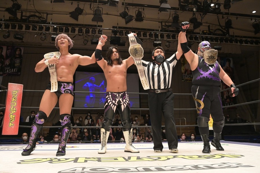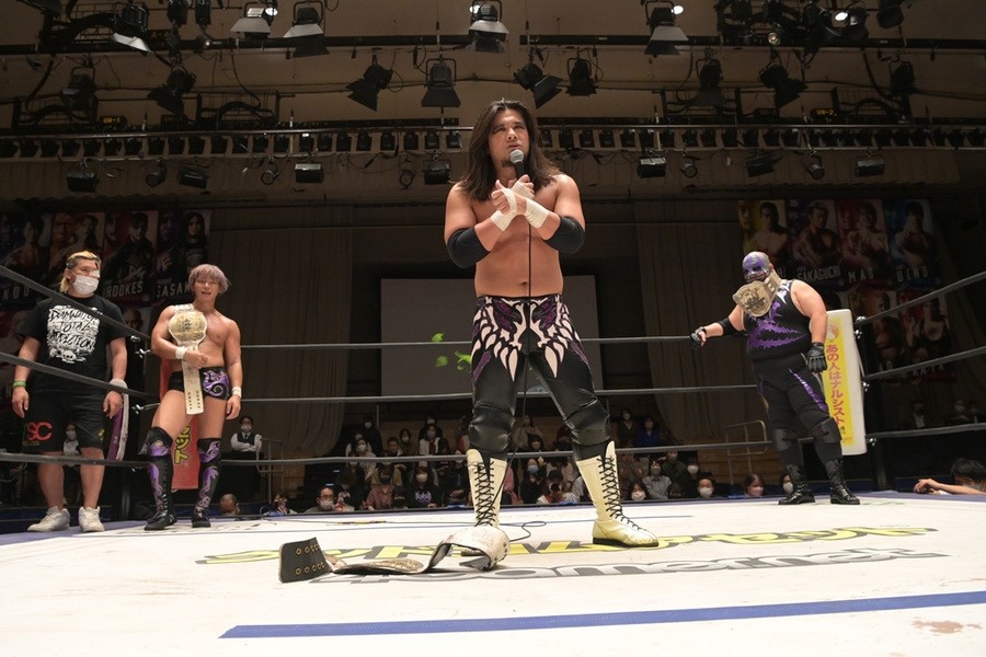 5月22日、東京・後楽園ホールで「Audience 2022」が開催。KO-D6人タッグ王座決定トーナメント決勝戦はDAMNATION T.A(佐々木大輔、MJポー、KANON)がEruption(樋口和貞、坂口征夫、岡谷英樹)を破り、王座に返り咲いた。