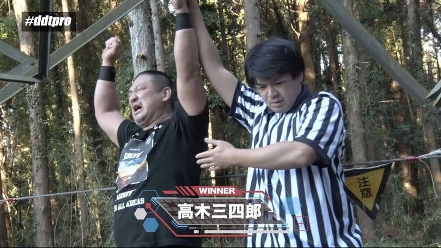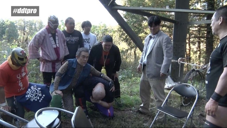 するとディーノが残る四天王の2人の投入を予告。ランボーと高木は肉焼きの上に網を被せて弔う。最終決戦の地にやって来た高木とランボーの前に、有路明憲が登場。そしてレフェリーシャツを脱いだヘン・チーナも試合に参加を宣言。高木&ランボーvs有路&ヘン・チーナのタッグマッチが行われることとなった。いつの間にか先ほどのサラリーマンがレフェリーになっており開始のゴング。いきなりの大乱戦。ヘン・チーナがブブゼラを吹きまくれば、高木は取り上げたブブゼラで殴打していく。有路がランボーにアルゼンチン・バックブリーカー、高木がヘン・チーナを投げ付けカットする。ヘン・チーナが高木にサイリウム指折り、さらにゴムパッチン攻撃を放つ。これは高木がカウント2で返す。ランボーは有路に毒草を食わせていきダウンさせると、ヘン・チーナに高木とともにクロスボンバーを決める。カウント2で井上がビッグファイヤーでカットする。もう一発狙った井上にランボーが突っ込み、口を塞ぎアルコールを飲み込ませる。復活した有路とヘン・チーナが高木にサイリウムが立てられたテーブルにダブルブレーンバスターを決めるが、カウント2でクリア。高木が有路に机を投げ付け、ヘン・チーナにはイスで作った城に突っ込ませようとするも、振り返され高木が城に突っ込み落城。しかし高木はイスで有路の背中に一撃加えると、さらに頭部にもう一撃加えイスをぶち抜く。ランボーが弓矢で有路の頭を射抜くと、高木が組み上げたイスの上にスピコリドライバーを決め3カウントを奪取。
