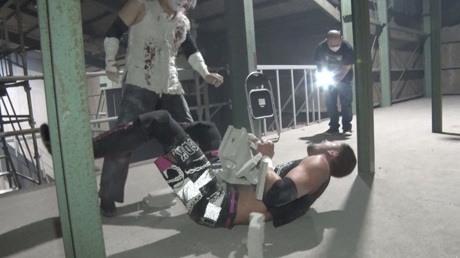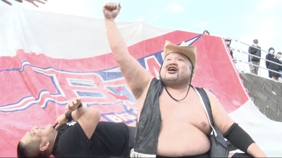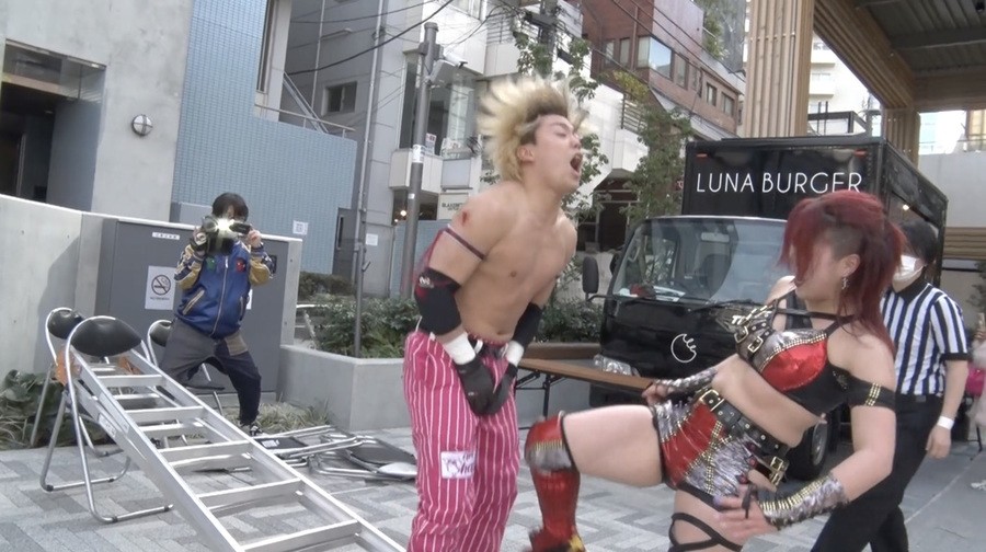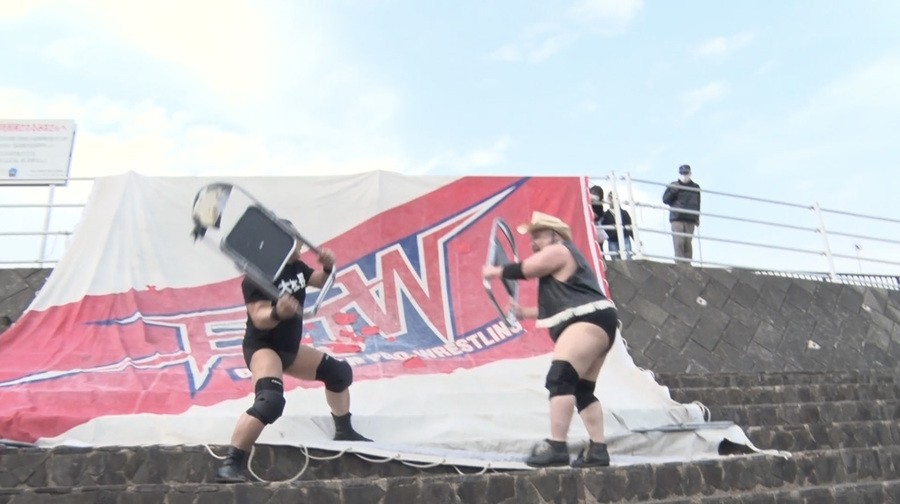 渋谷の公園にて行われた勝俣瞬馬<千葉代表>と鈴季すず<宮崎代表>の一戦は、昼間の公園には似つかわしくないほどの過激な凶器が続出。周囲の観衆が騒然とする中、最後は勝俣がテーブルにすずを寝かせ、ラダーからのととのえスプラッシュ、サウナトランス・スプラッシュを決め3カウント。悔しそうな表情を浮かべたすずはリベンジを誓っていた。