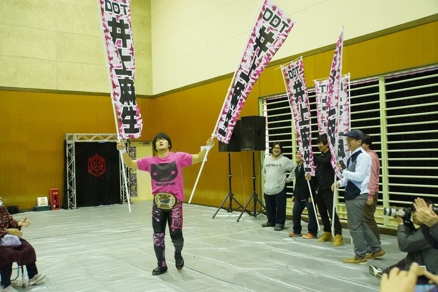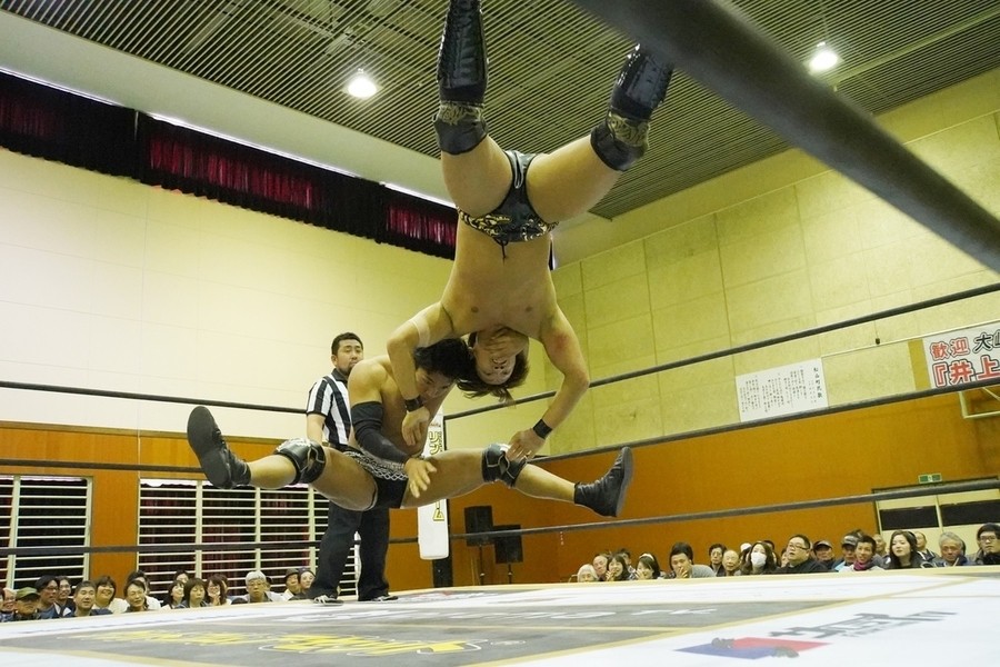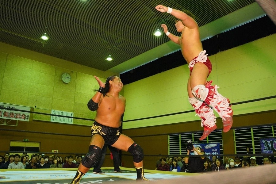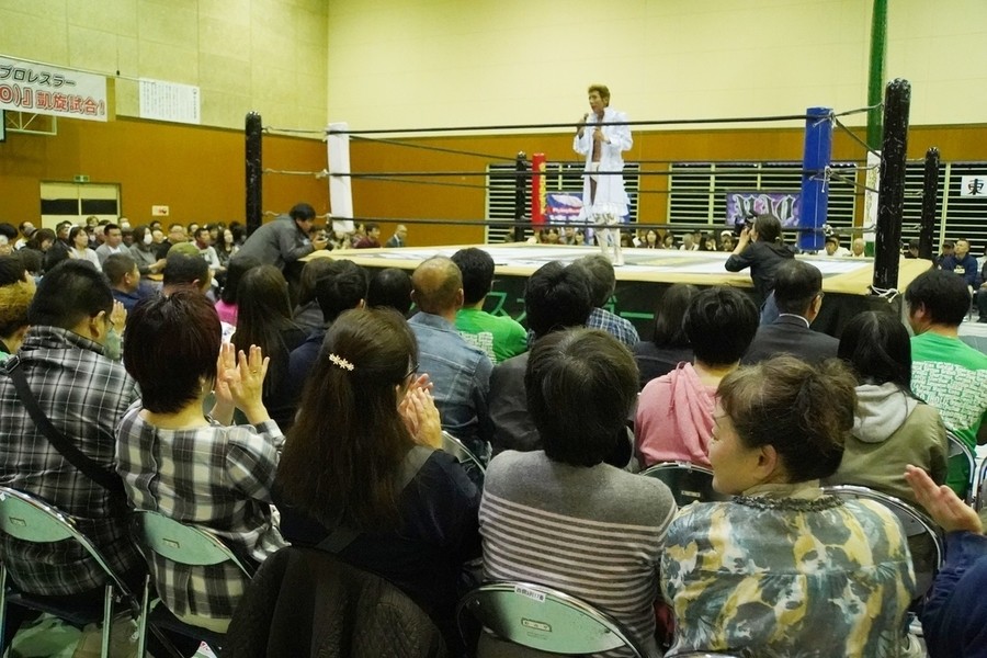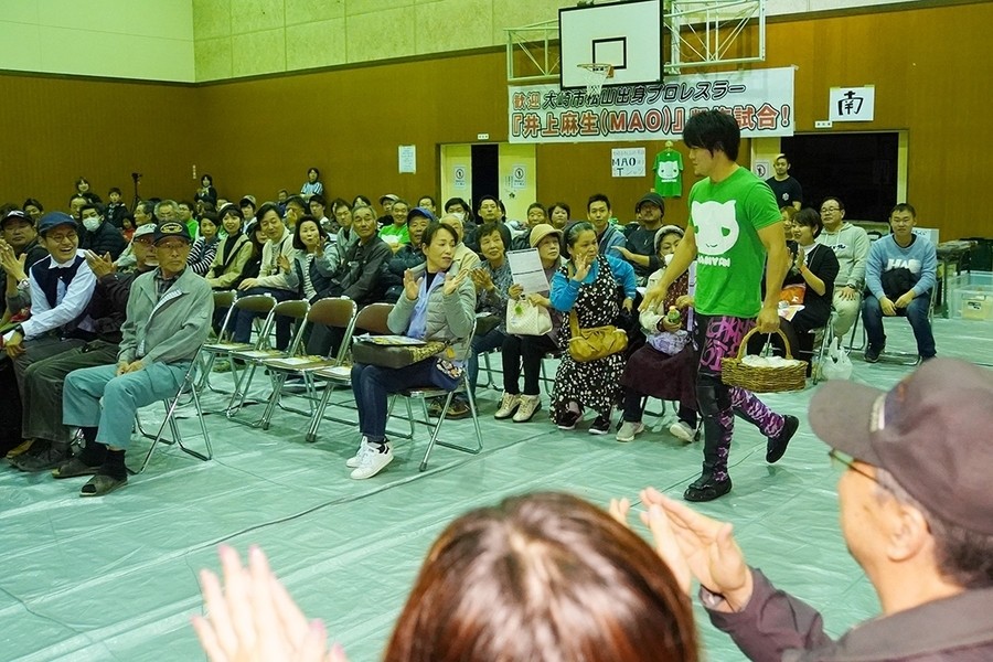 MAO 結構……プロレスが来るっていうのが、恐らく93年以来(笑)。そもそもそんなに娯楽が来ない。何かスポーツが来るとこんな感じで毎回お祭りっぽくなるんですけど、認知してもらうための活動ですね。インターネットもなかなか通用する土地でもないので、どうしても平均年齢が高い田舎の町なのでインターネットが使えない点では、自分の足で運んでってところが大変でしたけど、そこで撒いた種がちゃんと咲いてよかったです。