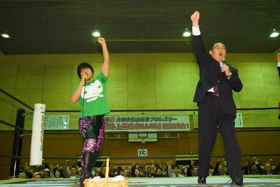 勝ったMAOはマイクを持つと「まずたくさんの、たくさんの、たくさんの、たくさんのご来場ありがとうございます! そして樋口さん、前回の仙台に続き、ありがとうございます」と言うと、樋口は「MAO、おめでとう! それも駆け付けてくれた皆さんのお陰です! ありがとうございます!」と凱旋試合を勝利したMAOを祝福。MAOは「先の大崎市松山大会、これは大成功と言っていいでしょうか?(大歓声)これっきりにしたくないと思っていまして、大成功したので第2回もやっちゃっていいですかー?(大歓声)もっとグレードアップをしていい大会をここからやっていきたいと思います!」と挨拶すると、最後は「素直な気持ちをいいます。ワタシはここ大崎市松山で生まれ育ちましたので、松山が大好きです。そんな気持ちを言います。3、2、1、松山サイコー!」と叫んで凱旋大会を締めくくった。