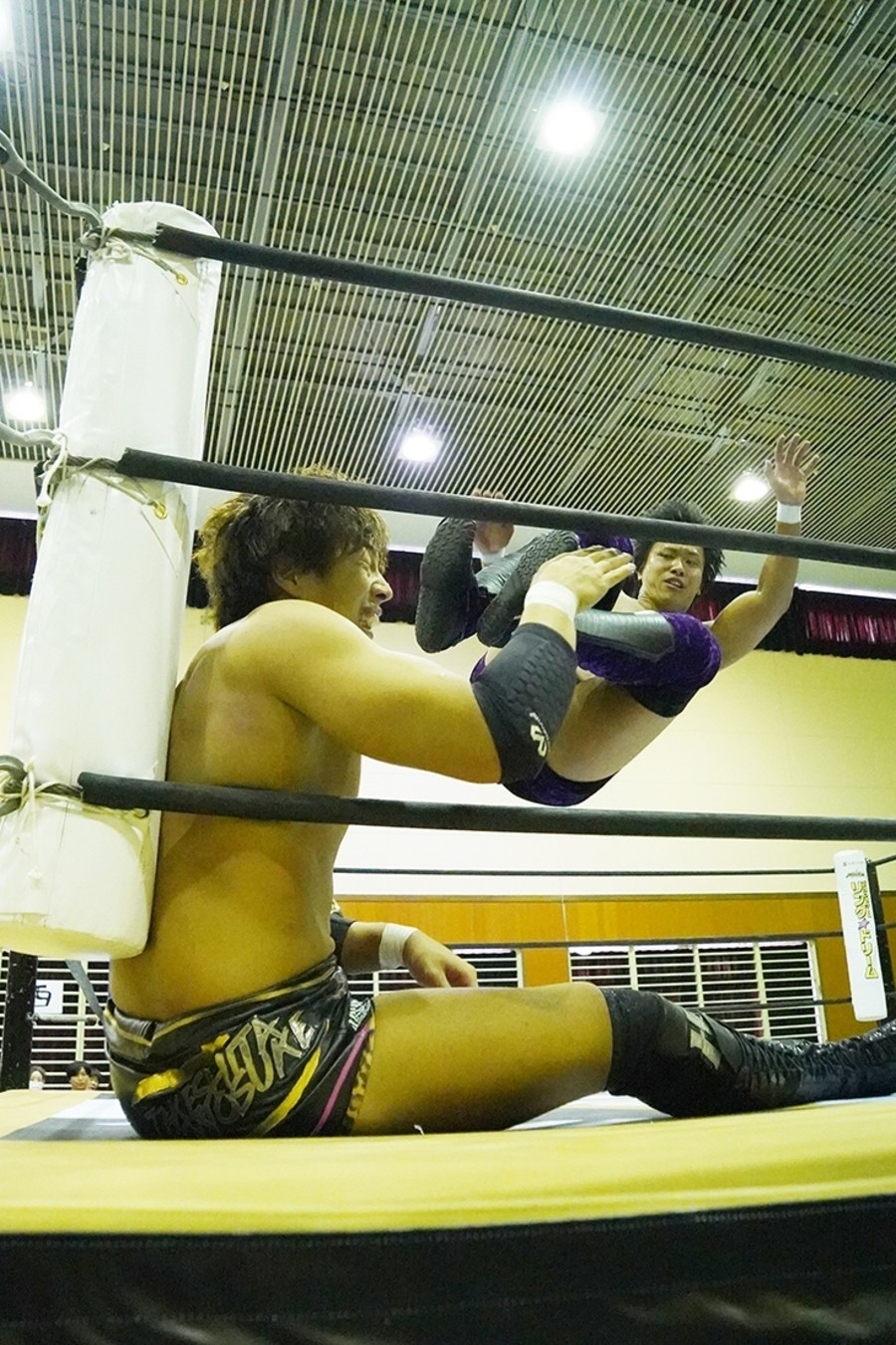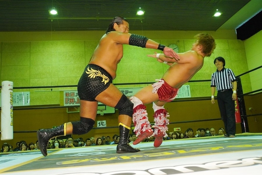 大鷲が高い位置で力比べを要求するが、島谷は当然届かない。ならばとコーナーに登ってより高い位置での力比べを要求した島谷。すると大鷲は低い位置での力比べを要求。翻弄された島谷は足を踏んづけてからショルダータックルでぶつかっていくが、逆になぎ倒した大鷲は倒れた島谷を踏んづける。さらに島谷のTシャツを脱がせてから逆水平チョップ、サッカーボールキック、スリーパー。WARスペシャルで追い込んだ大鷲だが、耐えた島谷はヒザへの低空ドロップキック。しかしボディスラムを押し潰した大鷲はのど輪の体勢。これを逃れた島谷はブレーンバスターで投げると、その場飛びシューティングスター。だが、コーナーからダイブした島谷をのど輪で捕まえた大鷲はのど輪落とし。カウント2で返した島谷だが、大鷲はブレーンバスターからののど輪落としで粘る島谷を仕留めた。