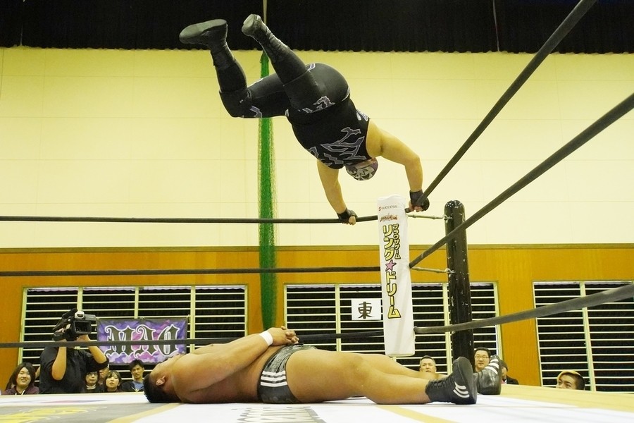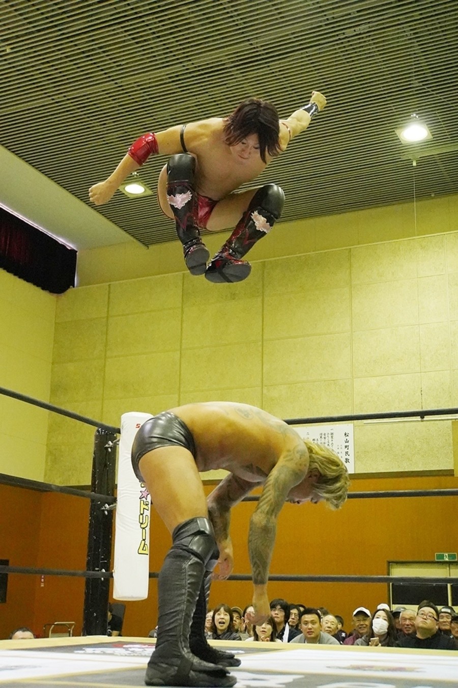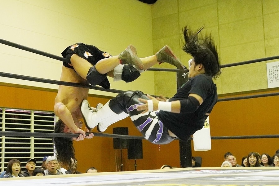 地元凱旋ということでノボリを掲げるファンがいる中、そのノボリを手に入場したMAO。たくさんの紙テープが飛び、花束も贈呈される。大歓声でリングインしたMAOは上野とスピーディーな攻防を展開すると、幼い頃見ていたみちのくプロレスではお馴染みの欽ちゃんジャンプ。さらに明らかにカウント2なのに、「スリーだろ!」とアピールしたMAO。MAOに合わせてロングタイツを着用した樋口がジャンピング・ボディプレスを投下すると、MAOとダブルのカウンターチョップからの空手ポーズ。さらにHARASHIMAと上野を叩き付けてから、「無敵だー!」と叫んでから樋口がMAOを肩車してガンバスター攻撃。しかし、かわされて自爆したためMAOが捕まってしまう。HARASHIMAはコーナー二段目にMAOを寝かせてフットスタンプ。MAOの腹部を集中攻撃すると、子供たちから悲鳴があがる。HARASHIMAがキャメルクラッチで追い込むと、上野が串刺し攻撃から逆片エビ固め。STFにスイッチした上野だが、MAOはどうにかロープに逃れる。MAOもアッパーカットを返すと、ランニングエルボーでなぎ倒して樋口にようやくタッチ。逆水平チョップから串刺しラリアット、ブレーンバスター、アトミックドロップと怒濤の反撃を見せた樋口はカナディアン・バックブリーカー。上野もドロップキックを返してHARASHIMAにタッチ。コーナーに登った樋口を蹴り上げたHARASHIMAは雪崩式ブレーンバスター。HARASHIMAの蹴りに対し、逆水平チョップで対抗した樋口。「痛くない!」と強がったHARASHIMAはジャンピングハイ。樋口もラリアットを返し、両者タッチ。MAOはパンチを見舞っていくが、「チョキだろー!」とアピール。そして上野を場外に追いやると、ノータッチトペコンを発射。リングに上野を戻したMAOはスリングショット式アトミコからハリウッドスタープレス。だが、HARASHIMAが飛び込んできてDISASTER BOXは連係攻撃。一気に上野は逆エビ固めに捉えるが、HARASHIMAに抑え付けられた樋口は、そのままHARASHIMAを引きずりながら近づいていき、逆水平チョップでMAOを救出。上野はコーナーに登っていくが、起き上がったMAOが突進。ジャンプしてかわした上野だが、MAOは串刺しニーから竜巻旋風脚。さらにみちのくドライバーI。HARASHIMAがカットしたが、樋口がラリアットで場外に叩き落とすと、MAOのスピンキックをかわした上野がエビ固め。MAOも切り返して押さえ込み合戦になるが、MAOはカウント3ギリギリでキックアウト。ジョン・ウーで吹っ飛ばしたMAOはみちのくドライバーII。そしてトドメのキャノンボール450°を投下して3カウント。