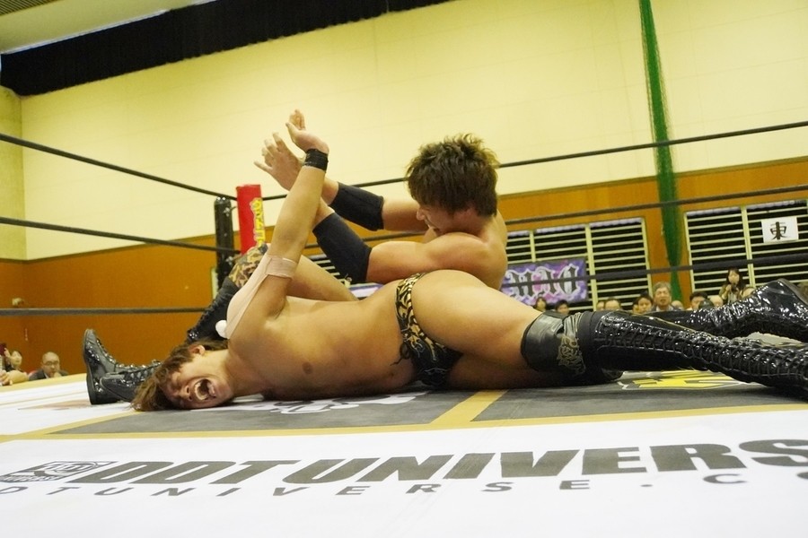 彰人と梅田のスピーディーな攻防から、竹下がリングインするなり渡瀬も入ってきてダブルのフロントキックで竹下を蹴散らす。だが、彰人はテーピングされた渡瀬の左肩を集中攻撃。竹下も当然渡瀬の左肩を狙っていき、ALL OUTペースに。レフェリーの目を盗みながらラフも織り交ぜていくALL OUT。イライラする梅田はセコンドの勝俣に八つ当たり。渡瀬も左腕を決められた状態で、ワンハンド・ボディスラムで叩き付けると、タッチを阻止しようとした竹下を場外に落とし、彰人にランニングエルボー。竹下が場外からタッチを阻止するが、梅田は鉄柱に叩き付ける。その間に渡瀬はブレーンバスターを狙った彰人を逆に投げ、ようやく梅田にタッチ。彰人をブレーンバスターで投げた梅田だが、梅田に気付かれないようにタッチしていた竹下が振り向いた梅田にミサイルキック。梅田もカウンターのミドルキックで竹下を吹っ飛ばして渡瀬にタッチ。カーフブランディングからRKOを決めた梅田が顔面ウォッシュをお見舞いすると、梅田も串刺し低空ドロップキック。しかし彰人が飛び込んできてALL OUTは連係攻撃。渡瀬は右腕だけでエルボーを打っていくが、竹下はカウンターのエルボーからヒザ。渡瀬もドロップキックを返すとタイガースープレックスを狙ったが、ここで竹下はグラウンドに持ち込みリバースダブルアームバーに捉えて渡瀬からギブアップを奪った。