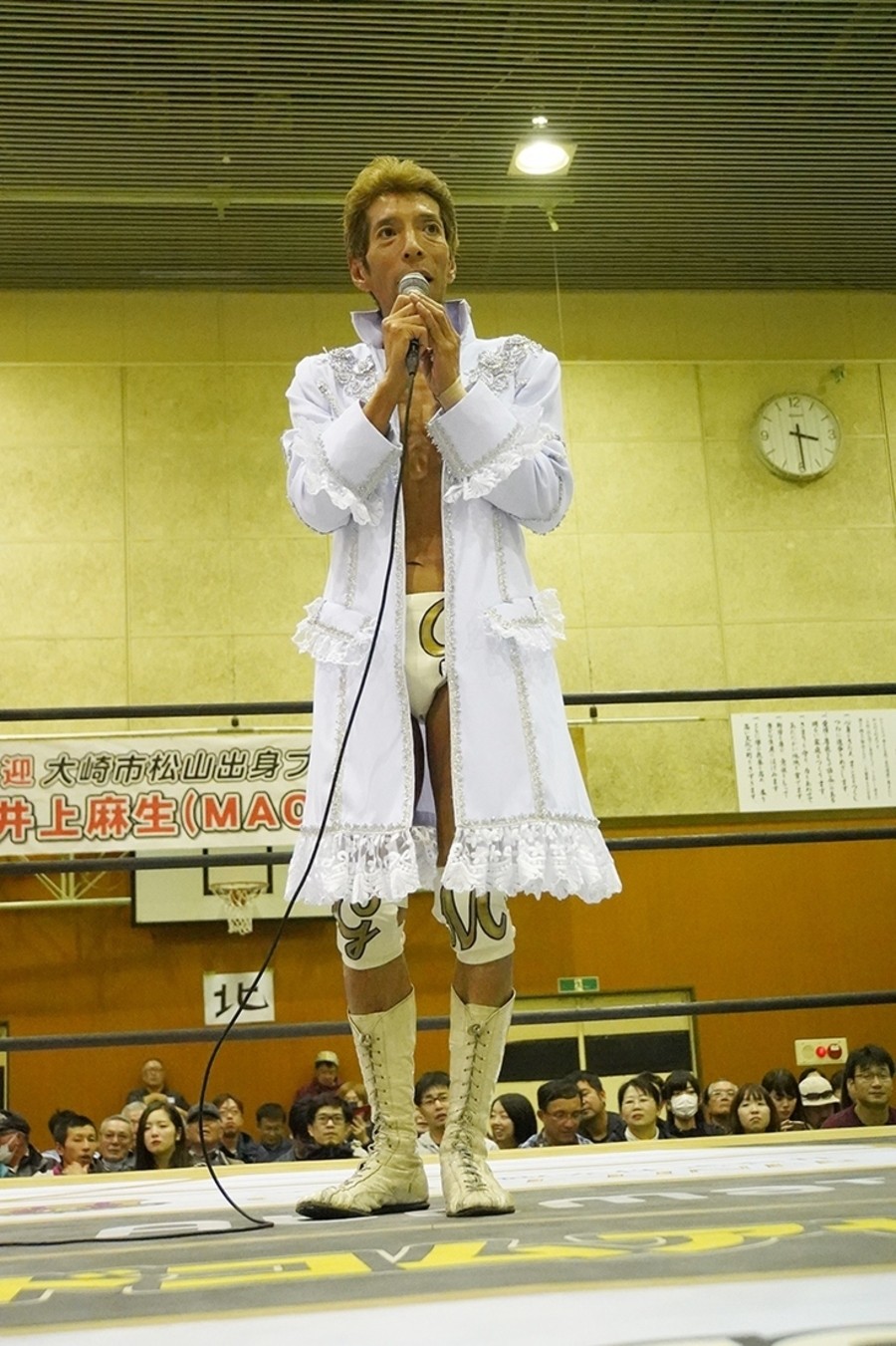 まず今林APと井上リングアナによる前説がスタート。対戦カードと見どころをアナウンスしたあと、本日地元に凱旋となったMAOを呼び込む。リングに上がったMAOは「仙台大会何度かやってまいりまして、今年の5月に大崎大会をやりますと宣言して、11月11日ついに大崎市松山にDDTプロレスがやってまいりましたー! たくさんの方のご協力を得まして、ここまでお客さんも入っていただきまして。きっと盛り上がる大会になると思います」と挨拶すると、大崎市の伊藤康志市長を呼び込む。「ワタシは市長です。プロレスラーではございません。MAOちゃんと試合をするわけではないですが、生のプロレスが観られることを市民を代表して歓迎とお祝いを申し上げます」と挨拶。そしてMAOと一緒にオープニングコールをすると、MAOはリング上から紅白まんじゅうを客席にバラ巻いた。
