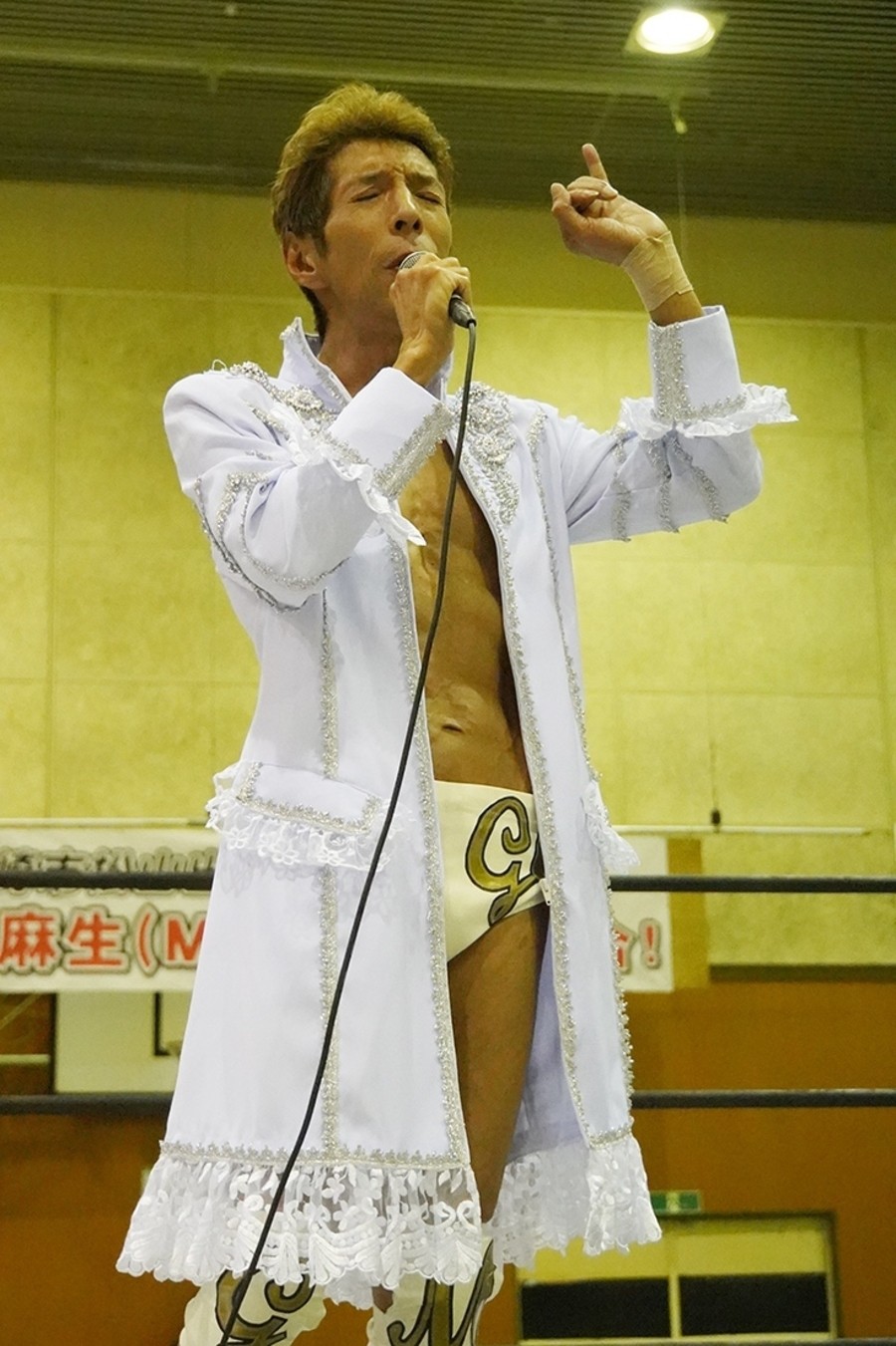 試合コスチュームにガウン姿でリングに上がった松野は、親子ほど年の違うMAOが頑張っているので、自分も頑張ると意気込むと持ち歌の『おまえのバラード』を熱唱。そして「一番尊敬している先輩」だという大崎市松山出身のフランク永井さんの曲である『おまえに』を歌いあげた。最後に「松山、大好きです!」と言うと拍手喝采を浴びた。