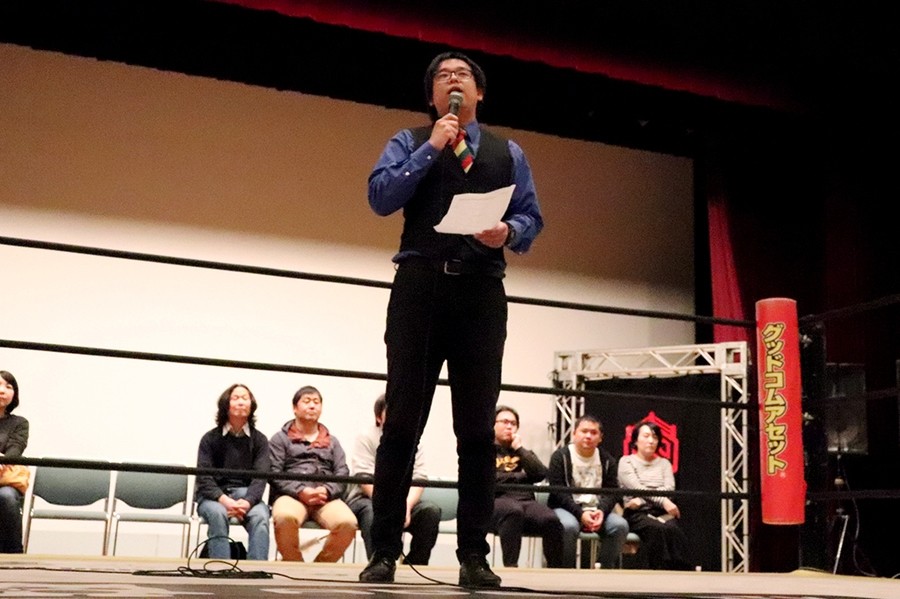 前説に登場したのは井上マイクリングアナのみ。次回の新潟大会に関して2020年5月頃を予定していると発表し、対戦カードと見どころを粛々と読み上げ、オープニングコールに登場した竹下幸之介も何事もない様子で、ササダンゴからもらった本『さあ才能に目覚めよう<ストレングスファインダー>』でテストをしてその結果をLINEで送ってしまったということで「坂井さんは僕の長所をわかって闘うことになってしまう。うっかりしてたなと。だからワンチャンで僕、負けるかもしれないです」と明かすも「新潟の英雄をボコボコにします」と誓って「DDT新潟大会スタート!」と拳を突き上げる。『GET READY』が流れた直後、場内が暗転。ピンスポが当たるとそこには白髪となった今林APが。「今からおじいちゃんが話すのは、おじいちゃんが昔、DDTプロレスというプロレス団体でアシスタントプロデューサーをやってた時のお話じゃよ」と言うと場内暗転。