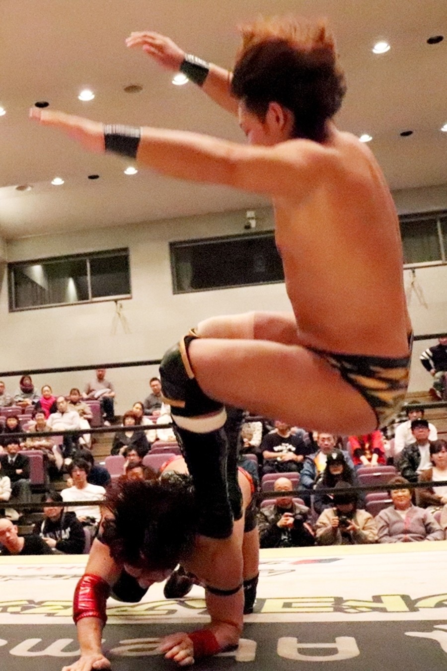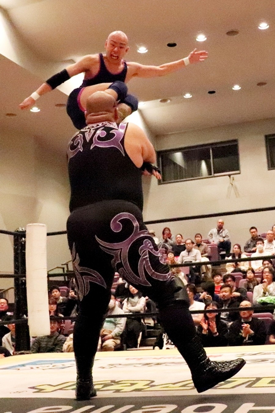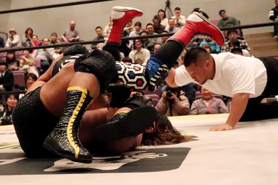 そして何事もなかったように第1試合がスタート。ポーリーのパワーの前に圧倒される中村。ボディースラムからのエルボードロップはカウント2。中村がエルボーでなんとかポーリーの動きを止めると、ドロップキック連打からミサイルキックを発射。しかしカウント2止まり。ドロップキック連打もショルダーアタックで返された中村。低空ドロップキックから逆片エビに持ち込むがパワーで返されてしまう。最後は串刺しラリアットからボディープレスで万事休す。