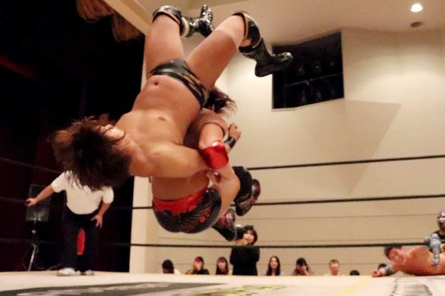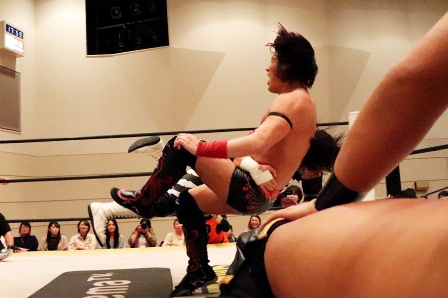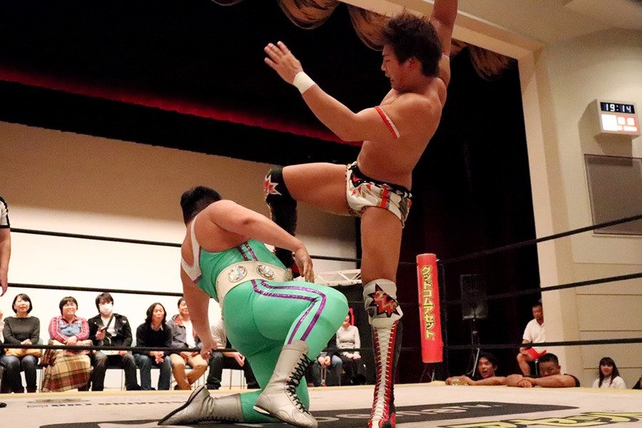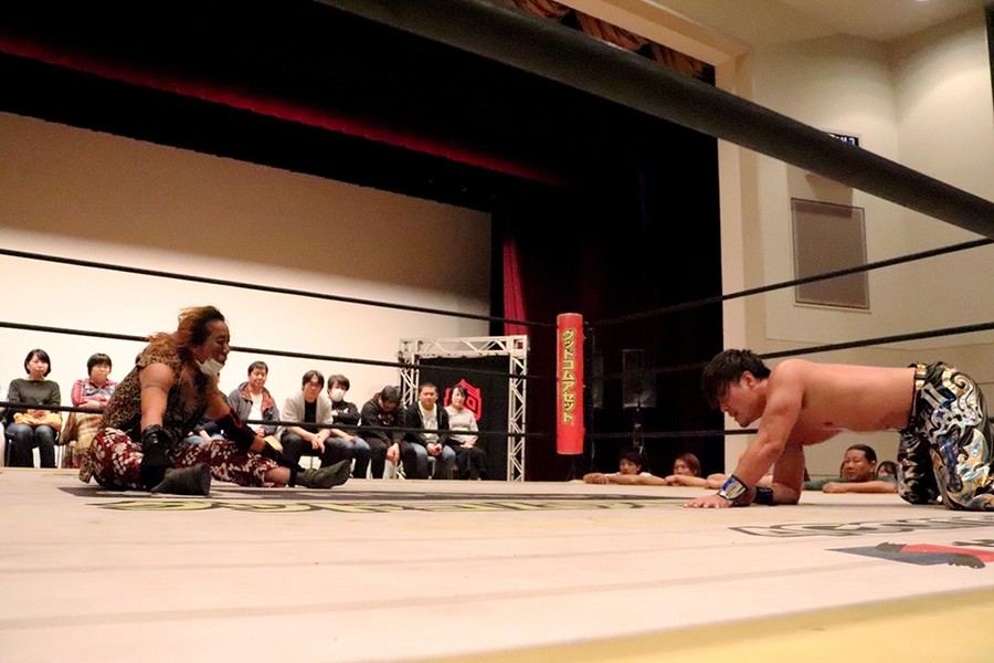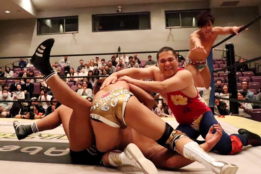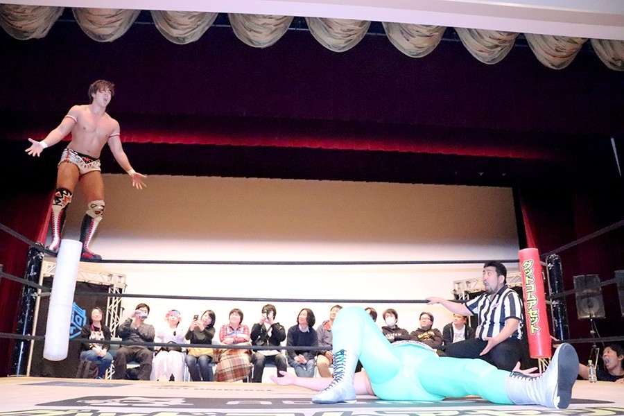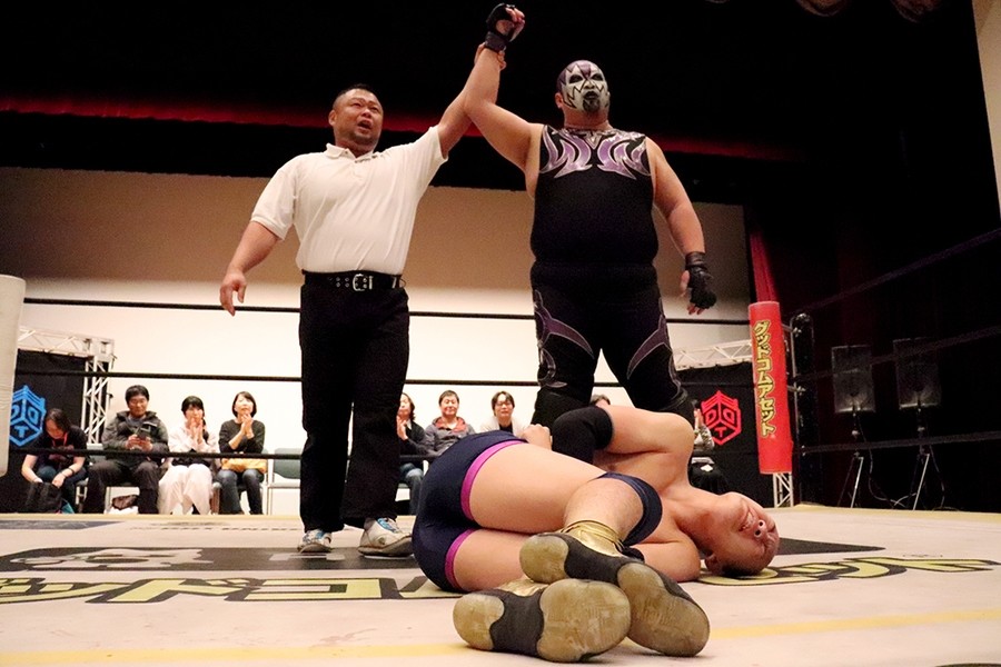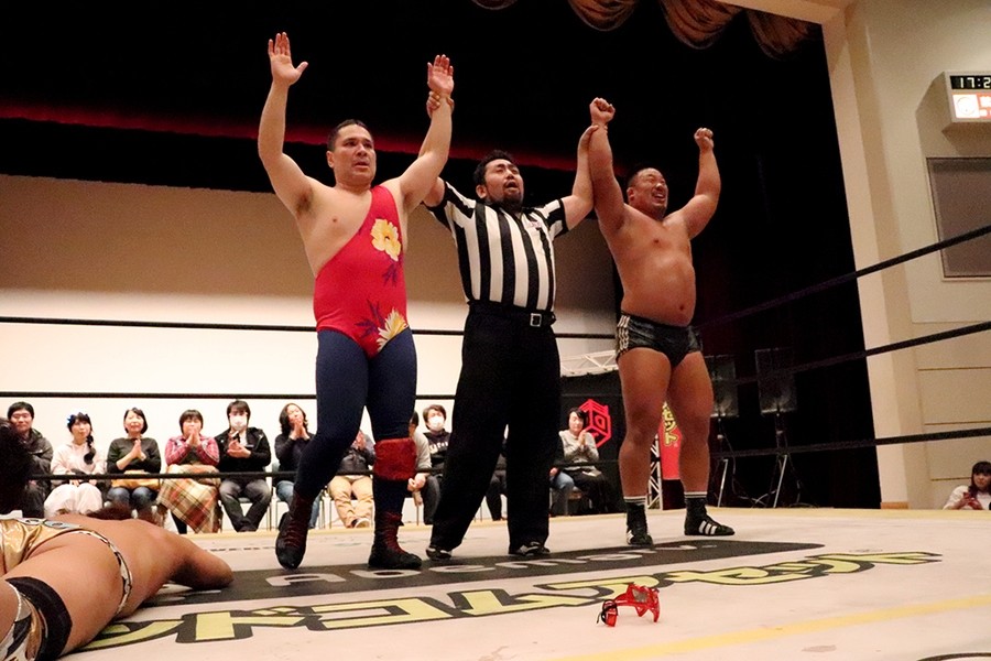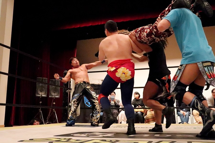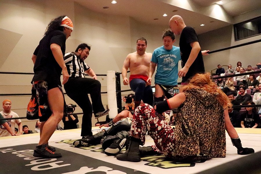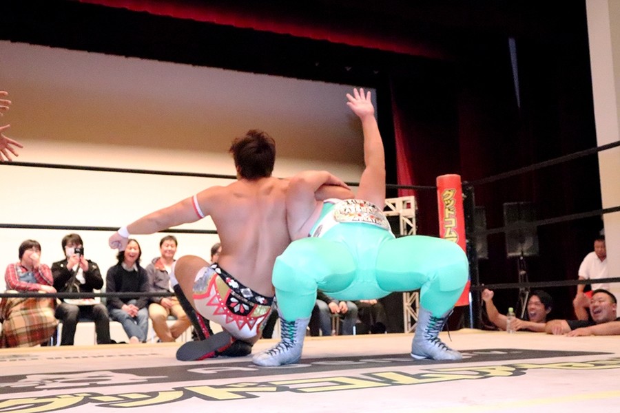 平田のダンス入場をアントンと飯野が潰して試合スタート。飯野とアントンがさっそくハカエルボーもアントンが躓いてヒザを強打しギブアップ寸前に。ギブアップする前に語った創作昔話『ごんぎつね』は内容がヒカキンの本当の意味だったが下ネタだったばかりか、サミングは飯野、さらに自身に被弾。こうしてアントンがローンバトルを強いられる結果に。アントンはボディーブローを見舞ってようやく飯野とタッチ。飯野が一気呵成の攻め。上野は飯野にフランケンからおっぴろげアタック。裏投げは飯野が踏ん張る。飯野がチョップもスピアはドロップキックで迎撃されてしまう。替わった平田が上野と連係。カットに入ったアントンが上野にごんぎつね。飯野が平田を捕まえるも、アントンのごんぎつねはかわされて飯野の両乳首をついばむ。平田がアントン、飯野を手刀で黙らせてメガネを装着してダンスも、その背後からメガネをかけた飯野がハカで対抗。平田にボディースラムからハカエルボーで3カウント。