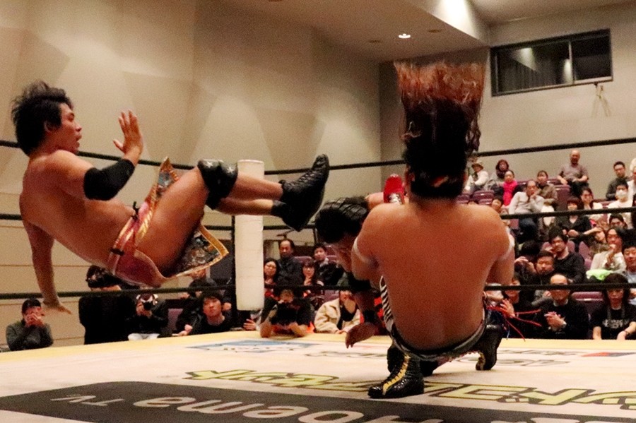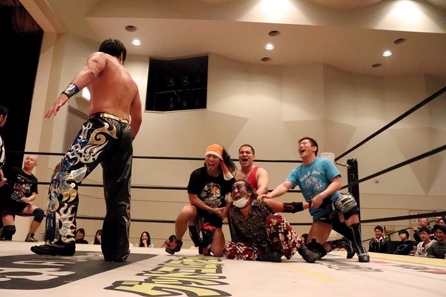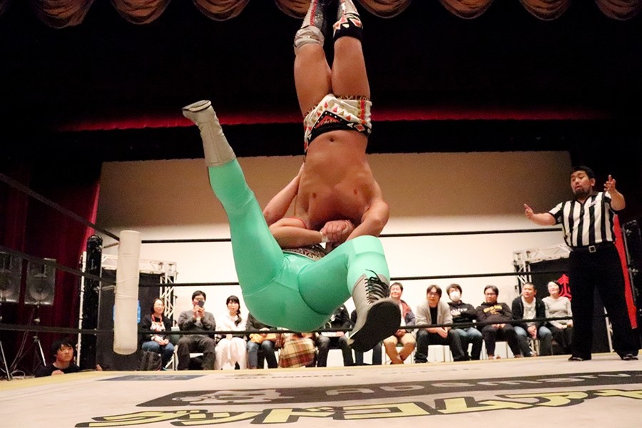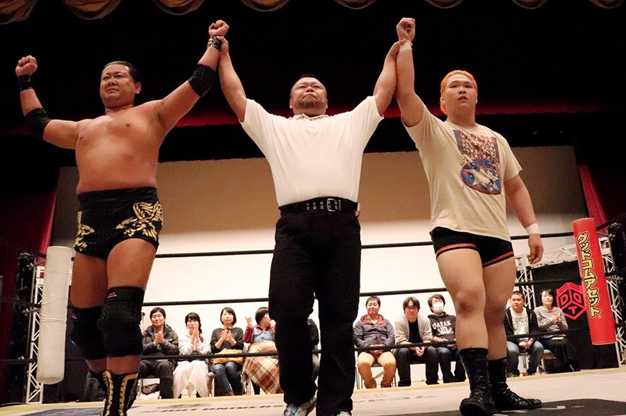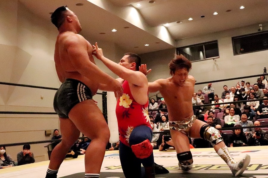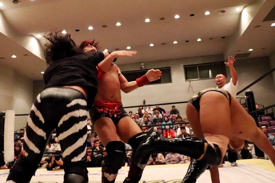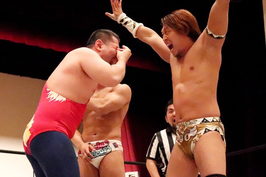 試合前に大鷲がマイクを取って自身のみ紙テープが飛んで気分がいいとのことで、新潟名物のルチャリブレルールに変更を要求。彰人も勝俣も腕で「×」を見せたが、井上リングアナから「吉村選手の強い要望により」ルチャリブレルールに変更されたことが告げられて試合スタート。吉村が彰人と勝俣の連係をクロスボディーで潰すと、大鷲が勝俣を捕まえて逆水平で続く。さらに大鷲が勝俣に握手の返しが面白いと誘い水。内容は割愛。その後もローンバトルを強いられる勝俣だったが、吉村にコルバタからドロップキックを決めてようやくピンチを脱出。彰人が吉村に側転エルボーから腕固め。モンキーフリップは吉村が堪えて逆エビへ。これは勝俣がカット。彰人が大鷲に俵返し。大鷲は連係を試みる彰人と勝俣をまとめて投げる。彰人が大鷲、カットに入った吉村と次々に丸め込む。吉村が返してギロチンドロップ。すかさずカサドーラを狙う勝俣に吉村がどどんで叩きつけたところを大鷲が丸め込んで3カウント。