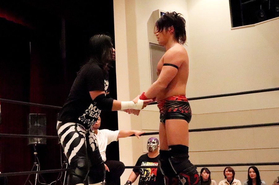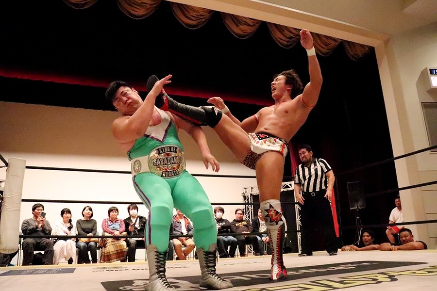 ササダンゴ 正直、竹下が両国でベルトを防衛していたらこの試合がタイトルマッチになっていたことも無きにしも非ずだったんですね。でも現に竹下のほうがノビノビというか、チャンピオン時代とは違う竹下だったのかなと。僕が思っている以上というか、マッスル坂井をやっていた頃から一緒にやっていた仲間のような、良くも悪くも……なんでしょうね。不思議な感じです。なんであそこまで変に対応されてしまったというか、助けられるような場面が多かったというか、不思議な感じです。ただ負けた以上の何かを感じました。