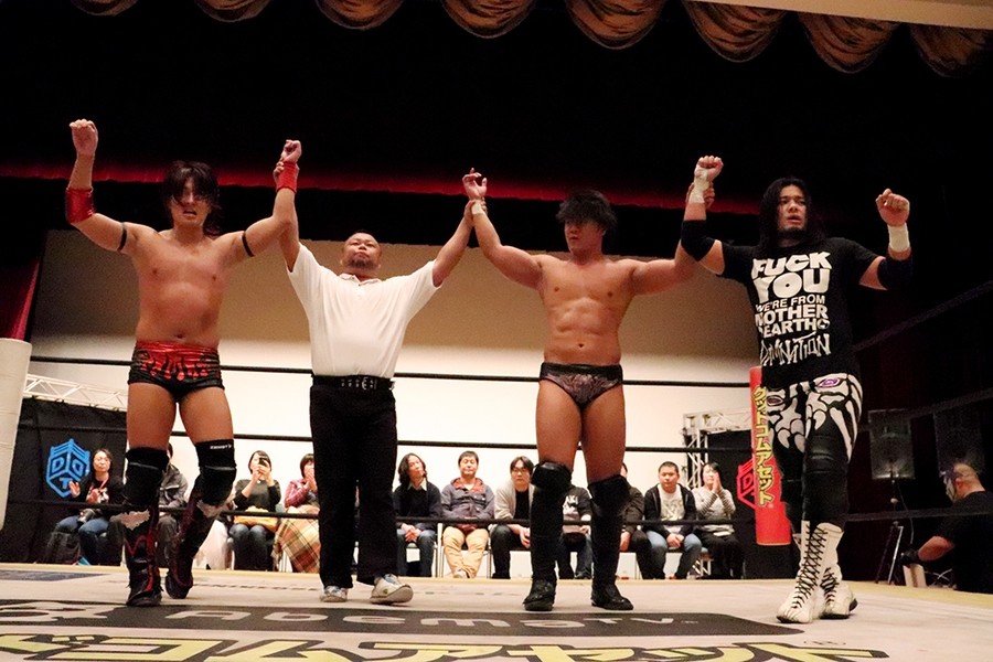 大石が佐々木にスイングDDT狙い。これを遠藤がリング下に突き落としてから場外戦。5分経過、リングに戻された大石がDAMNATIONのラフファイトに捕まってしまう。大石は遠藤をボディースラムで叩きつけてようやくピンチを脱出。タッチを受けた高梨が遠藤に正面飛びドロップキック。遠藤もダブルチョップを放つと、佐々木が出てきて「ササタニック!」。これをかわした高梨がタカタニックを狙うも佐々木が回避。佐々木のケブラドーラ・コンヒーロを切り返した高梨がクロスフェース。佐々木もクロスフェースで切り返すがカット。替わった高尾を高梨がブレーンバスターで投げて渡瀬とタッチ。高尾と渡瀬がバックの取り合い。加勢せんと飛び込んできた佐々木のダイビング・エルボーが高尾に誤爆して不穏な空気。介入した高梨への佐々木のスピアもかわされて高尾に命中してしまう。大ピンチの高尾だったが、渡瀬にみちドラⅡを決めて大逆転。さらにリバースゴリースペシャルボムを決めて勝利したが……。