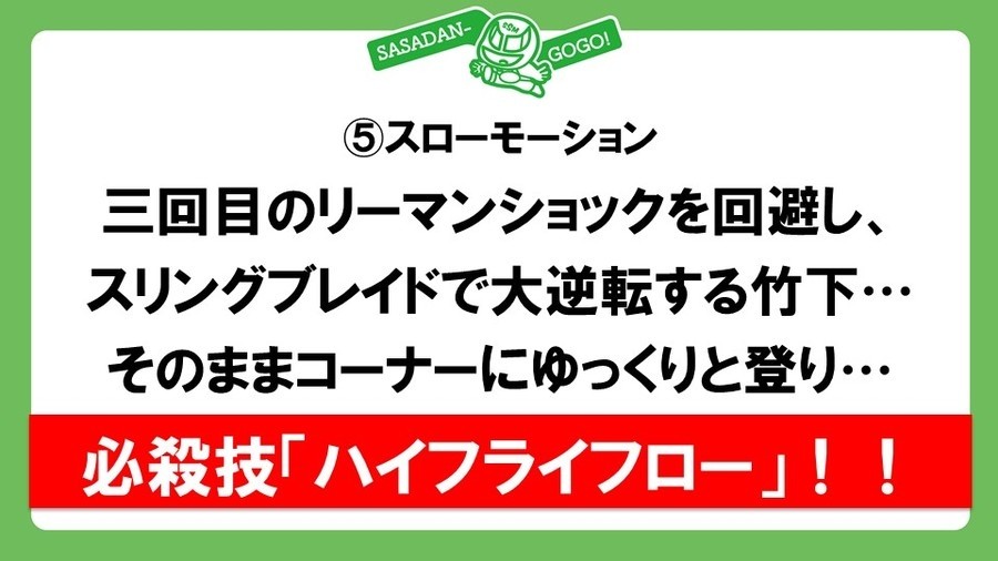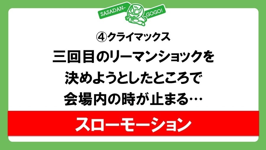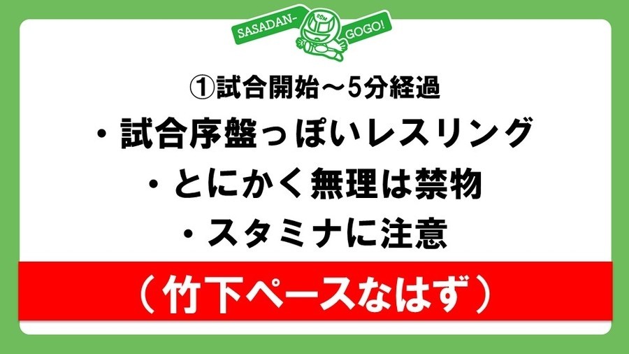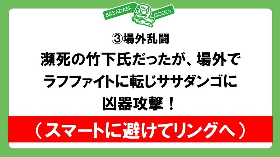 試合前に井上リングアナから両者が4点ポジションからの頭部への攻撃と試合開始5分後の煽りパワーポイントによるプレゼンテーションを認めたため、それ相応に自由度のあるプロレスルールでおこなわれることがアナウンスされ、ササダンゴのPCにつないだ投影機がリング内に持ち込まれる。ササダンゴ、竹下と入場して煽りパワポへ。竹下にどうしても勝ちたいササダンゴだが、絶対に勝てない相手であり、体重も130kg弱でスタミナ不足を露呈し、さらに凱旋試合で頑張ることが超苦手。そこで不安であろう竹下にこれから述べる作戦を偶然聞いてしまったていにしてしまうことに。①試合開始~5分経過は序盤っぽいレスリング。竹下ペースになるので、②5分が経過したらササダンゴコールを観客に要請。ここで逆転してササダンゴが一度やってみたかったというエプロンからの奈落式の技。③瀕死の竹下が場外でラフファイトに転じてササダンゴに凶器攻撃へ。それをスマートに避けてリングに戻ると説明したところで5分経過のアナウンス。観客も思わず声援を送ってしまったが、パワポの途中とあって、竹下は「①を削ってしまって、プレゼンテーション終わりですぐに劣勢にします」とキッパリ。煽りパワポへ。④ラリアットの打ち合いからササダンゴが打ち勝って垂直落下式リーマンショックが2回決まり、3回目を狙ったところでスローモーション。竹下の回想シーンから竹下が3回目のリーマンショックをかわしてスリングブレイドからハイフライフローを投下し、竹下が完全勝利するという流れでおこなうとササダンゴが披露して煽りパワポは終了