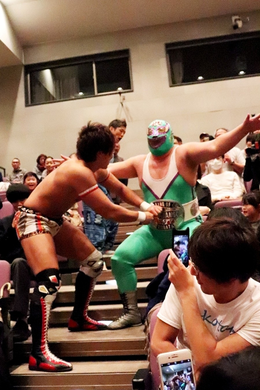 ニラはアントン、高梨、大石の騎馬に中村を率いてリングイン。さらにはリングにあげられた練習生までコールされてしまう。で、王者は一人きりで入場し、アントン、高梨、大石、中村が一生懸命ブーイングを送る。ここで井上リングアナから以下のアナウンスが。