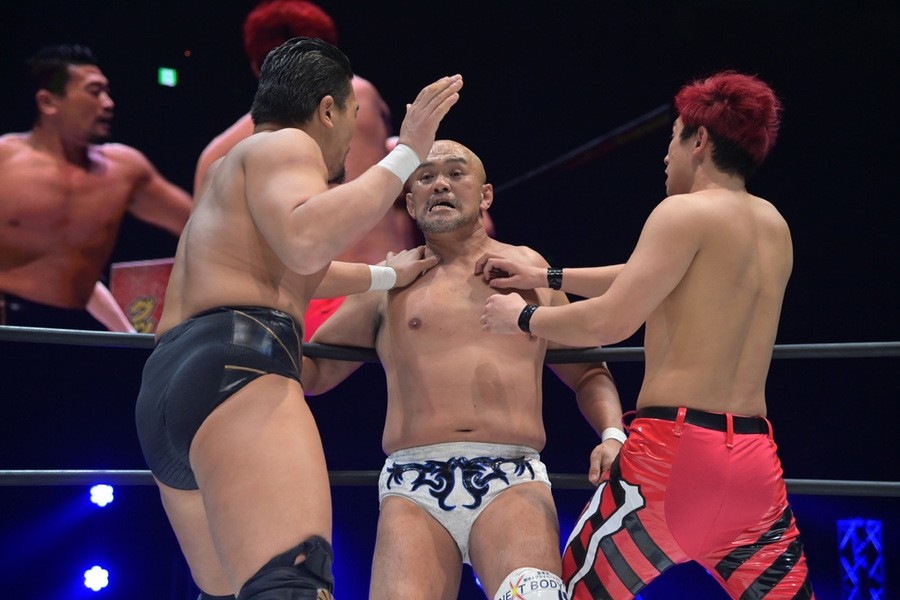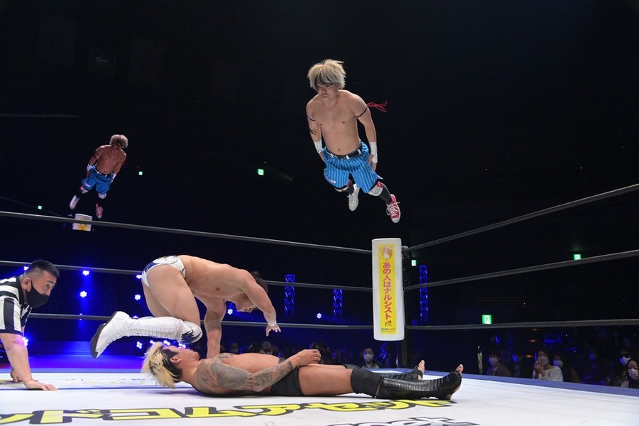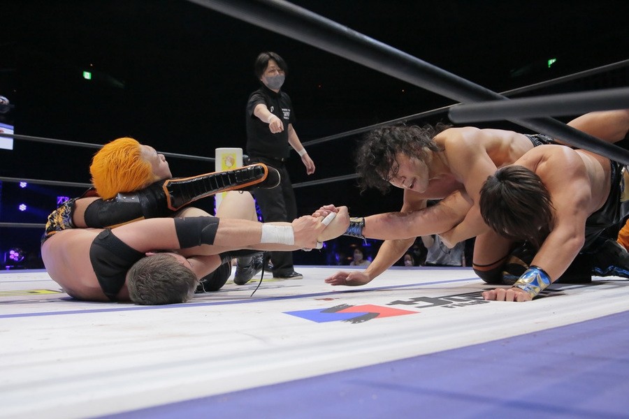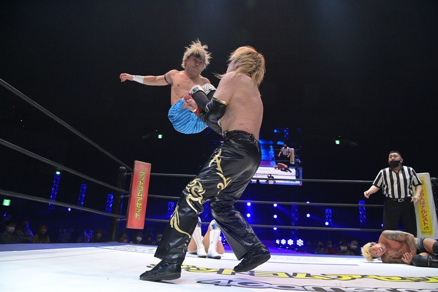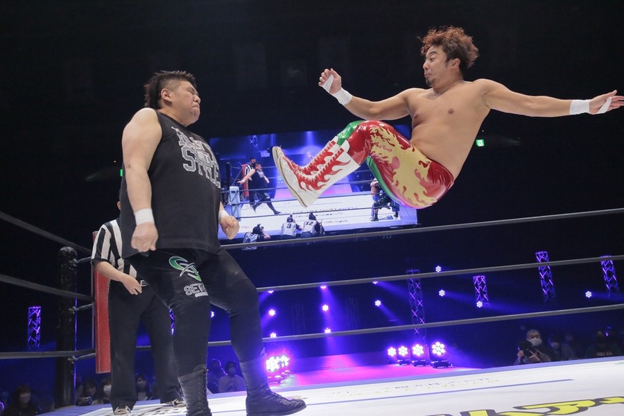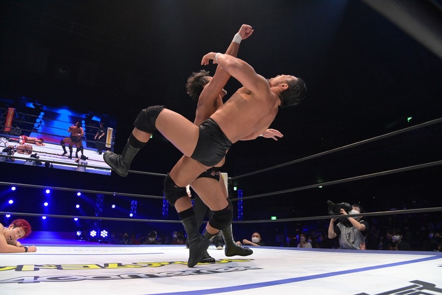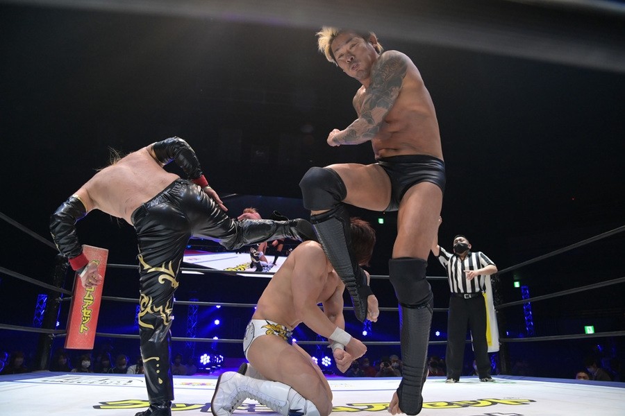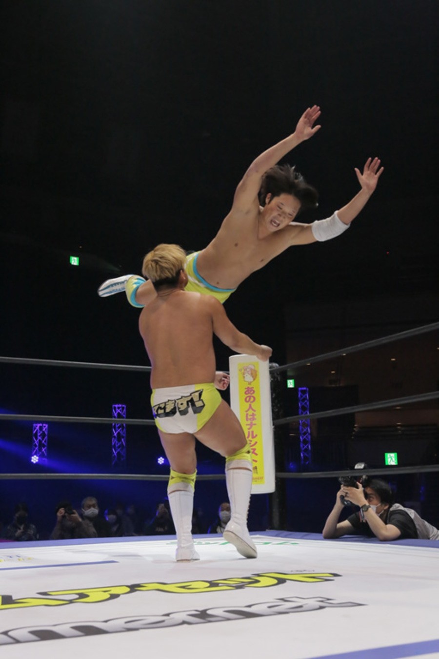 セミファイナルでクリス・ブルックス&高梨将弘のCDKがHARASHIMA&吉村直巳組を下し、KO-Dタッグ王座を奪取。新王者組は4月10日、東京・後楽園ホールで、この日の「時間差入場タッグバトルロイヤル(6チーム参加)」を制した火野裕士&納谷幸男組の挑戦を受けることが決まった。